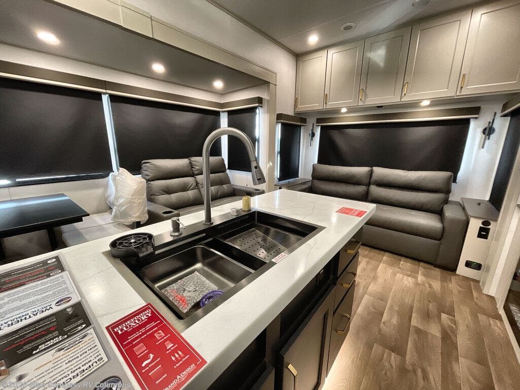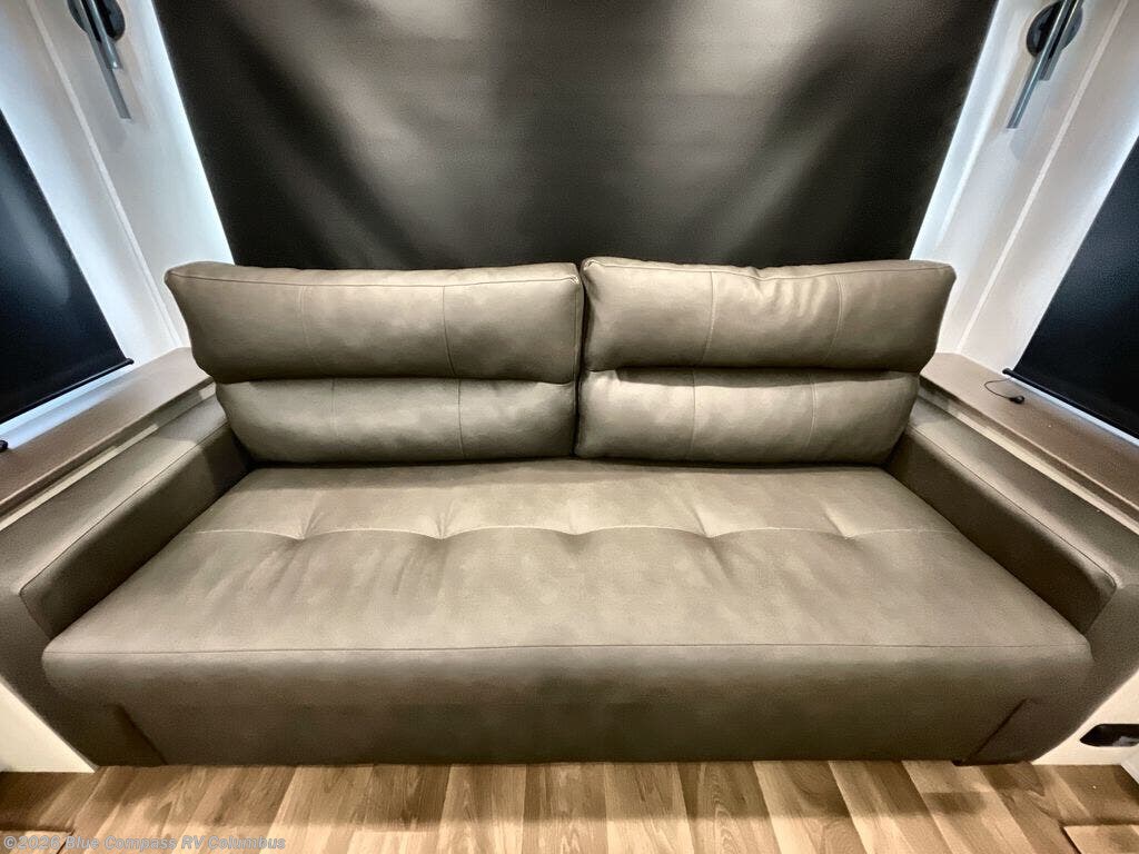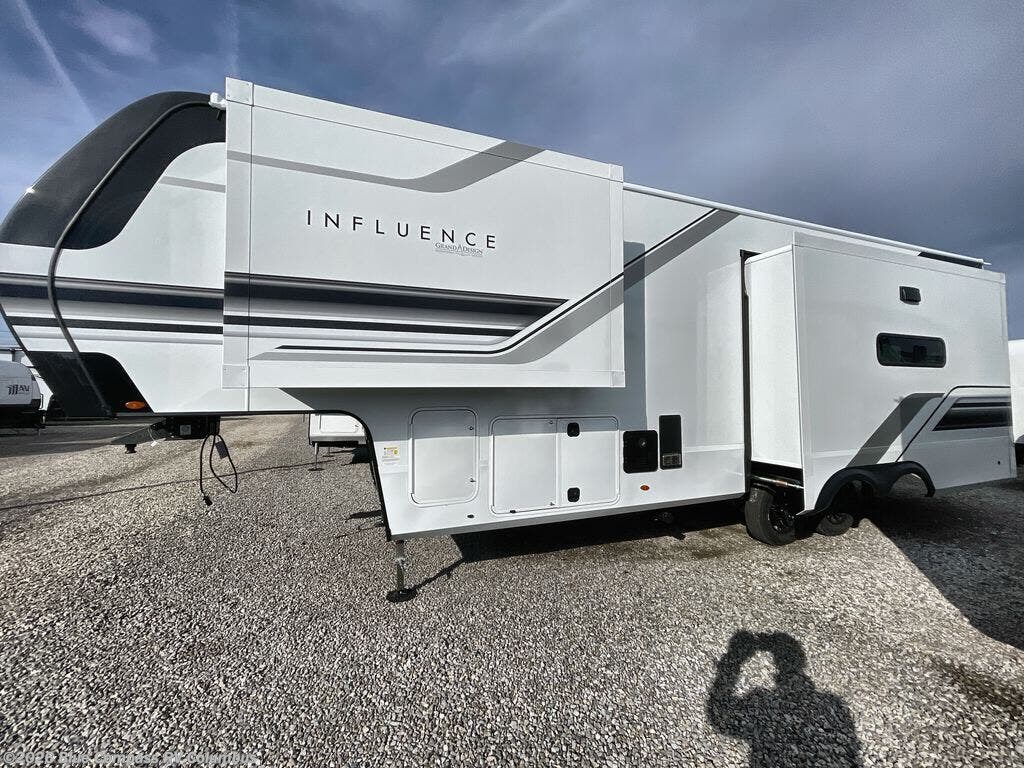 Any Grand Design Influence fifth wheel features five-sided aluminum cage construction with a walk-on roof and a fully enclosed underbelly with heated tanks and storage for all weather camping. For peace of mind, the MORryde CRE3000 Suspension system will provide safe and smooth towing, and the 101" widebody construction offers all the room you need and that is before multiple slides are fully engaged. You will appreciate the Keyed-Alike locks, slam-latch baggage doors with magnetic door catches, exterior security light, and SolidStep entry steps. On the inside, Congoleum flooring, premium roller shades for privacy, a hallway handrail for safety, and nightstands with USB ports to keep all of your electronics fully charged. You will also love the on demand tankless water heater when showering, plus the added heat and ambiance from an electric fireplace, and so much more!
