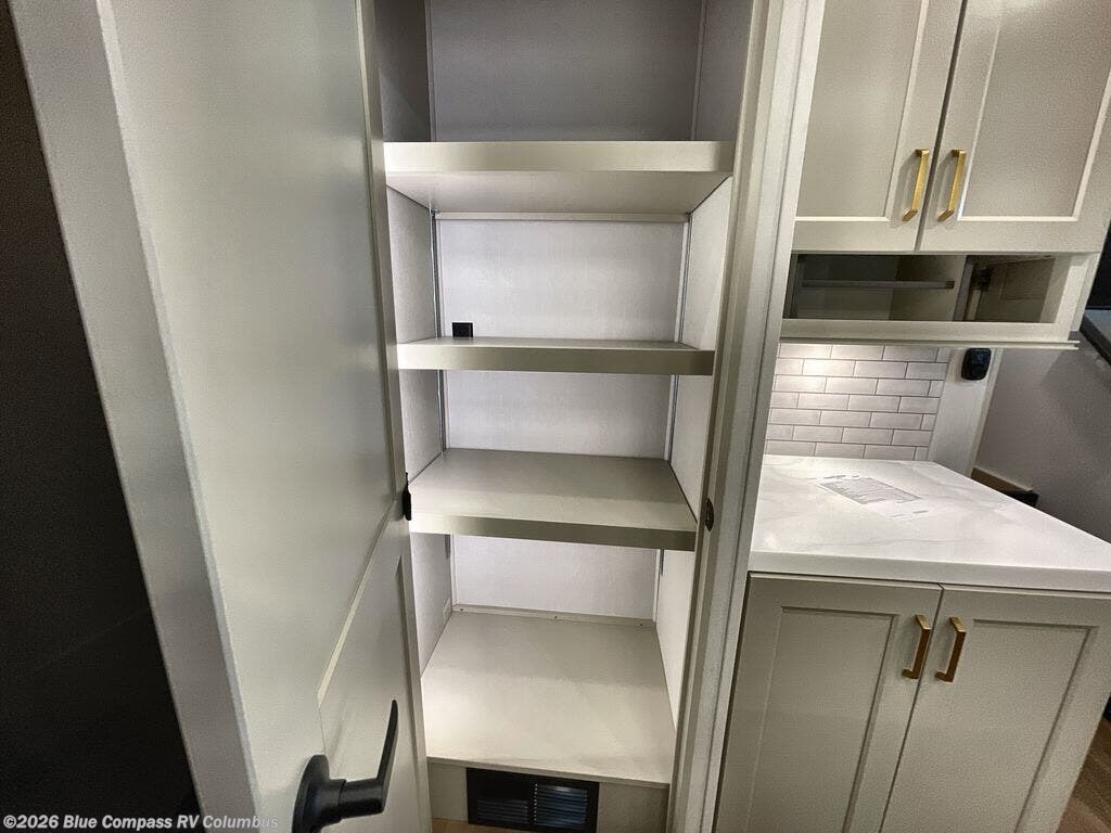 You'll feel right at home in this spacious fifth wheel with triple slides, a front master bedroom, and a kitchen island with extra counter space. The theatre seating is right across from the entertainment center which includes a 40" TV and fireplace, and there is a rear tri-fold sofa if you have any guests staying over. This model includes a hutch in the kitchen with cabinets above to store you nice dishes, plus there is a large pantry with washer and dryer prep if you plan to go full-time. Head to the dual entry bath that includes a linen closet and a spacious shower, and check out the front master bedroom with its queen bed, and slide out wardrobe. You can choose the optional king bed if you enjoy a bit more room in bed!