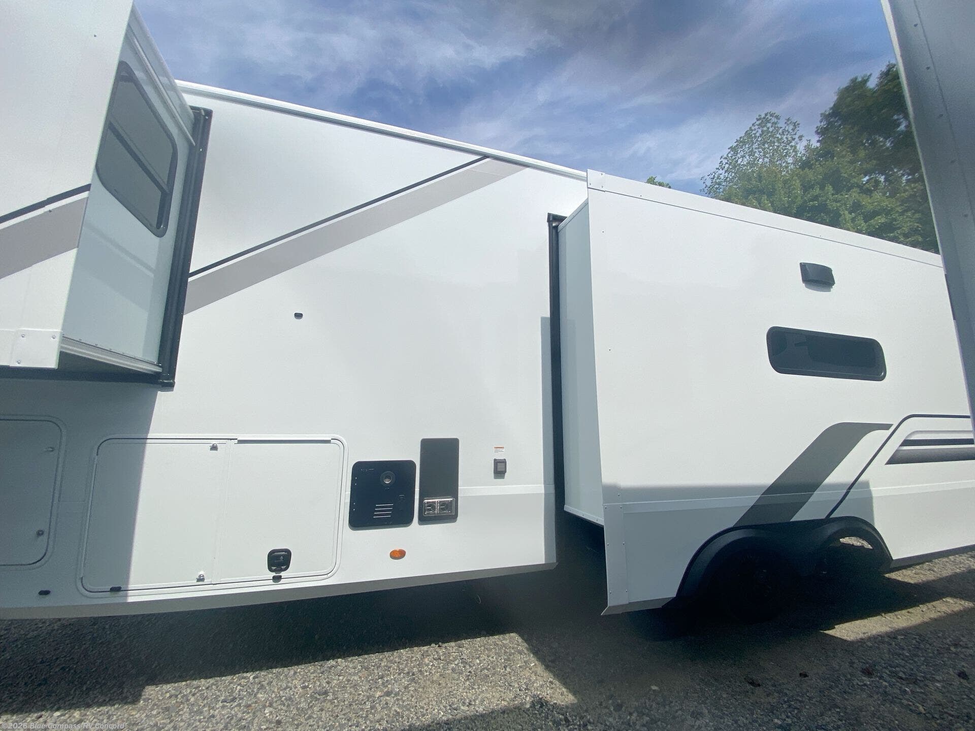 A perfect fifth wheel featuring triple slides and a tri-fold sofa for overnight guests! You will love the spacious interior thanks to the dual opposing slides in the main living and kitchen area. Here you will find a kitchen island in the center and plenty of seating with a free standing dinette, theater seating for movie night opposite the fireplace and entertainment center, as well as a tri-fold sofa. The kitchen offers all of the amenities just like home, a 16 cu. ft. 12-volt refrigerator for your perishables, and a hutch with an electronics drawer to keep your gadgets organized. There is even a pet dish under the refrigerator for your furry friends. The spacious full bath includes a 48" x 30" shower, dual linen closets, and an accessory drawer for necessities. You'll love the front bedroom with its queen bed slide out, slide top dresser, front wardrobe with washer and dryer prep, plus a pass-thru clothes hamper between the bedroom and bath; how convenient!