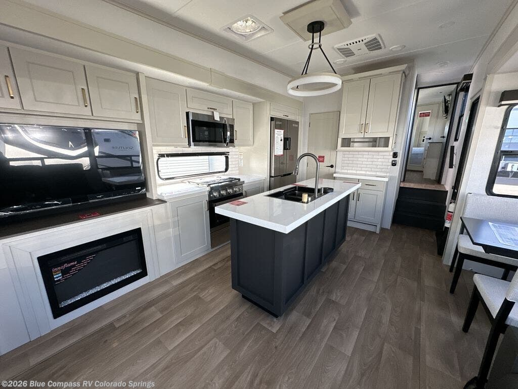 A perfect fifth wheel featuring triple slides and a tri-fold sofa for overnight guests! You will love the spacious interior thanks to the dual opposing slides in the main living and kitchen area. Here you will find a kitchen island in the center and plenty of seating with a free standing dinette, theater seating for movie night opposite the fireplace and entertainment center, as well as a tri-fold sofa. The kitchen offers all of the amenities just like home, a 16 cu. ft. 12-volt refrigerator for your perishables, and a hutch with an electronics drawer to keep your gadgets organized. There is even a pet dish under the refrigerator for your furry friends. The spacious full bath includes a 48" x 30" shower, dual linen closets, and an accessory drawer for necessities. You'll love the front bedroom with its queen bed slide out, slide top dresser, front wardrobe with washer and dryer prep, plus a pass-thru clothes hamper between the bedroom and bath; how convenient!