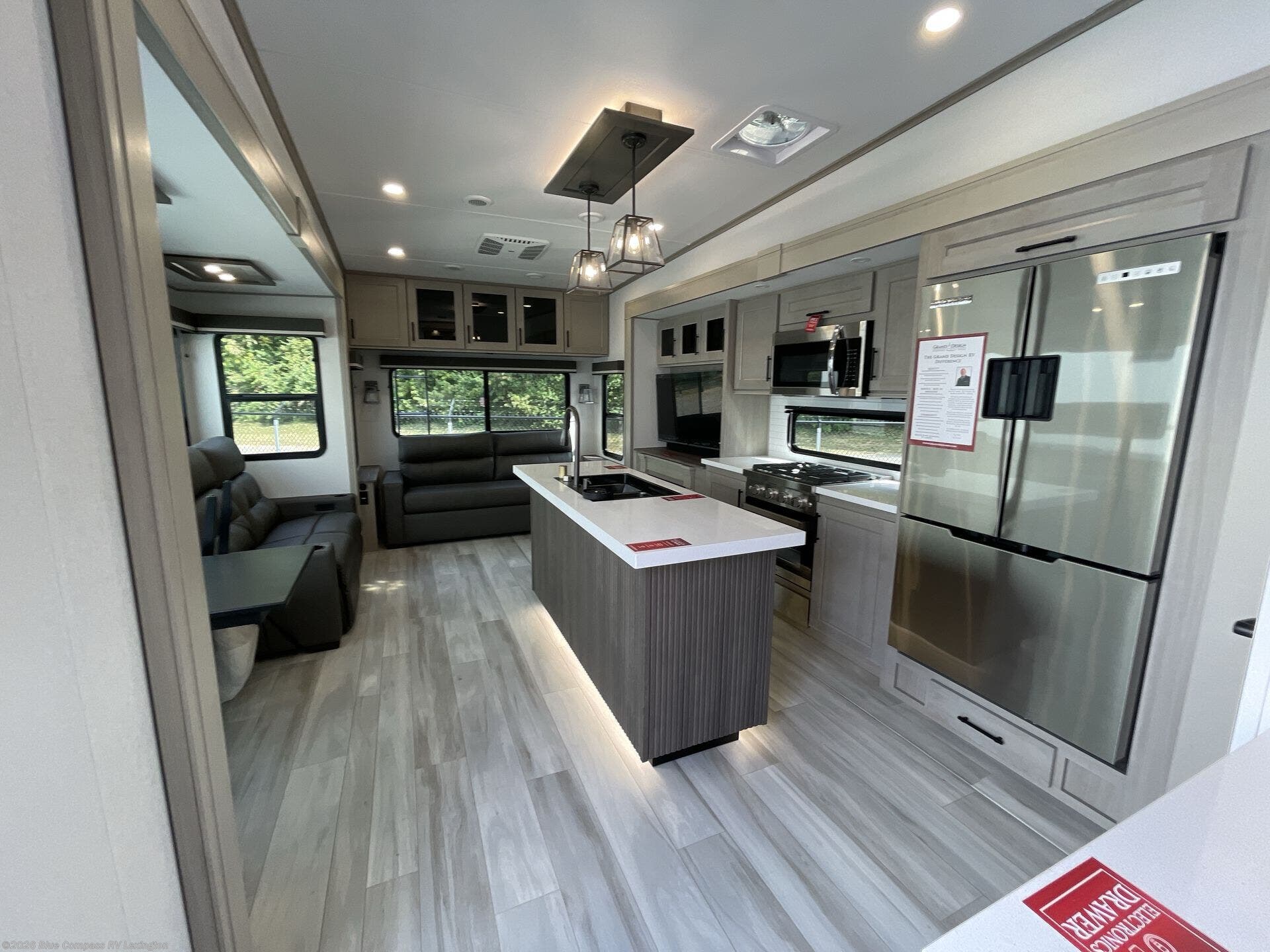 Any Grand Design Influence fifth wheel features five-sided aluminum cage construction with a walk-on roof and a fully enclosed underbelly with heated tanks and storage for all weather camping. For peace of mind, the MORryde CRE3000 Suspension system will provide safe and smooth towing, and the 101" widebody construction offers all the room you need and that is before multiple slides are fully engaged. You will appreciate the Keyed-Alike locks, slam-latch baggage doors with magnetic door catches, exterior security light, and SolidStep entry steps. On the inside, Congoleum flooring, premium roller shades for privacy, a hallway handrail for safety, and nightstands with USB ports to keep all of your electronics fully charged. You will also love the On Demand tankless water heater when showering, plus the added heat and ambiance from an electric fireplace, and so much more!