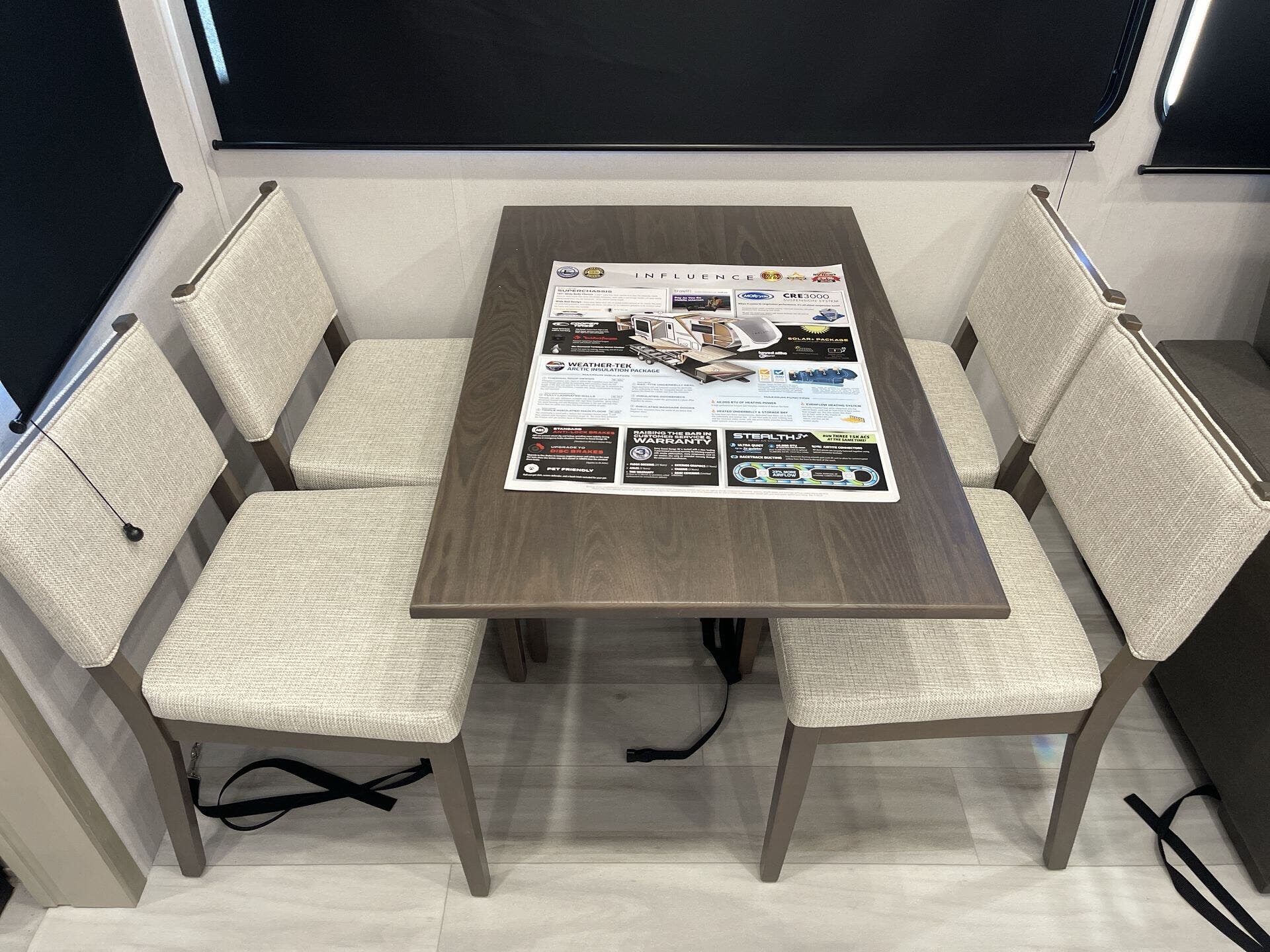 The Influence fifth wheel is engineered with comfort in mind, offering spacious living areas that accommodate families or groups comfortably. Inside, you'll find high-quality finishes and modern amenities, including an island kitchen with a stove top burner, oven, microwave, and refrigerator, all designed to make cooking on the road a breeze. The RV also features a bath & 1/2, a cozy queen bed, and versatile seating arrangements like a dinette and table and chairs.