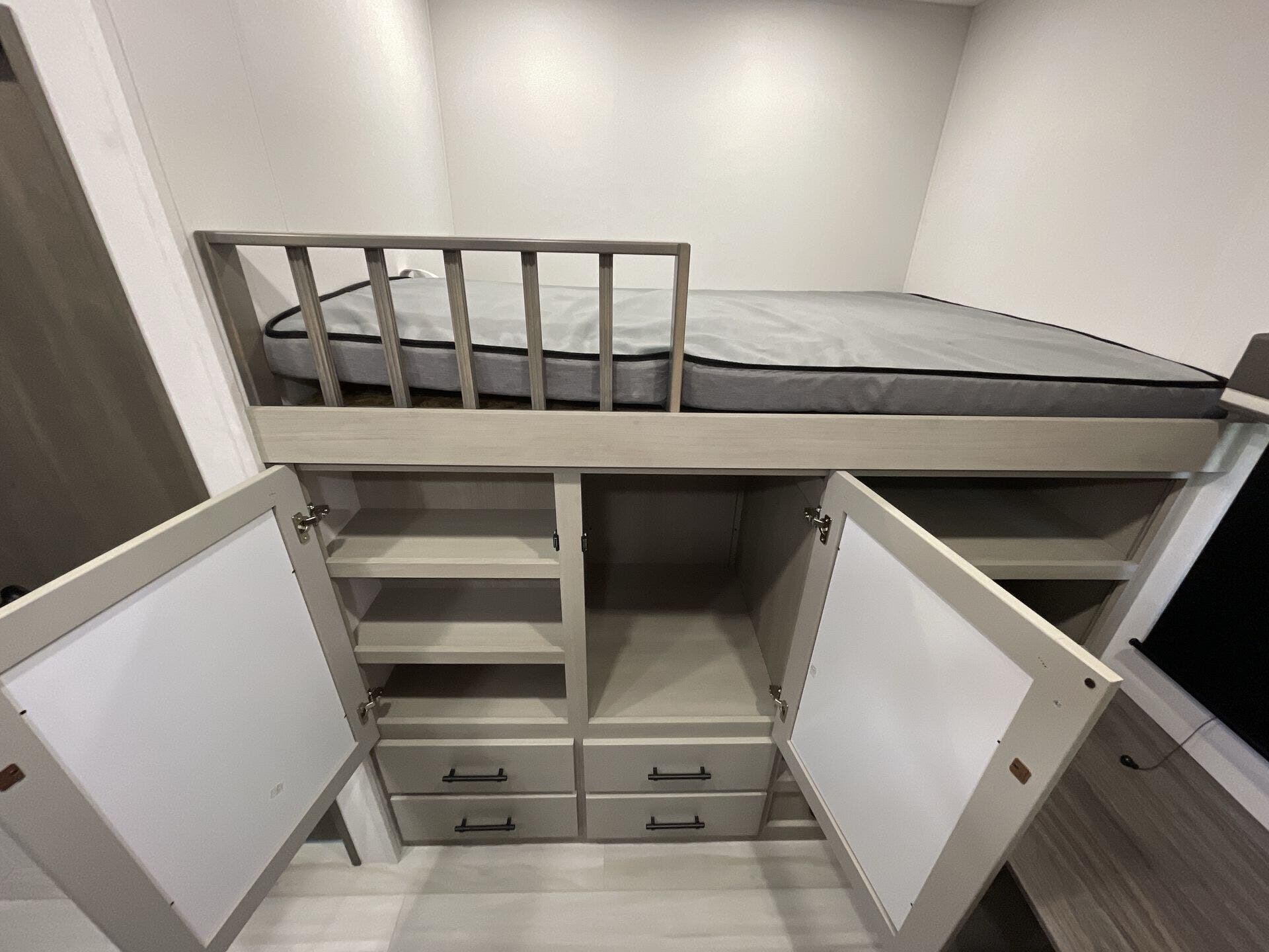 Bath & 1/2, Bunkhouse, Dinette, Island Kitchen, Medicine Cabinet, Overhead Cabinetry, Queen Bed, Table and Chairs, Toilet