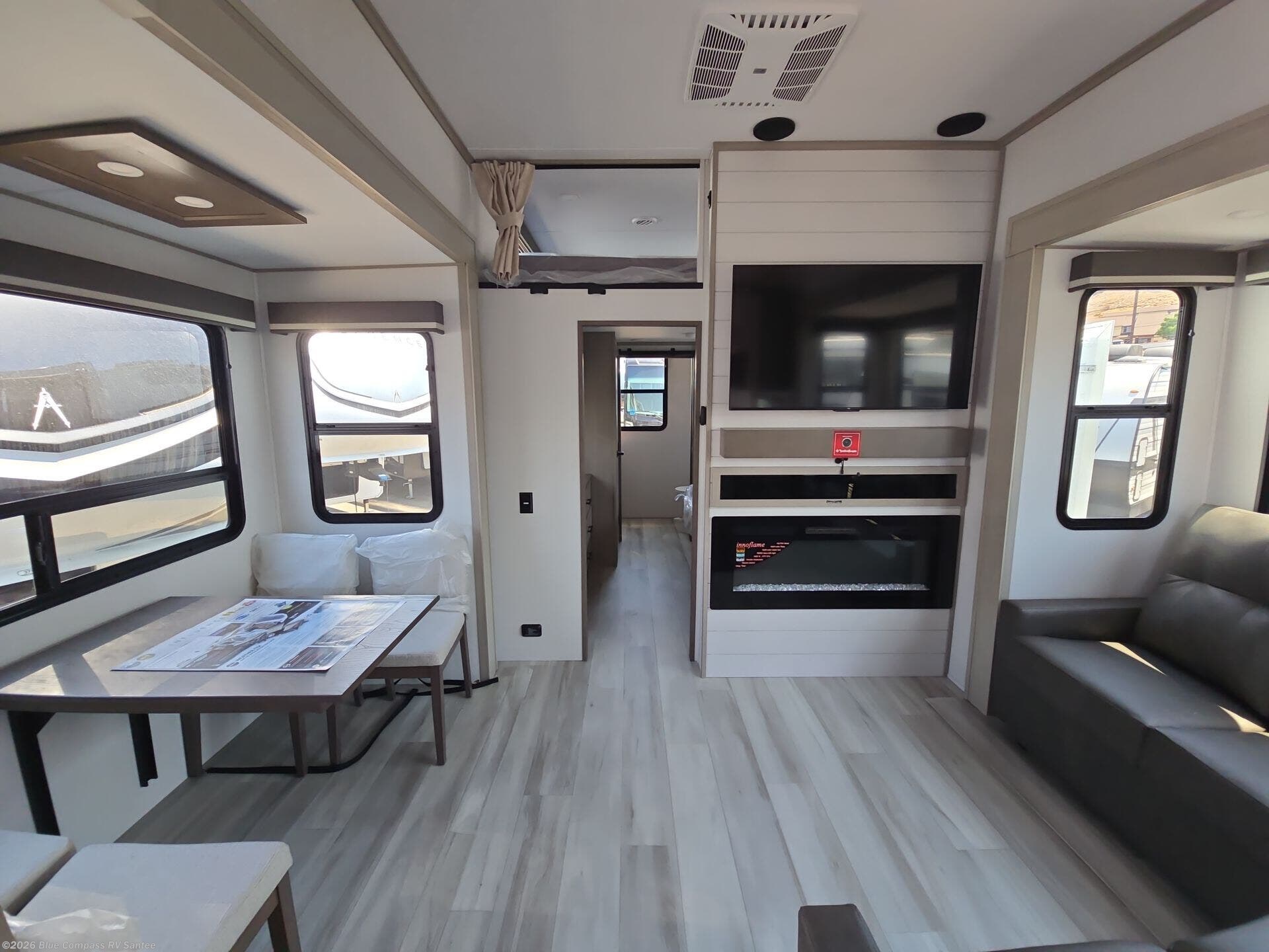Grab the whole gang and head out in this fifth wheel featuring two private bedrooms, two full baths, and quad slides for even more space in this widebody layout. The living area featuring dual opposing slides offers space to dine and relax including an L-shaped sofa with recliners opposite the entertainment center and fireplace. You'll also love the full kitchen with ample counter space, a spice rack above the microwave, a pull-out pet dish, and more convenient features. The front master bedroom includes a queen bed with an optional king bed, a private entrance into the dual entry bath, plus a slide out with the wardrobe and bath sink. And your guests can take the second master bedroom with a folding queen bed slide, washer and dryer prep, a full rear bath, and even a loft above for more sleeping space!