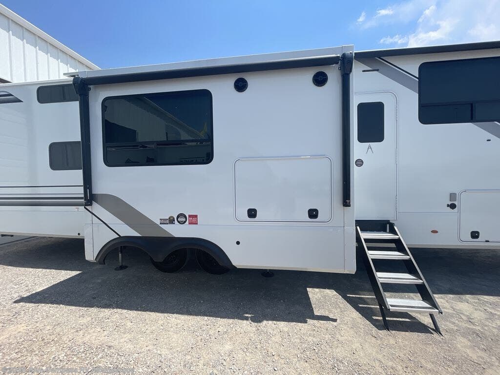 Grab the whole gang and head out in this fifth wheel featuring two private bedrooms, two full baths, and quad slides for even more space in this widebody layout. The living area featuring dual opposing slides offers space to dine and relax including an L-shaped sofa with recliners opposite the entertainment center and fireplace. You'll also love the full kitchen with ample counter space, a spice rack above the microwave, a pull-out pet dish, and more convenient features. The front master bedroom includes a queen bed with an optional king bed, a private entrance into the dual entry bath, plus a slide out with the wardrobe and bath sink. And your guests can take the second master bedroom with a folding queen bed slide, washer and dryer prep, a full rear bath, and even a loft above for more sleeping space!