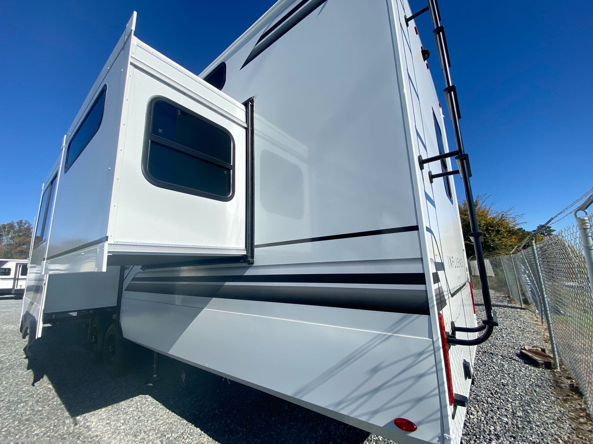 Grab the whole gang and head out in this fifth wheel featuring two private bedrooms, two full baths, and quad slides for even more space in this widebody layout. The living area featuring dual opposing slides offers space to dine and relax including an L-shaped sofa with recliners opposite the entertainment center and fireplace. You'll also love the full kitchen with ample counter space, a spice rack above the microwave, a pull-out pet dish, and more convenient features. The front master bedroom includes a queen bed with an optional king bed, a private entrance into the dual entry bath, plus a slide out with the wardrobe and bath sink. And your guests can take the second master bedroom with a folding queen bed slide, washer and dryer prep, a full rear bath, and even a loft above for more sleeping space!