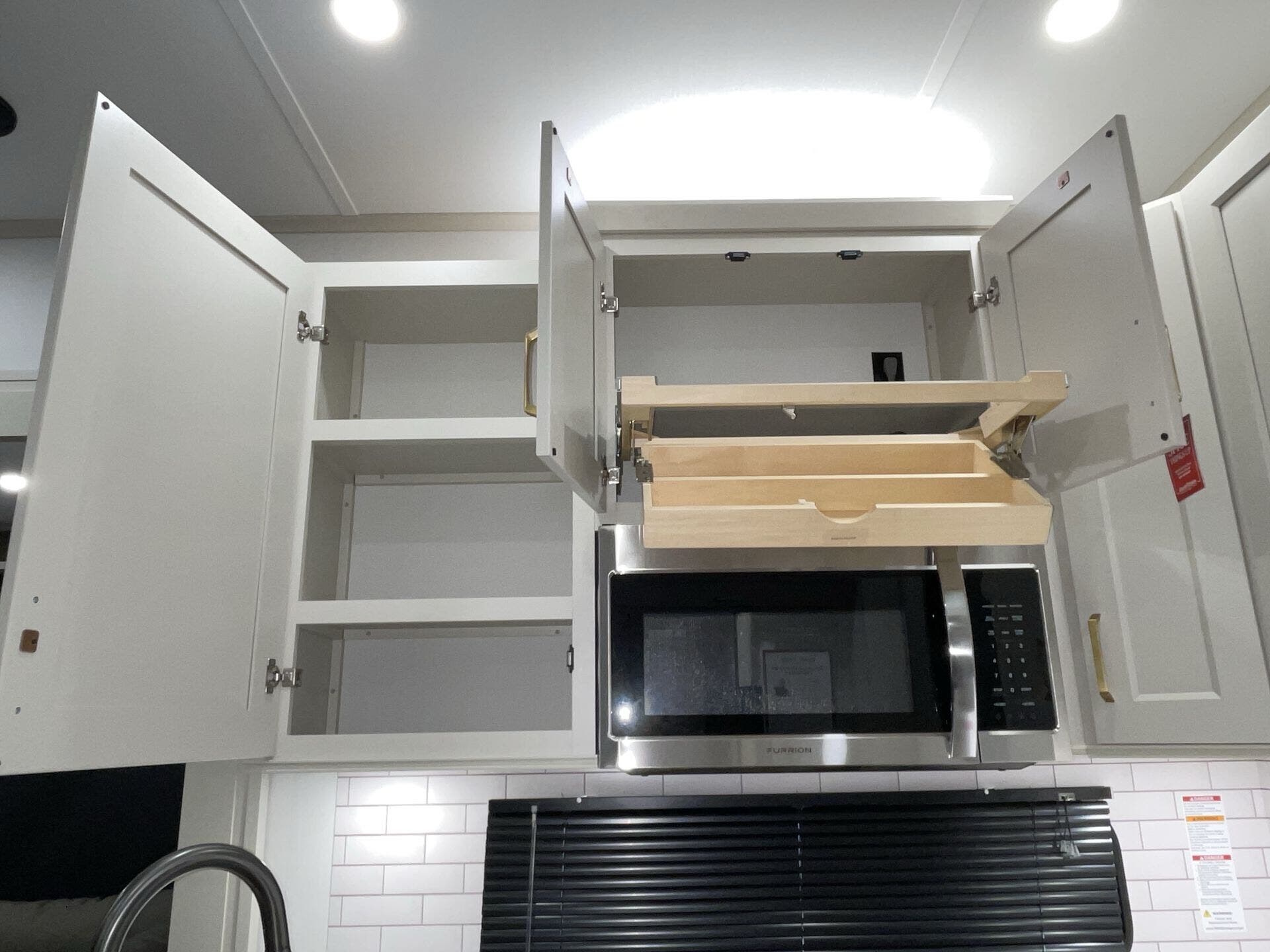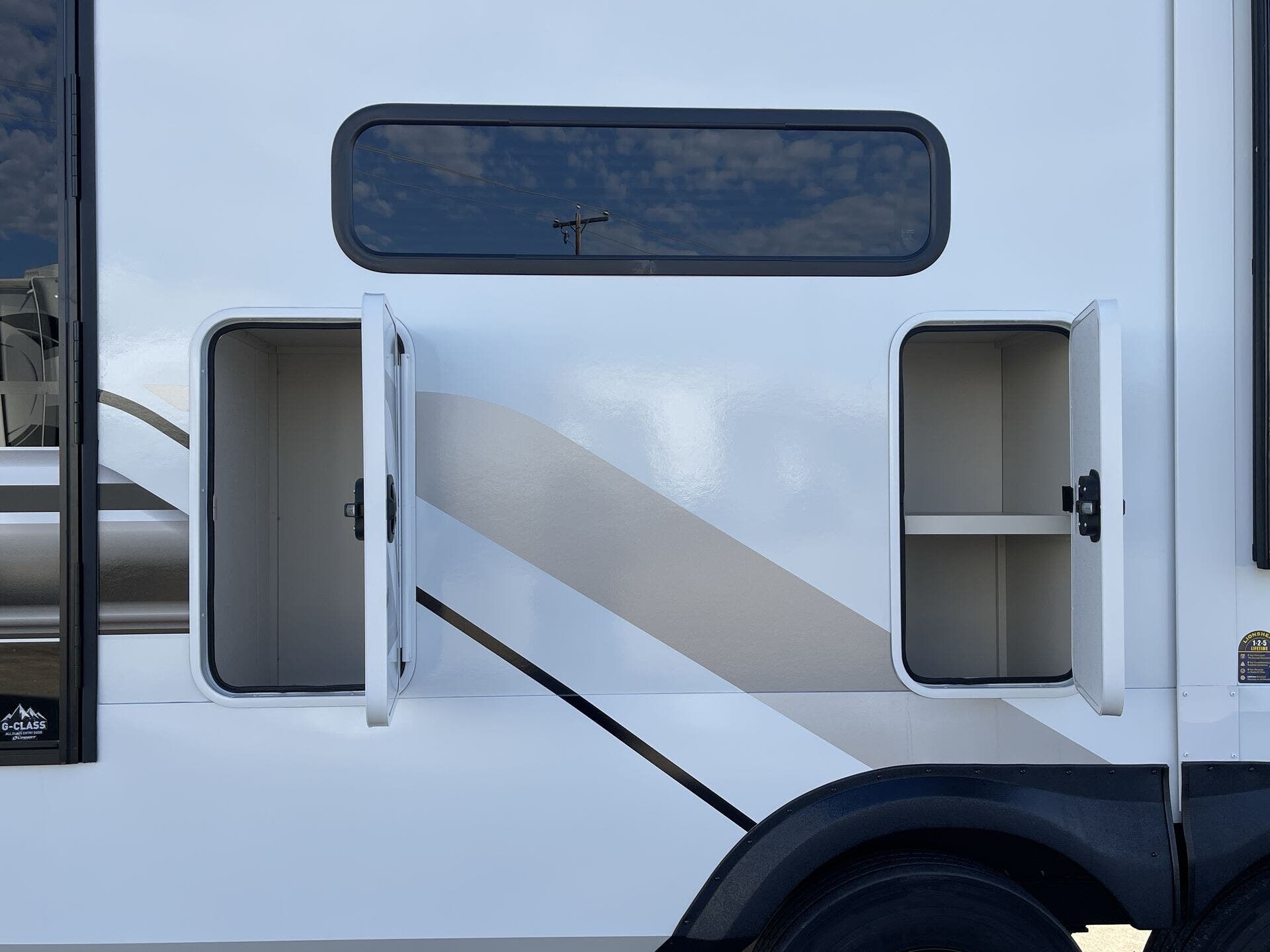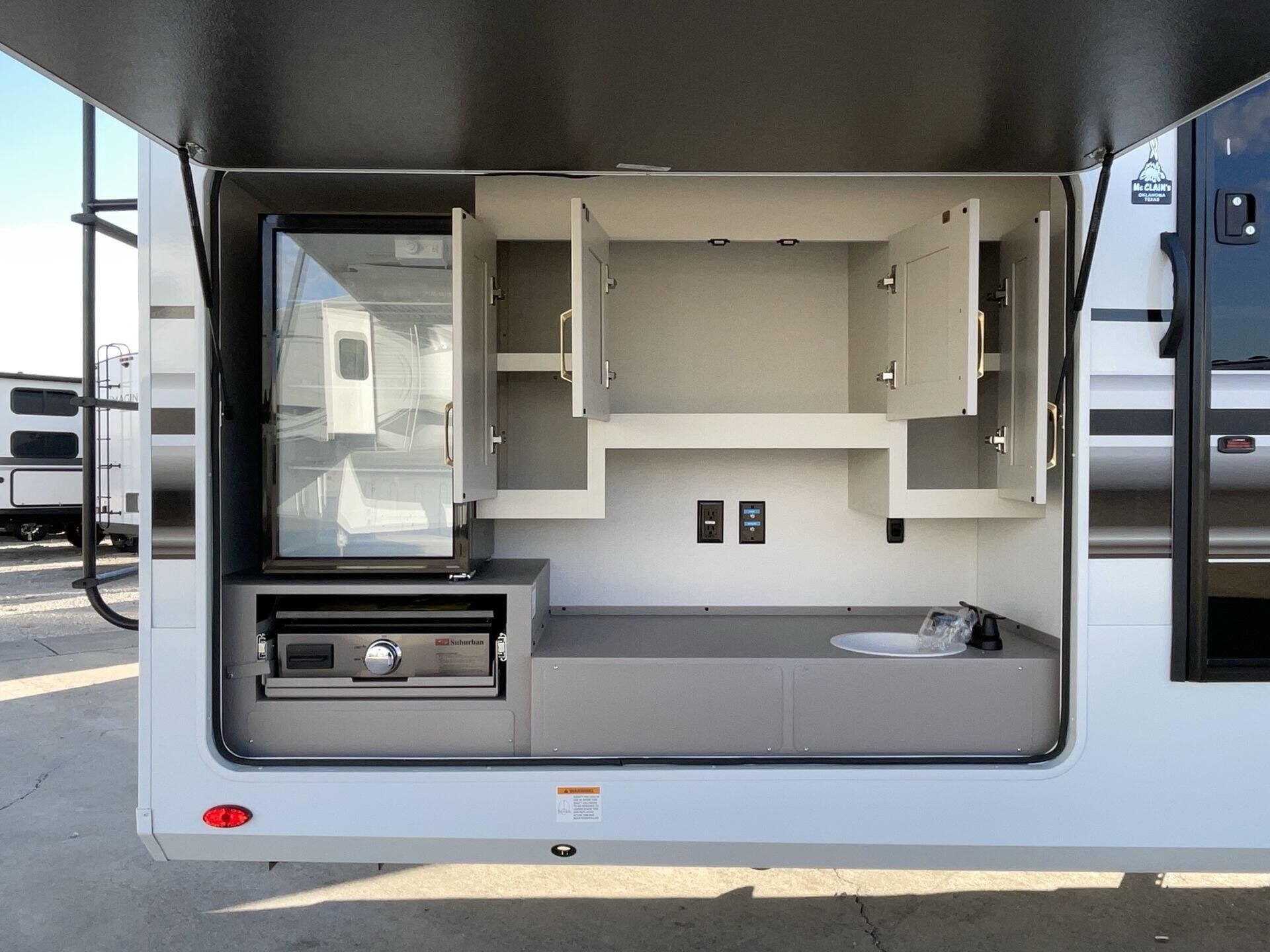 Awning, Black Tank Flush, Detachable Power Cord, Enclosed Underbelly, Exterior Refrigerator, Exterior Speakers, Fiberglass Sidewalls, Griddle, Heated Underbelly, Ladder, Mor-Ryde Suspension, Outside Kitchen, Pass Thru Storage, Power Awning, Power Roof Vent, Roof Deck, Roof Vent, Screen Door, Slam Latch Baggage Doors, Slideout, Spare Tire Kit -