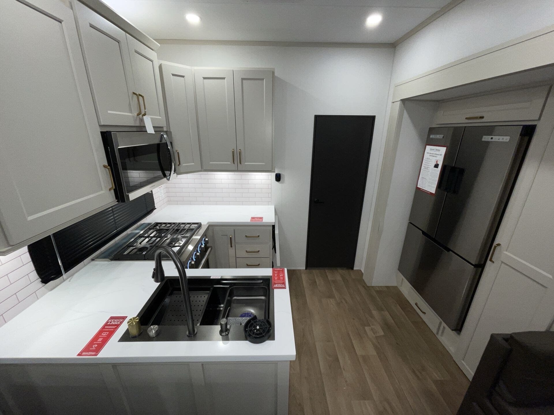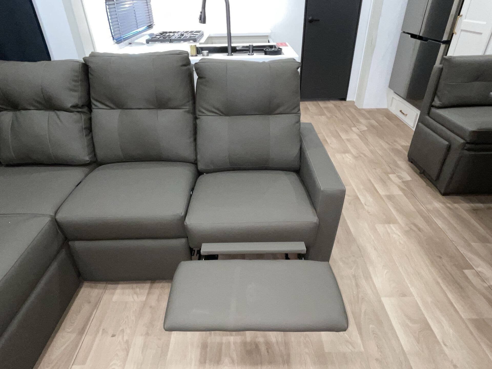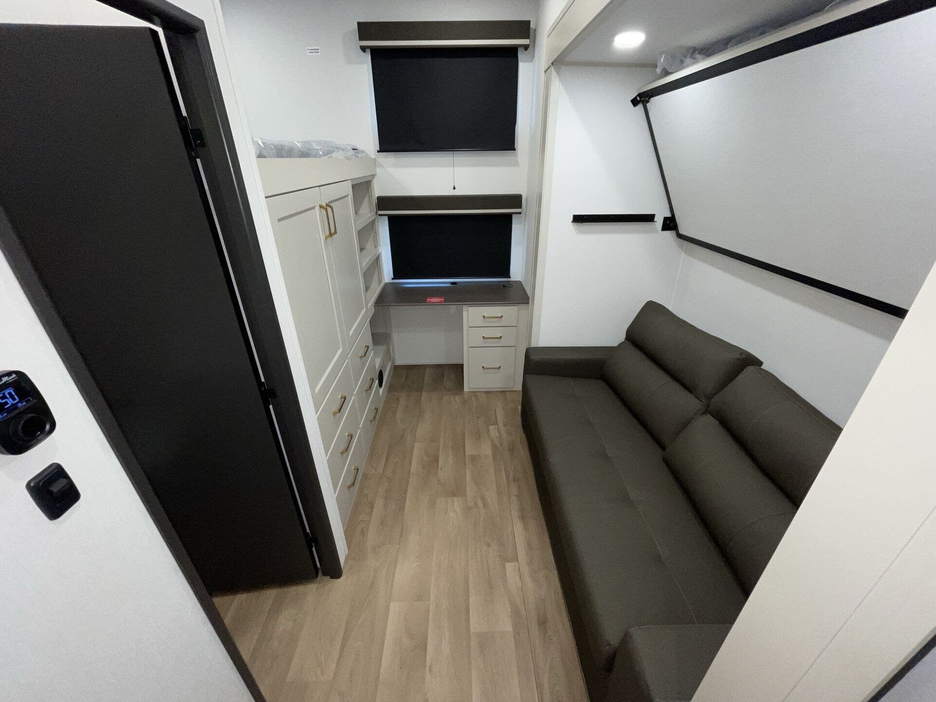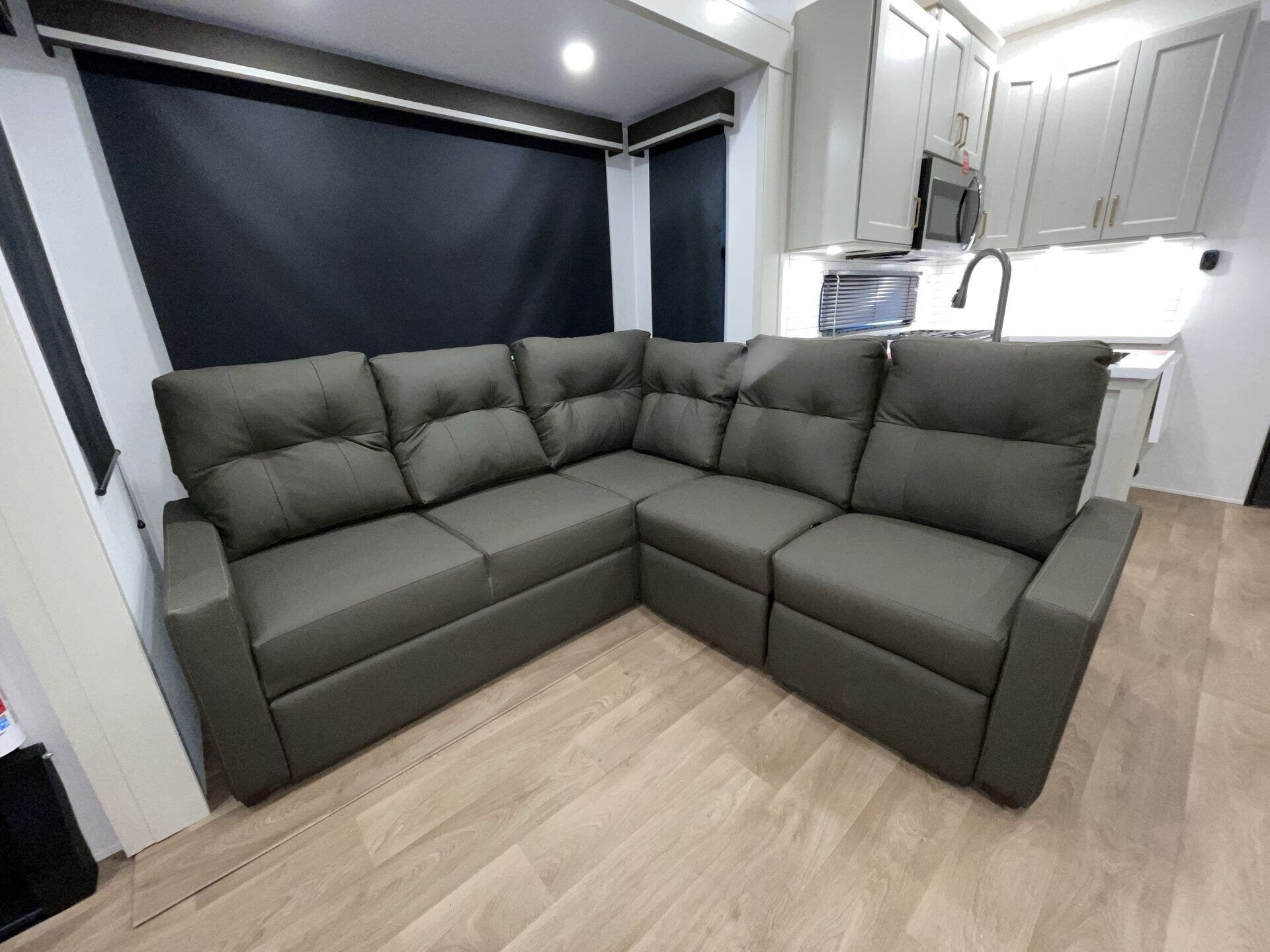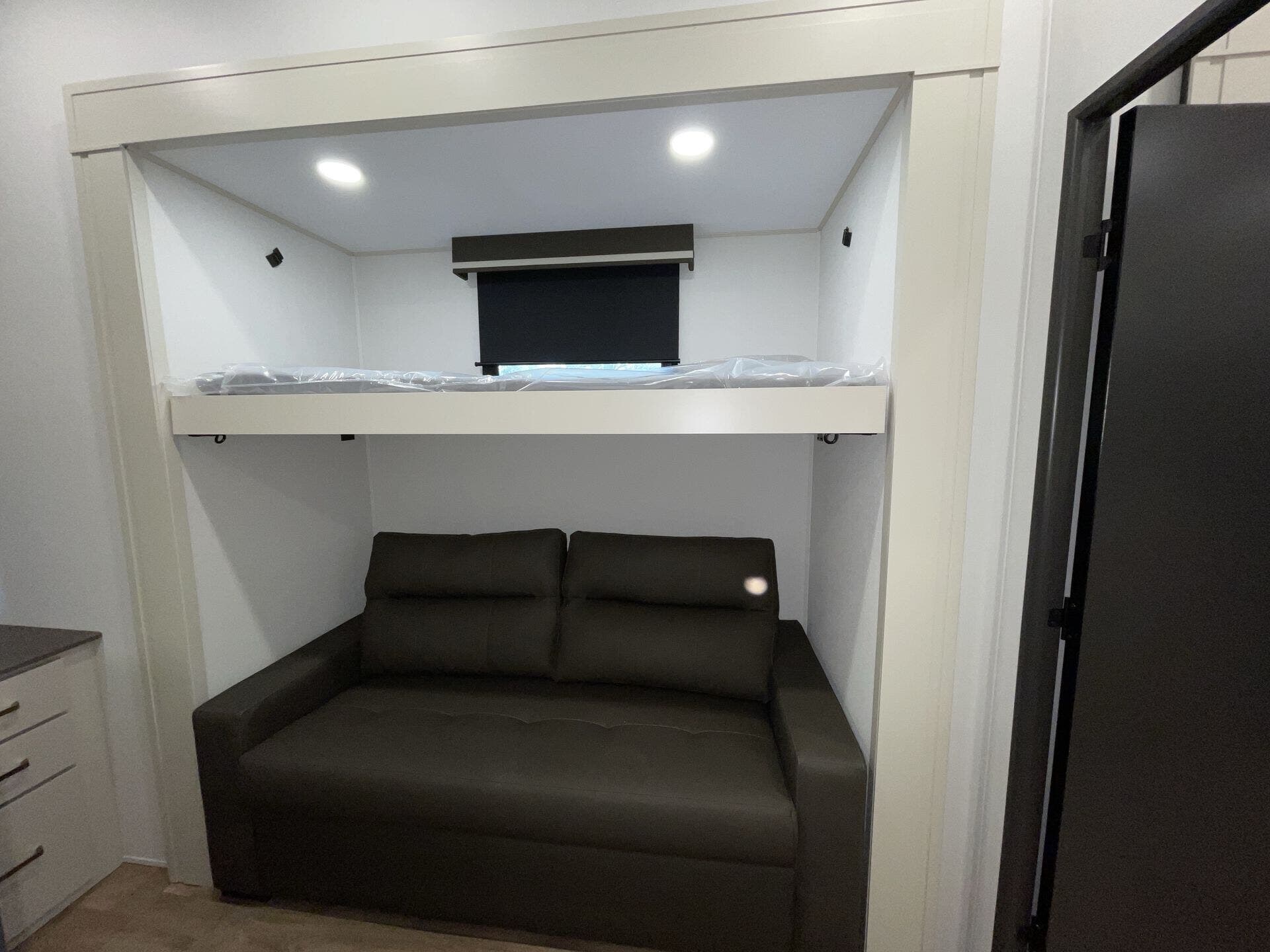 If you want a fifth wheel that feels like a real home on wheels, the 3904BH absolutely delivers. The front queen bedroom is private and roomy, while the rear bunkhouse gives space for kids, friends, or extra storage. With sleeping for up to 9, you don’t have to squeeze — there’s room for everyone.