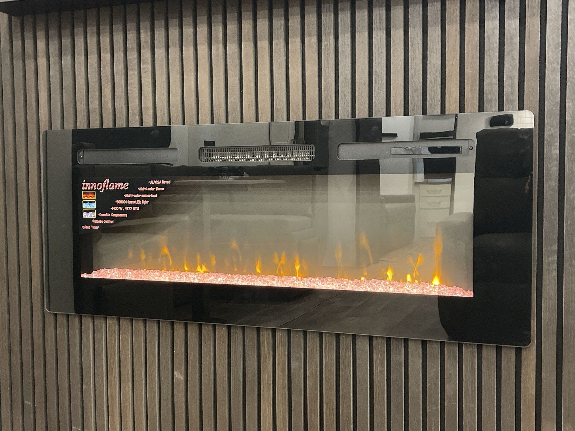 The kitchen is legit: full-size fridge, plenty of counter space, and even an outdoor griddle if you want to cook under the stars. Inside, the living area is big — recliners or sofa, a fireplace to cozy up by, TV and entertainment center so nights in feel nice.