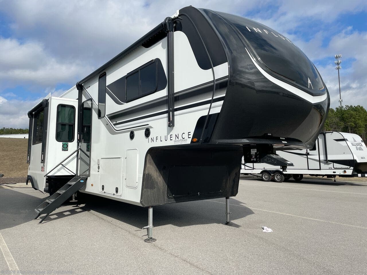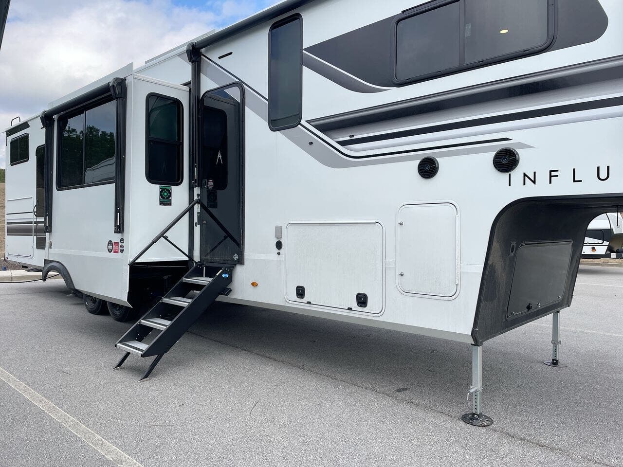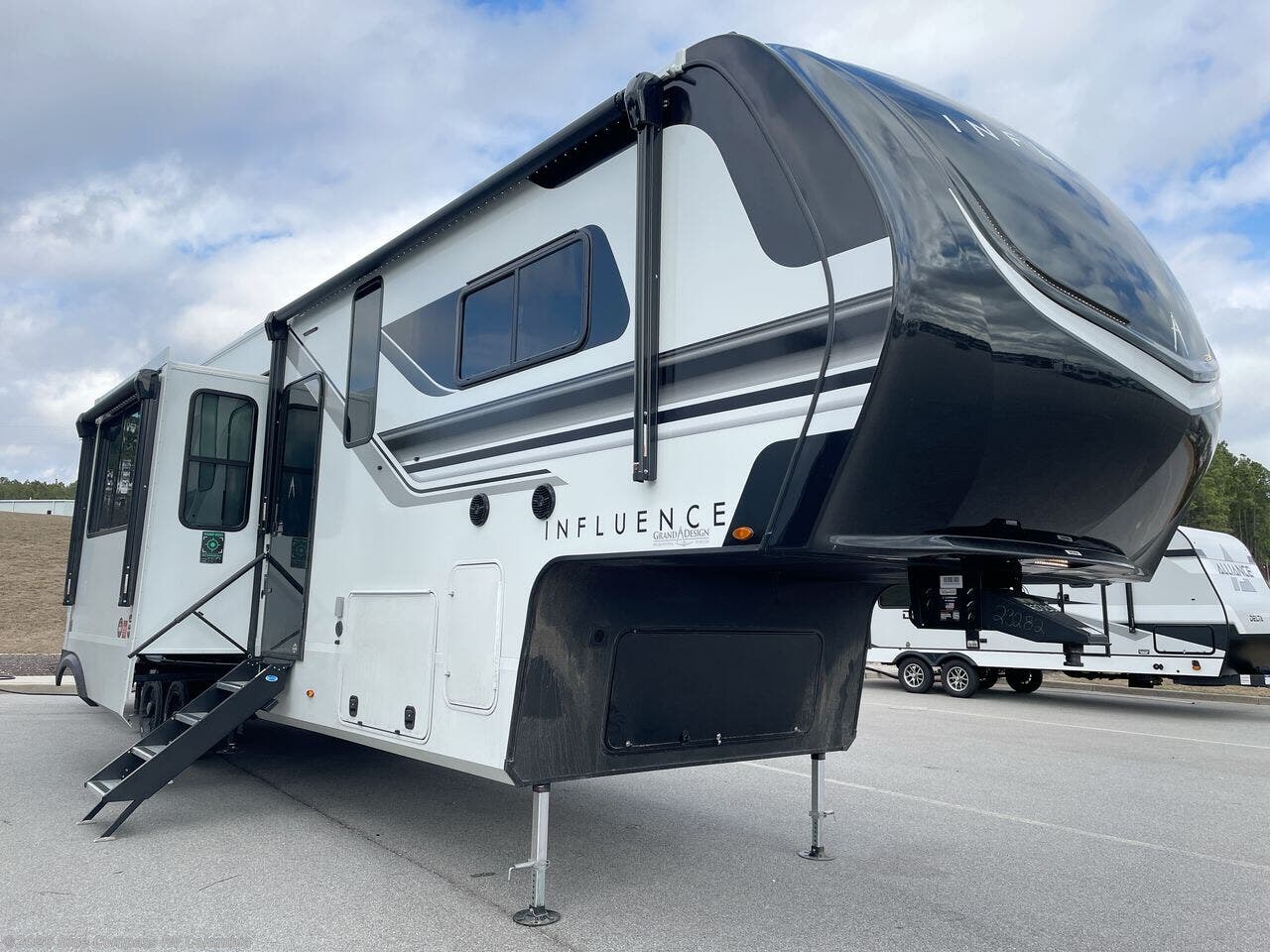 Any Grand Design Influence fifth wheel features five-sided aluminum cage construction with a walk-on roof and a fully enclosed underbelly with heated tanks and storage for all weather camping. For peace of mind, the MORryde CRE3000 Suspension system will provide safe and smooth towing, and the 101" widebody construction offers all the room you need and that is before multiple slides are fully engaged. You will appreciate the Keyed-Alike locks, slam-latch baggage doors with magnetic door catches, exterior security light, and SolidStep entry steps. On the inside, Congoleum flooring, premium roller shades for privacy, a hallway handrail for safety, and nightstands with USB ports to keep all of your electronics fully charged. You will also love the on demand tankless water heater when showering, plus the added heat and ambiance from an electric fireplace, and so much more!