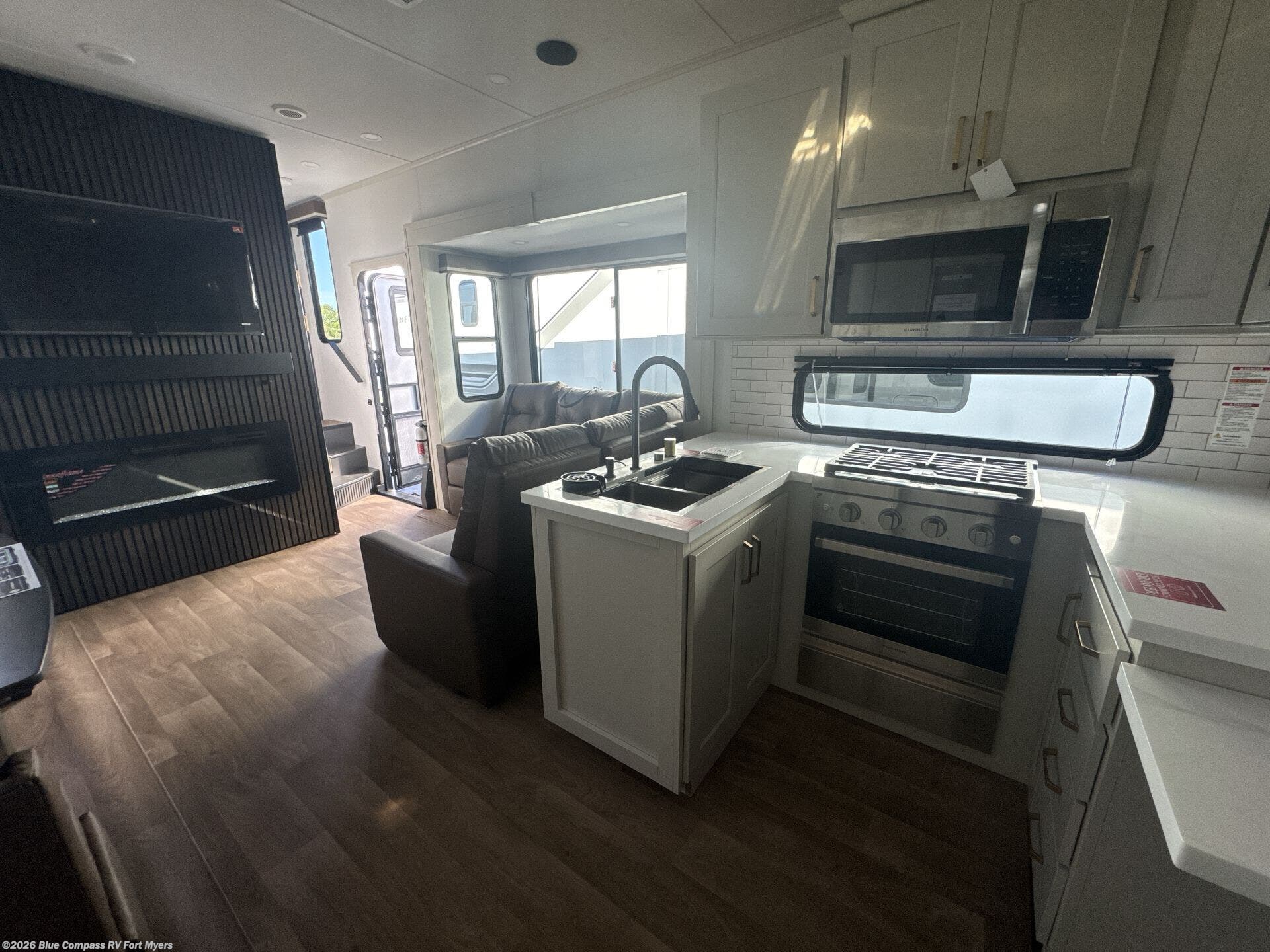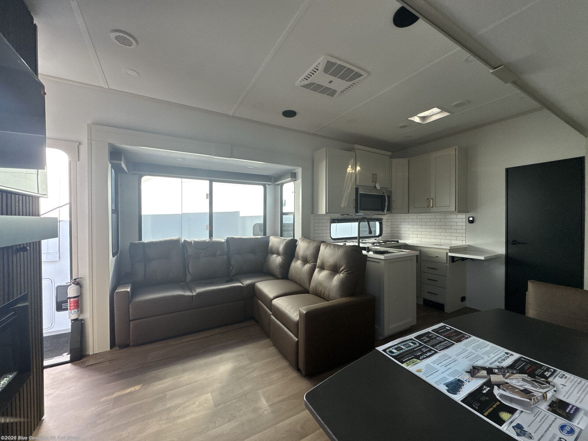 Your whole crew will love camping in this spacious fifth wheel! There is a rear private bunkhouse with a tri-fold sofa and fold-down bunk within a slide, plus a second bunk, storage space, and even a half bath with one of the dual entry doors to the unit for added convenience! You'll find your own space in the front private bedroom, complete with a queen bed slide out, a pass-thru clothes hamper that goes directly into the full bath, plus washer and dryer prep if you choose to add these appliances. A U-shaped kitchen includes ample counter space, a spice rack above the microwave, plus a flip-up countertop extension for even more prep space. There is also a U-shaped dinette where you can all dine around, plus an L-shaped sofa with recline at the end for relaxing space. And you're sure to appreciate the entertainment wall with an LED smart TV, fireplace and smart storage!