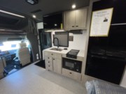 Inside, the Lineage 25FW impresses with a smart open-concept layout, featuring a spacious living area with theater seating, a free-standing dinette, and panoramic windows that flood the space with natural light. The gourmet kitchen includes solid-surface countertops, a residential-style cooktop and oven, microwave, and a large 12V refrigerator. In the front, the elevated master bedroom offers a full-size king bed, ample wardrobe storage, and washer/dryer prep — all with a surprising amount of headroom and privacy.