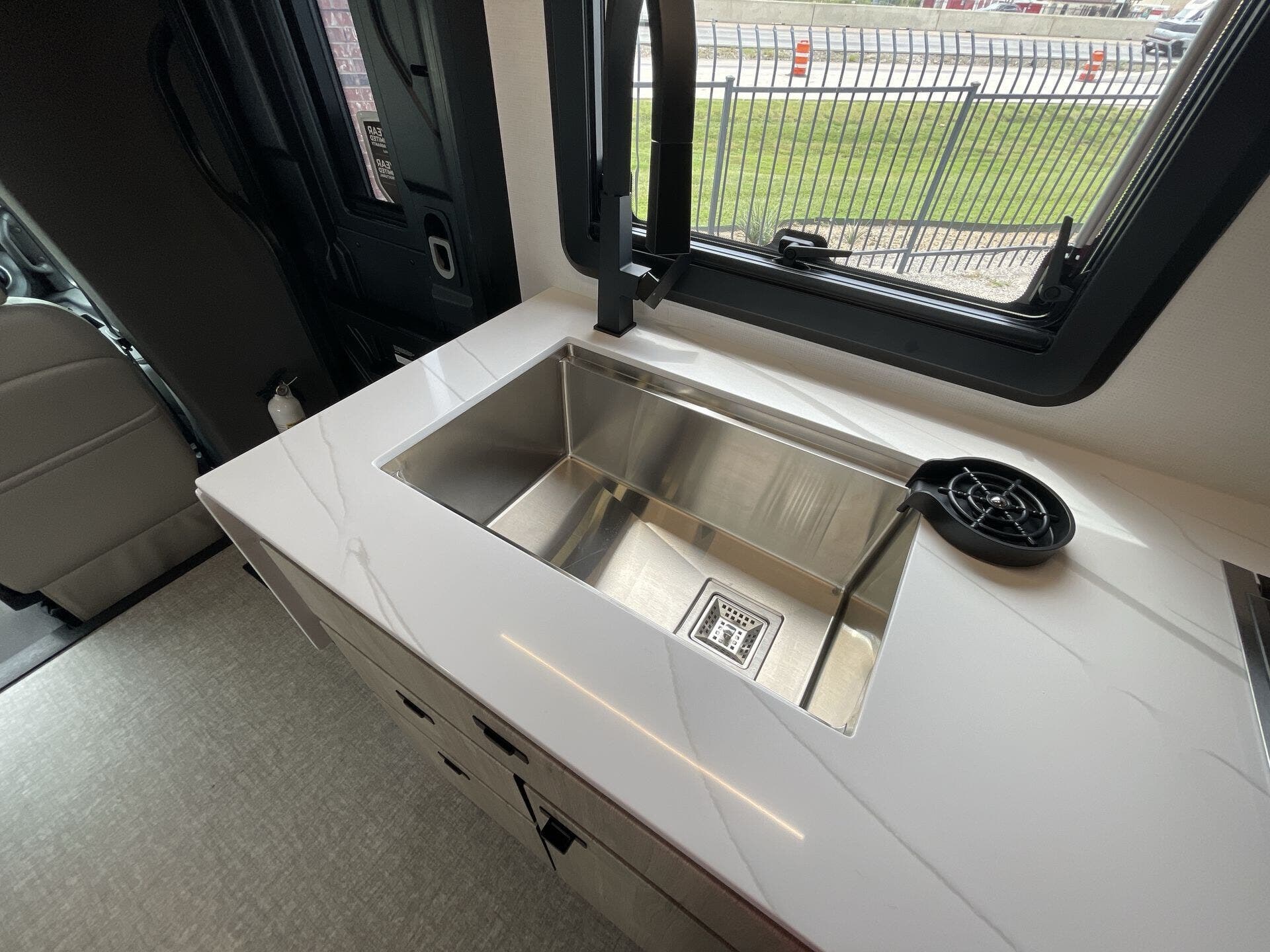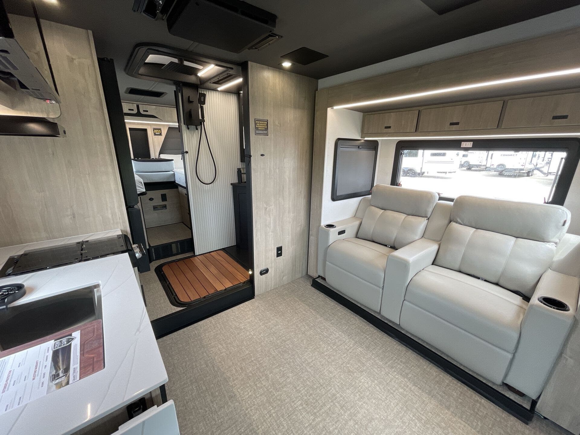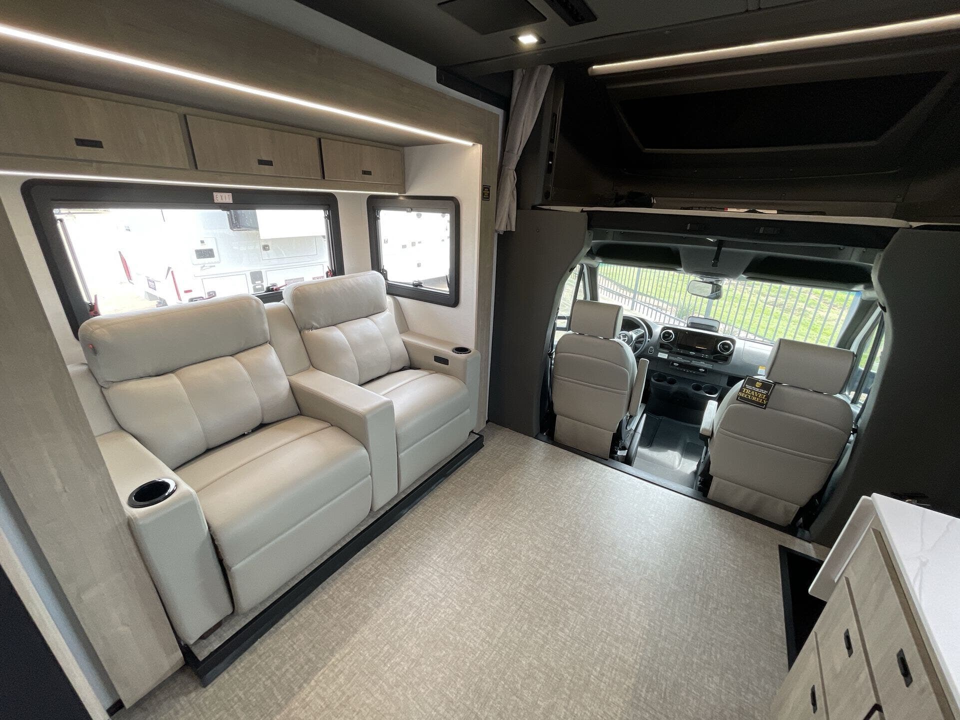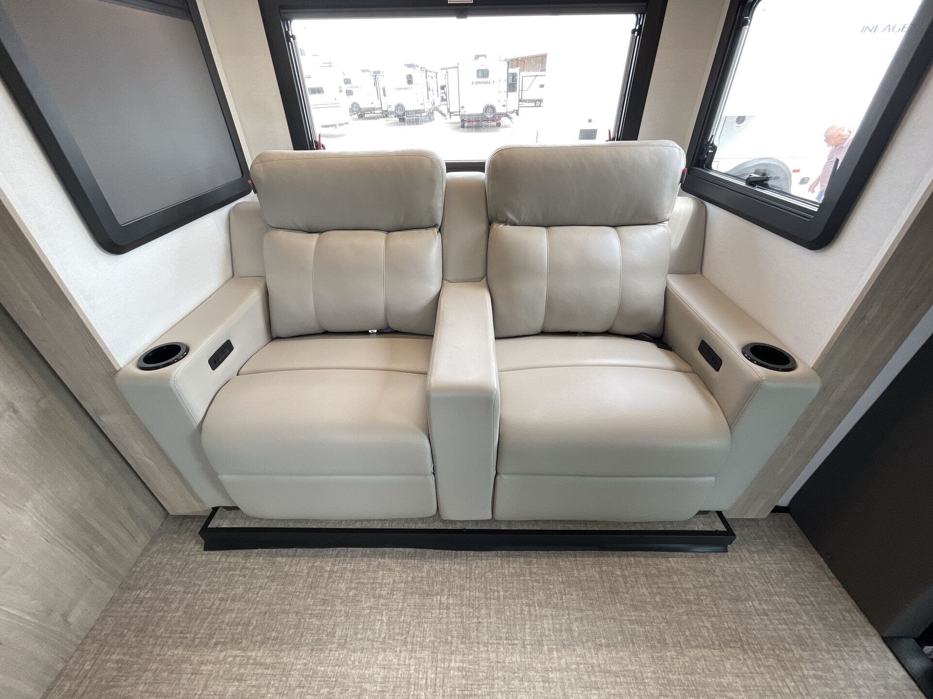 Inside, the Lineage 25TK features a spacious, open-concept layout with a rear kitchen that maximizes counter space and storage. Stainless steel appliances, a deep farmhouse sink, and solid-surface countertops make meal prep a breeze, while the adjacent living area includes theater seating or a tri-fold sofa, a booth dinette, and a full entertainment center for relaxing after a day outdoors. Large panoramic windows flood the interior with natural light, creating a bright and welcoming atmosphere that feels like home.
