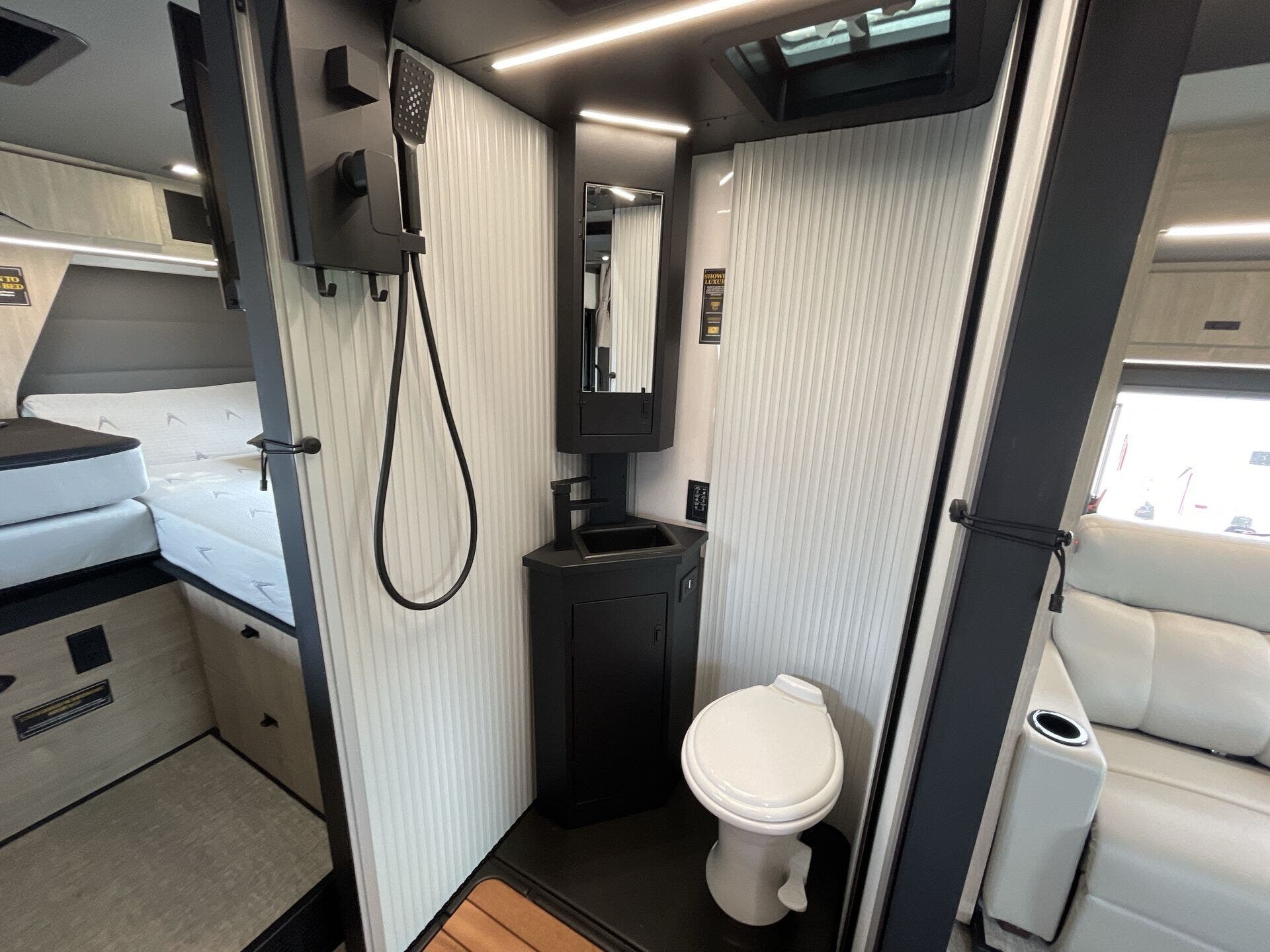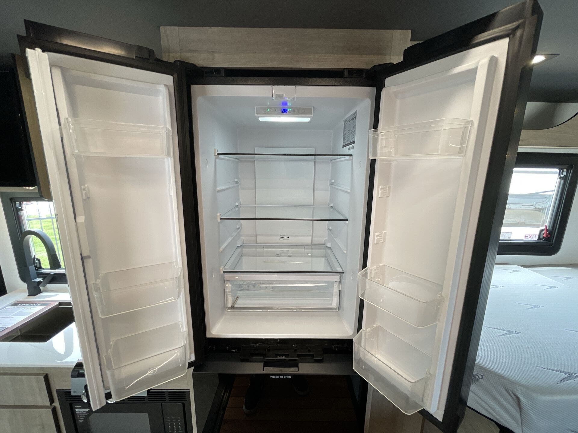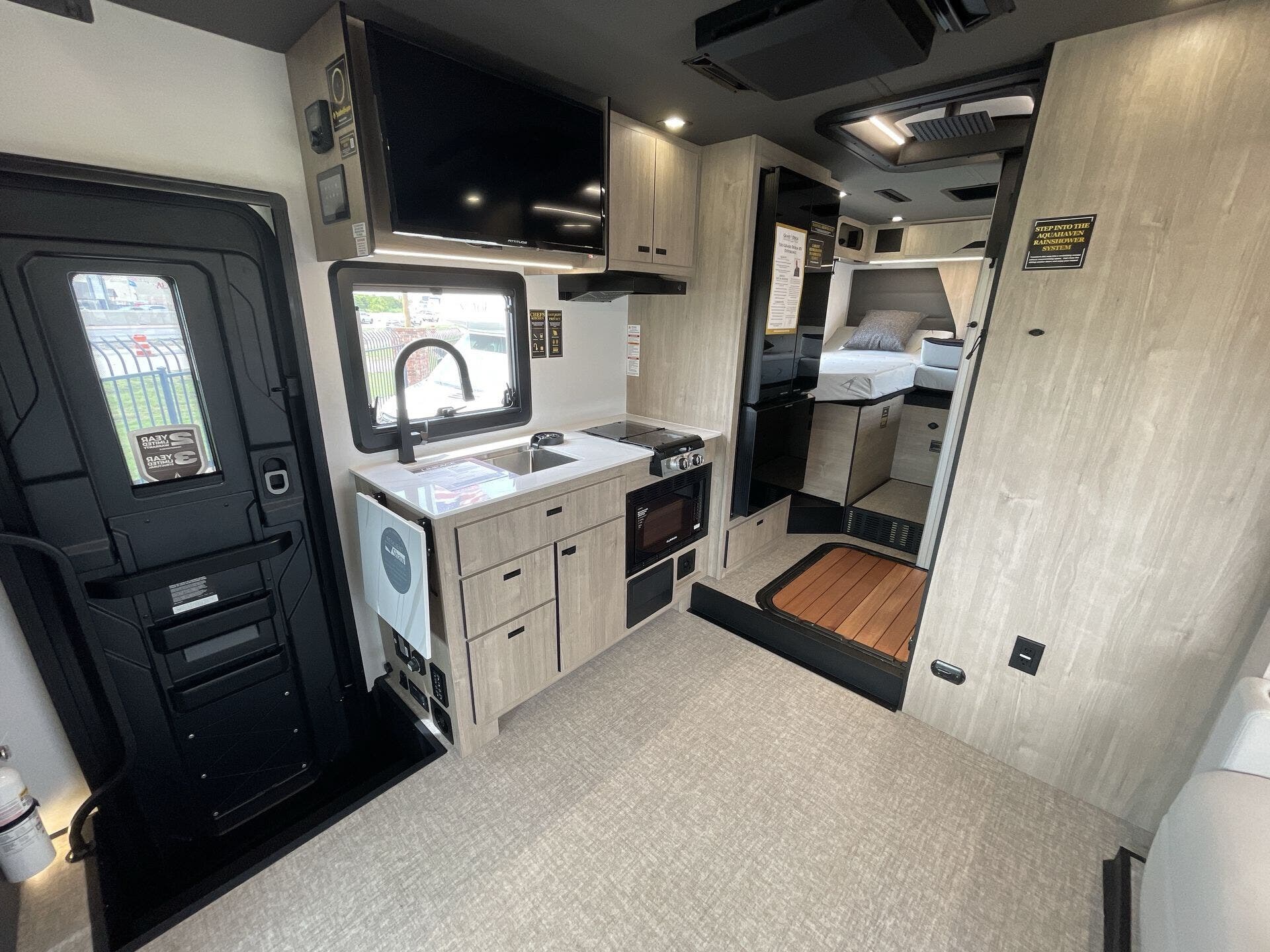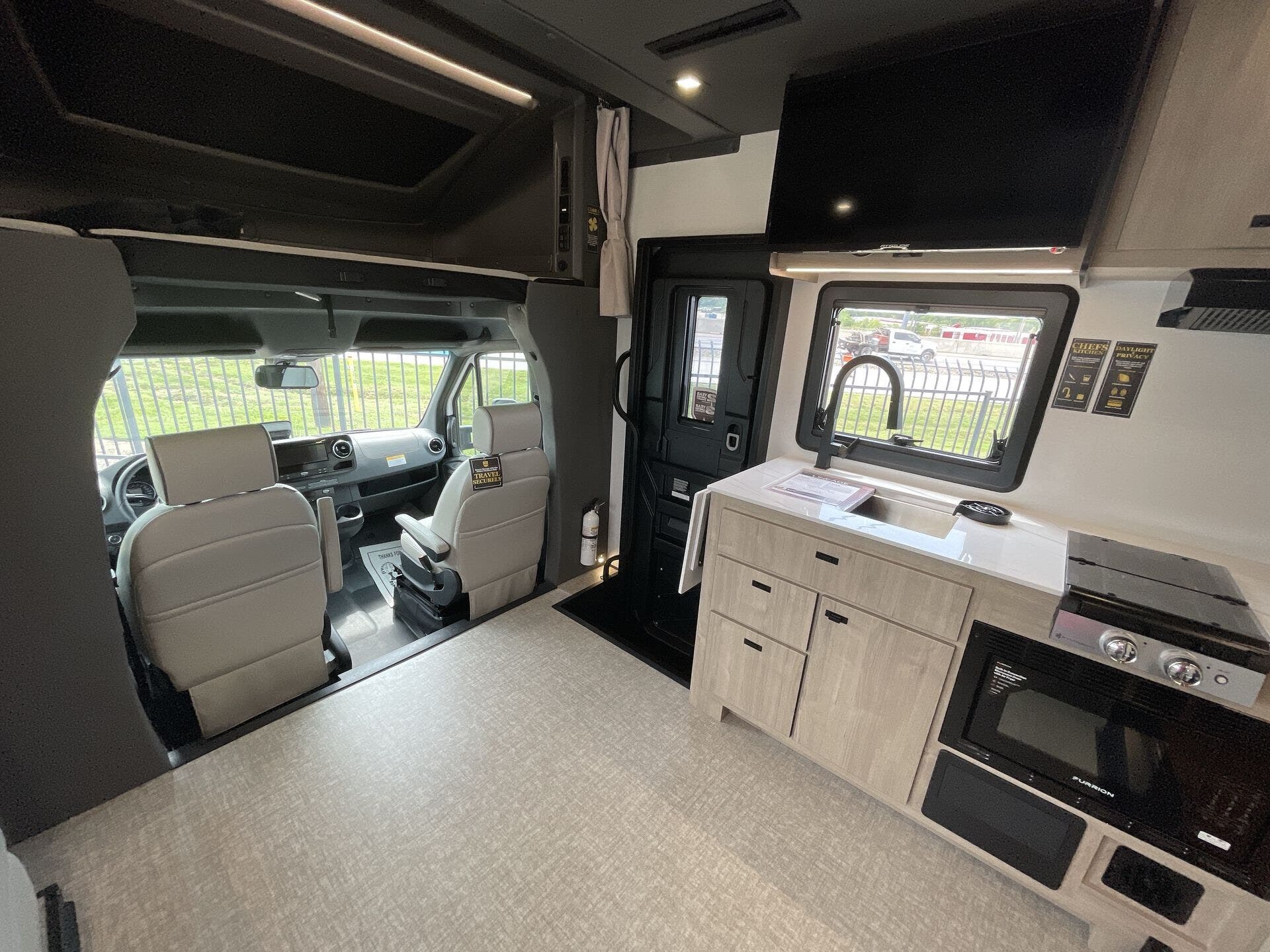Inside, the Lineage 25TK features a spacious, open-concept layout with a rear kitchen that maximizes counter space and storage. Stainless steel appliances, a deep farmhouse sink, and solid-surface countertops make meal prep a breeze, while the adjacent living area includes theater seating or a tri-fold sofa, a booth dinette, and a full entertainment center for relaxing after a day outdoors. Large panoramic windows flood the interior with natural light, creating a bright and welcoming atmosphere that feels like home.