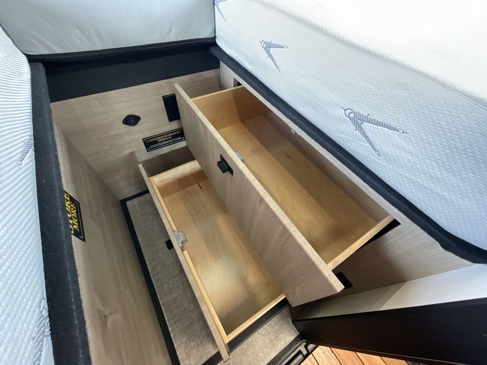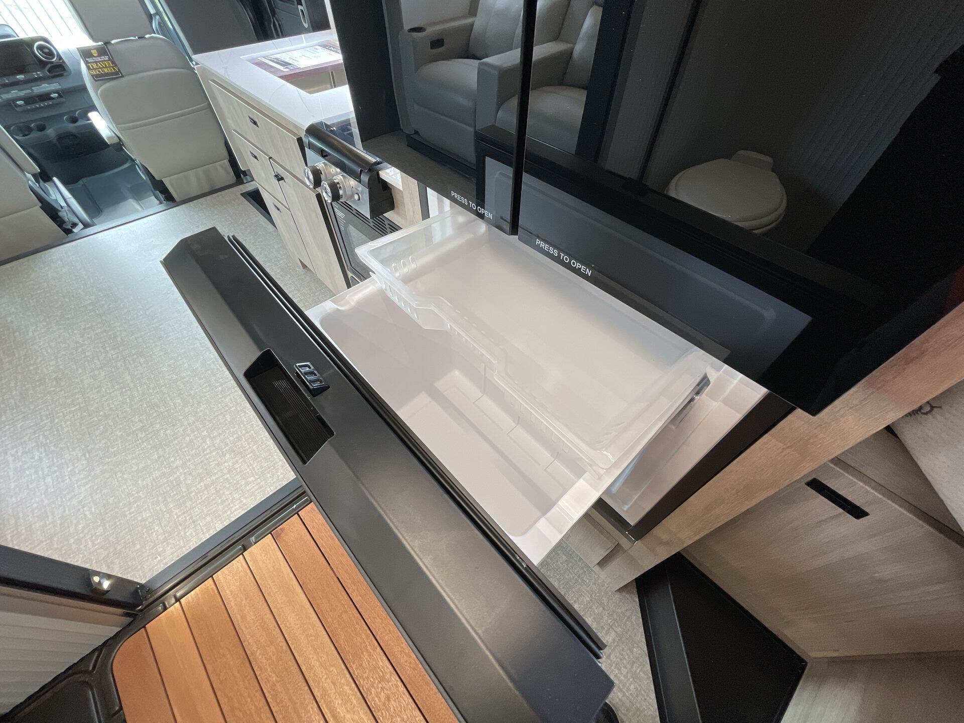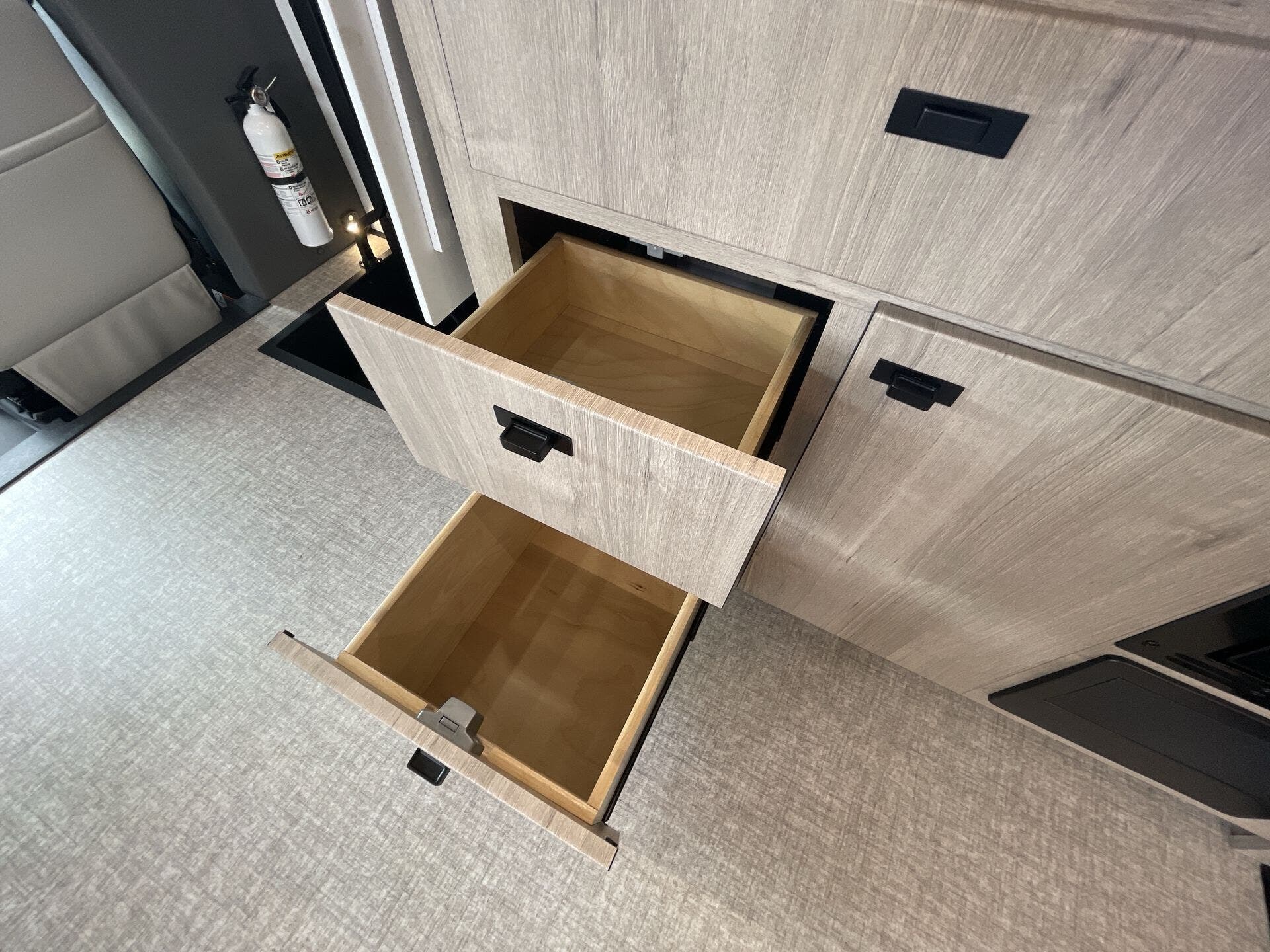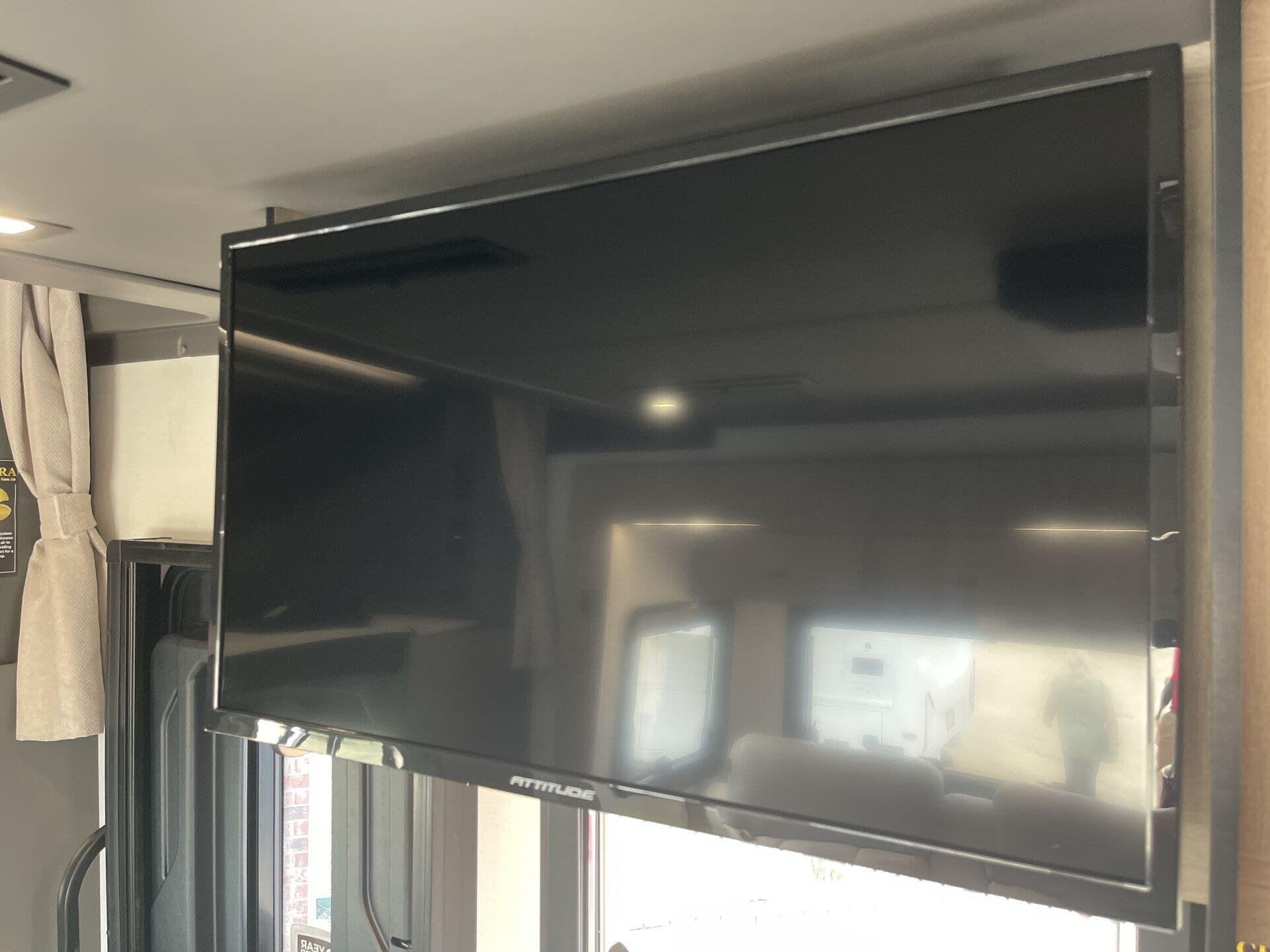 Inside, the Lineage 25TK features a spacious, open-concept layout with a rear kitchen that maximizes counter space and storage. Stainless steel appliances, a deep farmhouse sink, and solid-surface countertops make meal prep a breeze, while the adjacent living area includes theater seating or a tri-fold sofa, a booth dinette, and a full entertainment center for relaxing after a day outdoors. Large panoramic windows flood the interior with natural light, creating a bright and welcoming atmosphere that feels like home.