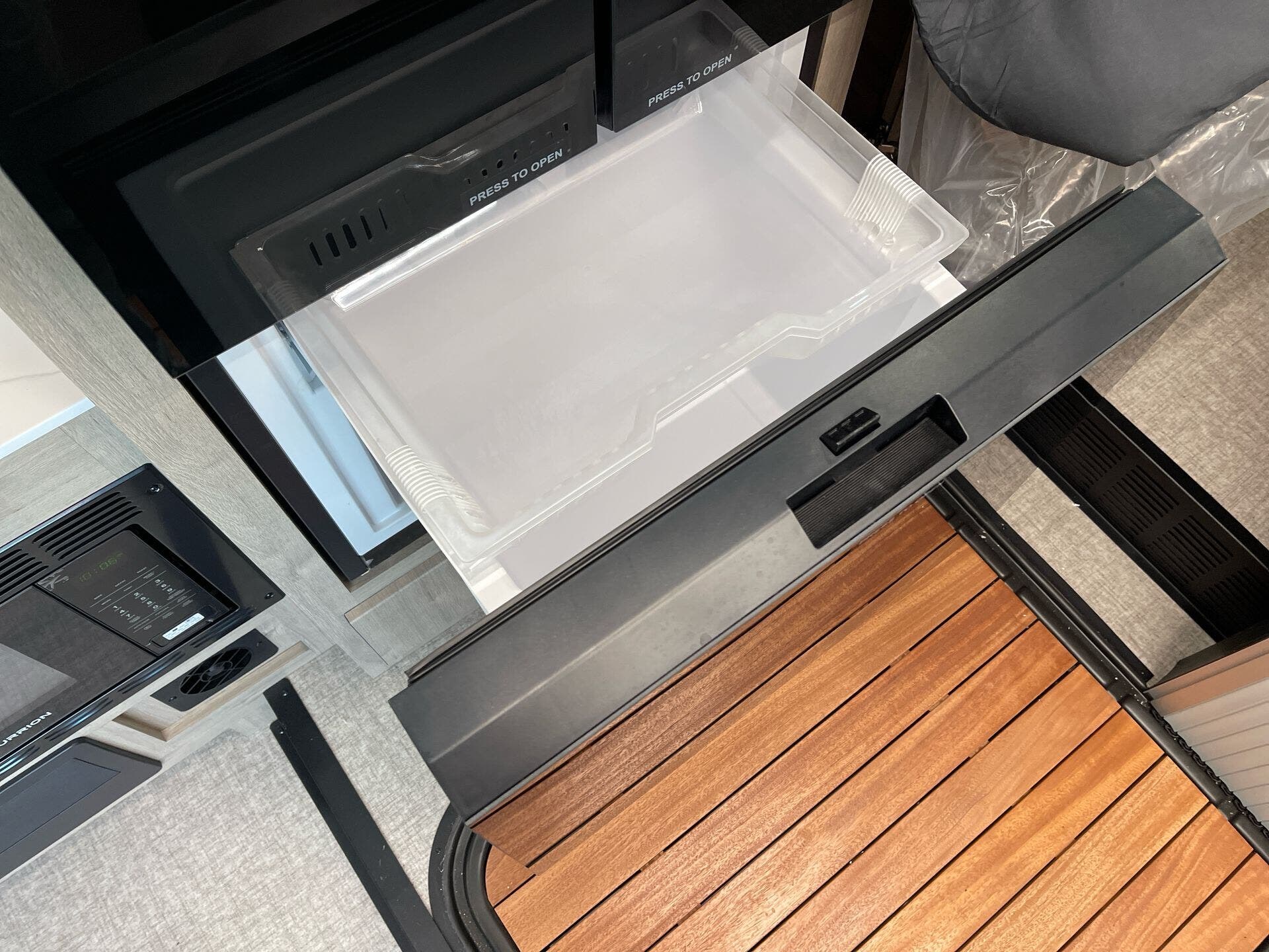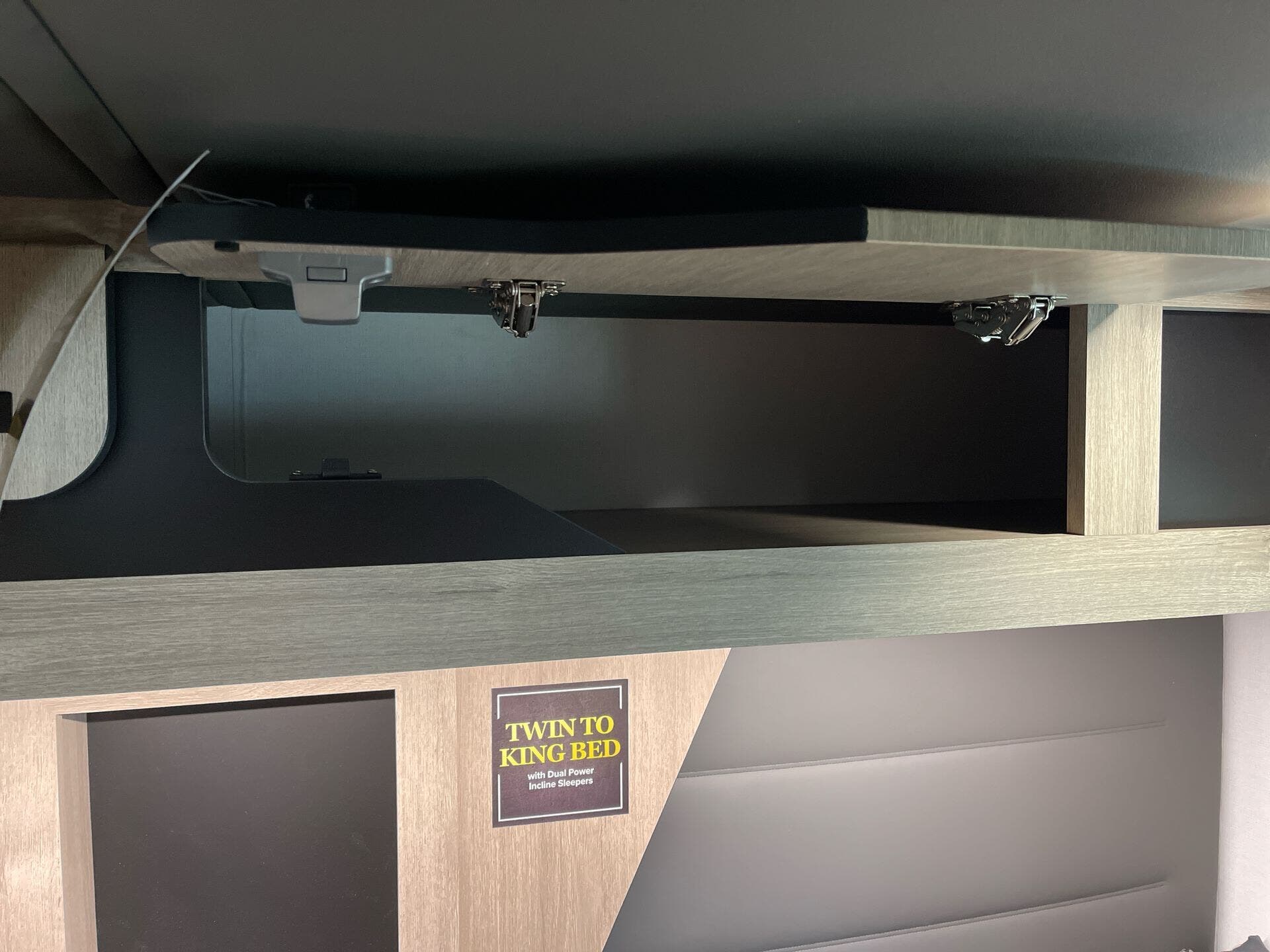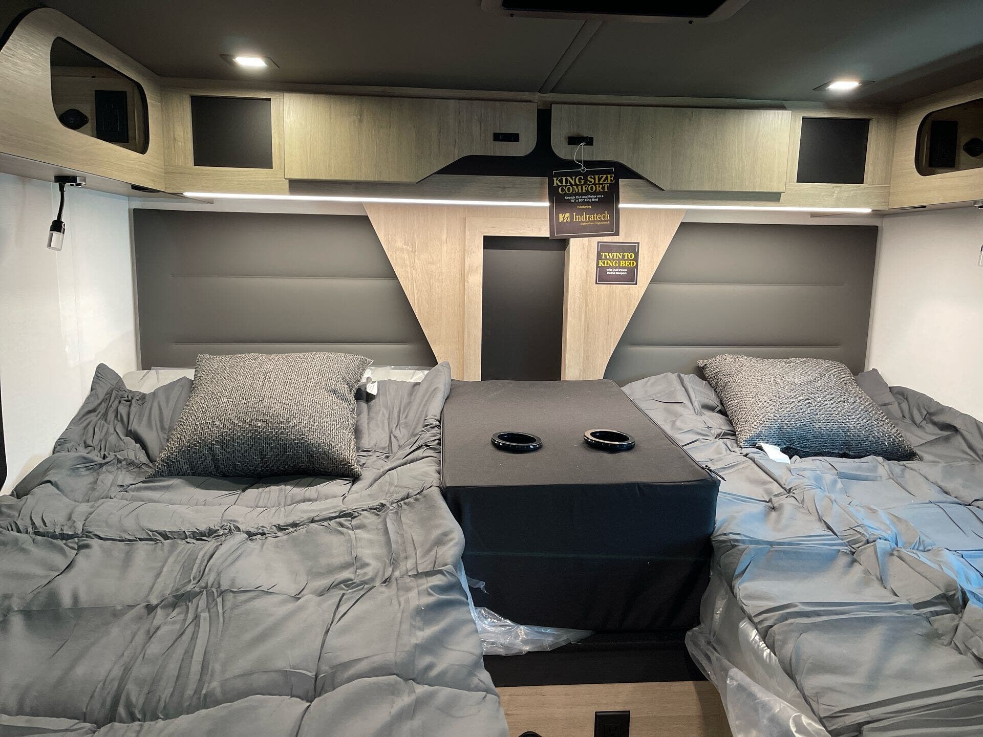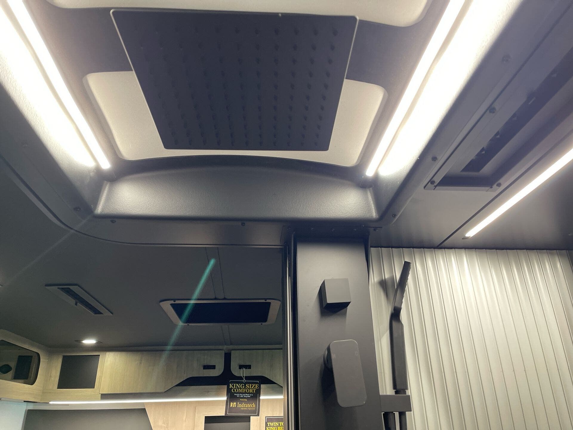 Inside, the flexible sleeping layout features twin power-adjustable 36″ × 80″ and 36″ × 74″ beds that convert into a king-sized bed (70″ × 80″), complete with headboard controls, USB ports, and storage. The bathroom pioneers an AquaHaven “walk-through” wet-dry design that can be used as a rain shower or enclosed dry bath—luxuriously tiled and heated for year-round comfort.