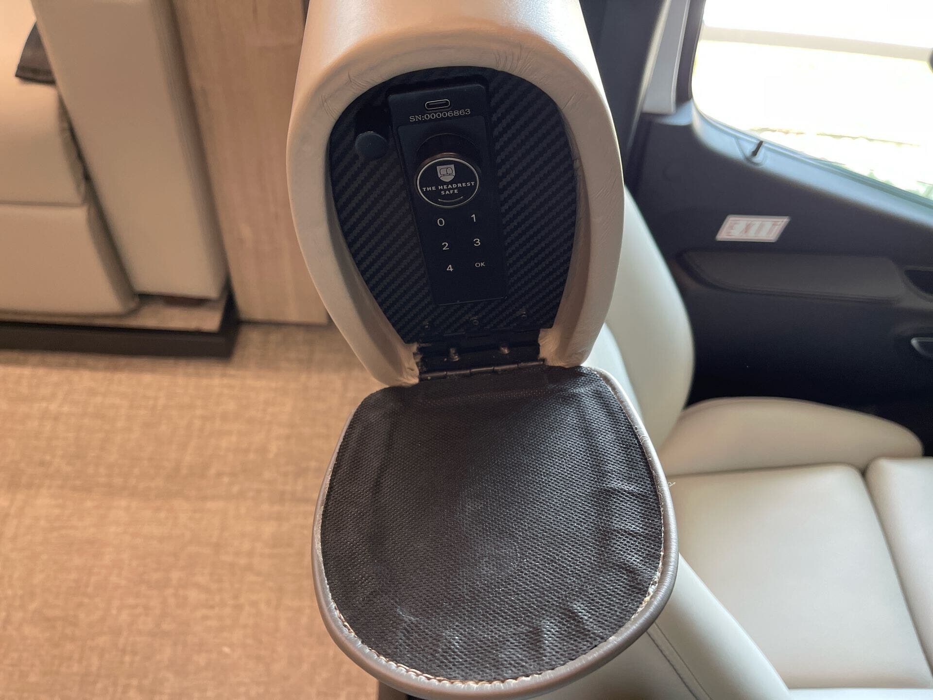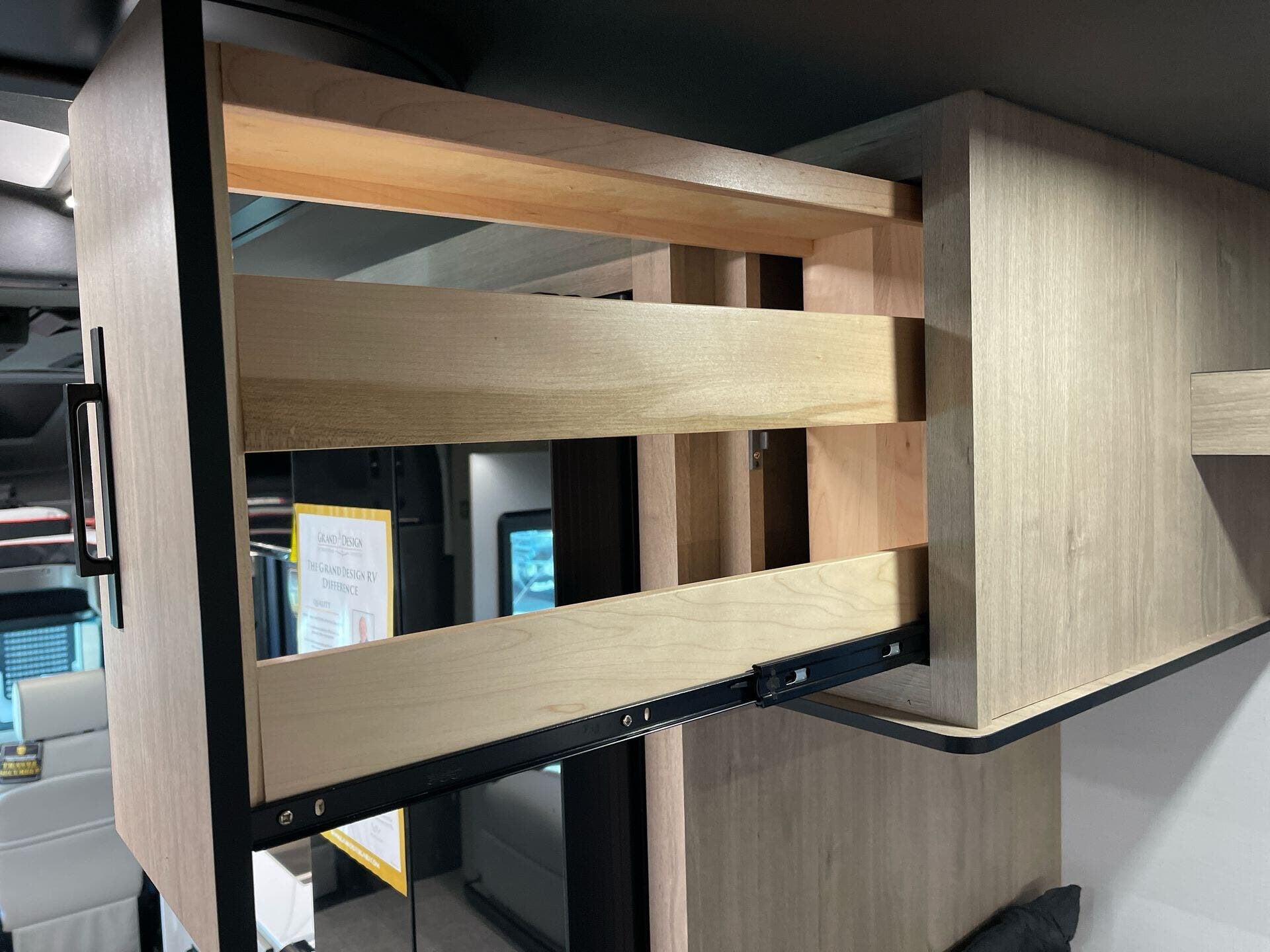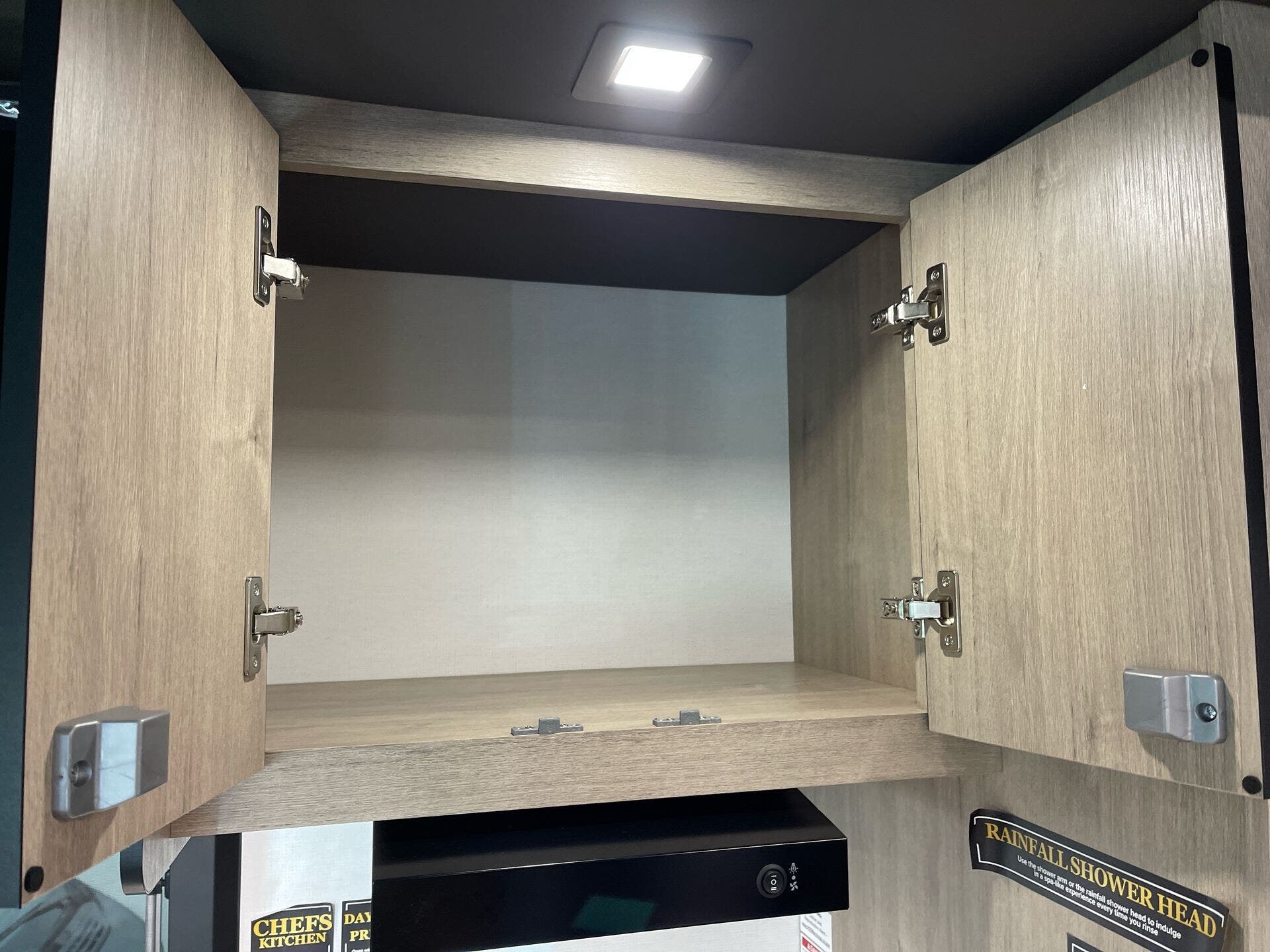 Inside, the flexible sleeping layout features twin power-adjustable 36″ × 80″ and 36″ × 74″ beds that convert into a king-sized bed (70″ × 80″), complete with headboard controls, USB ports, and storage. The bathroom pioneers an AquaHaven “walk-through” wet-dry design that can be used as a rain shower or enclosed dry bath—luxuriously tiled and heated for year-round comfort.