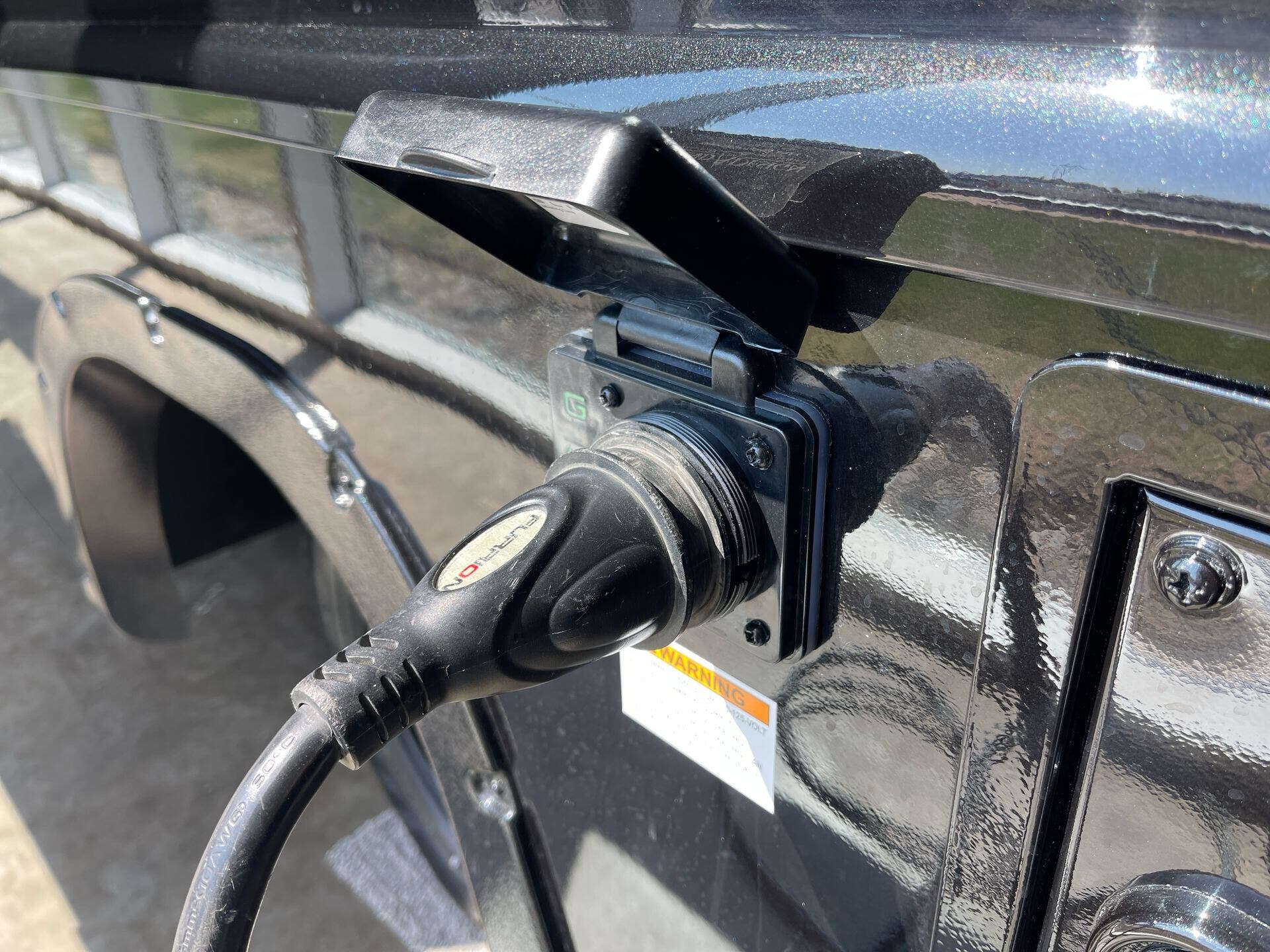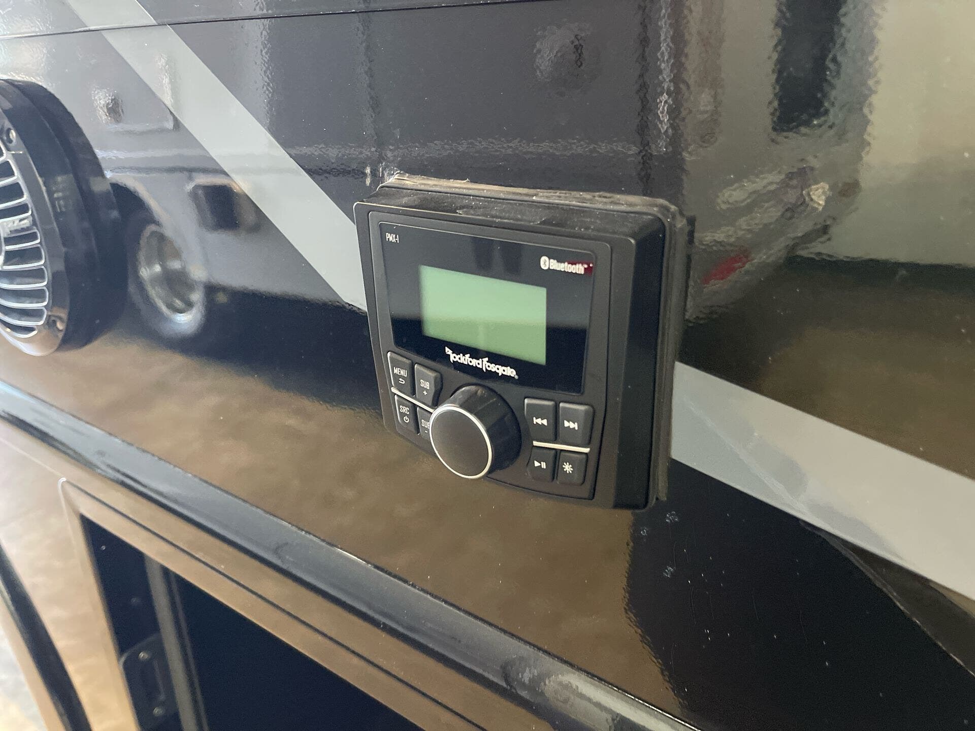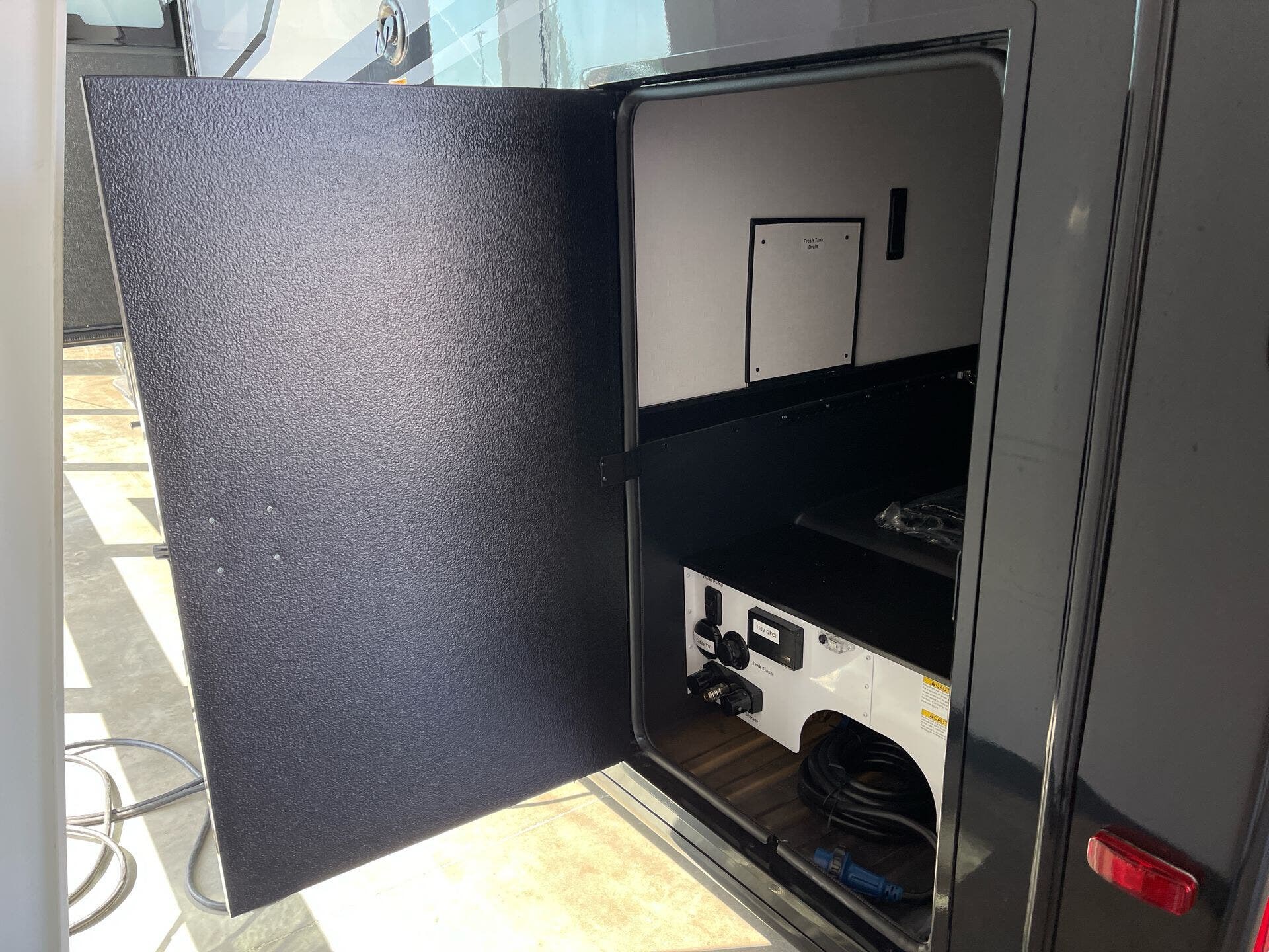 Premium touches abound: a 10 cu ft 12 V refrigerator, tankless water heater, SharkBite plumbing, integrated Starlink internet, Rockford Fosgate audio, Firefly Power system with lithium batteries, and a powerful 4.5 kW generator.