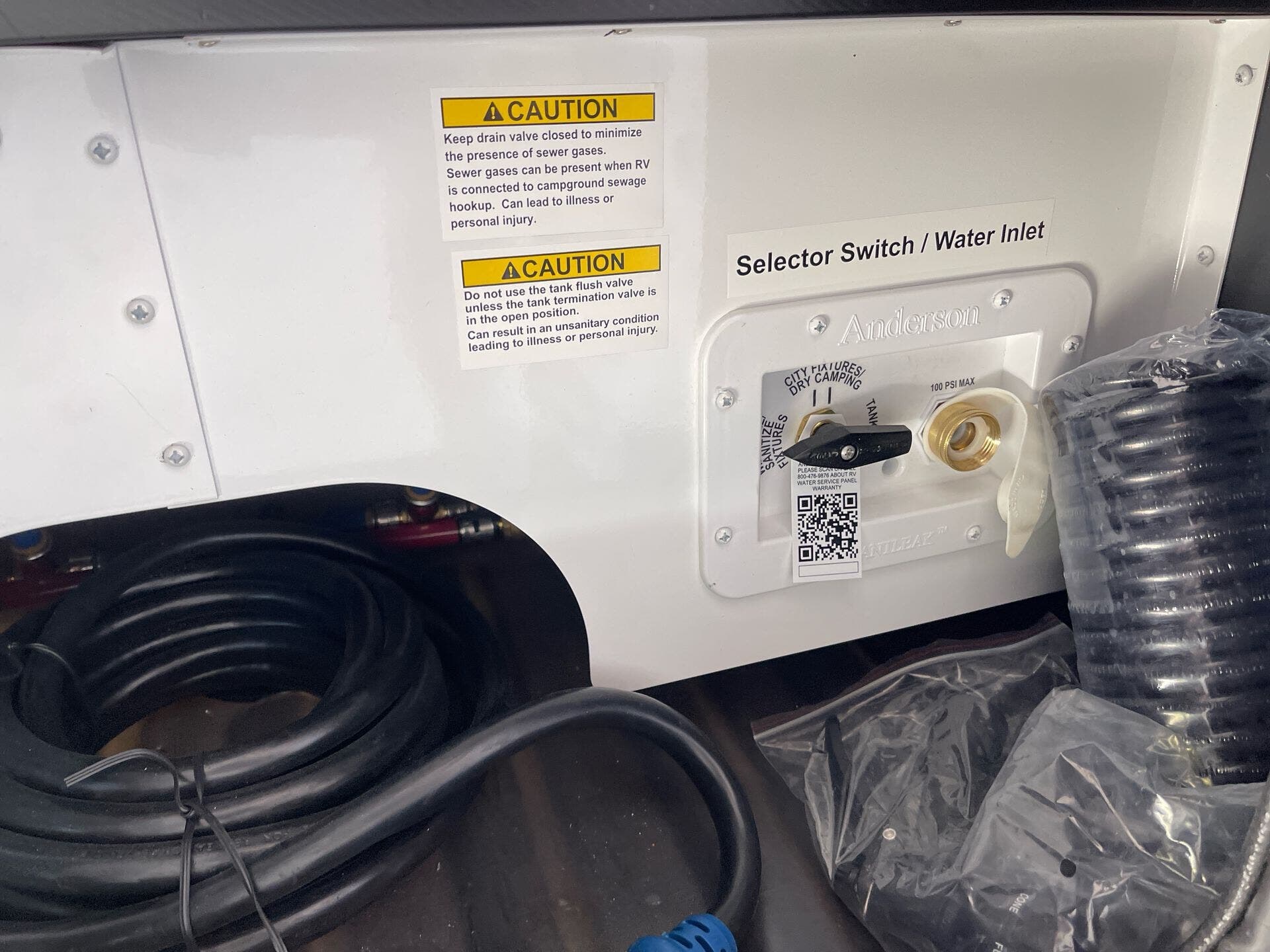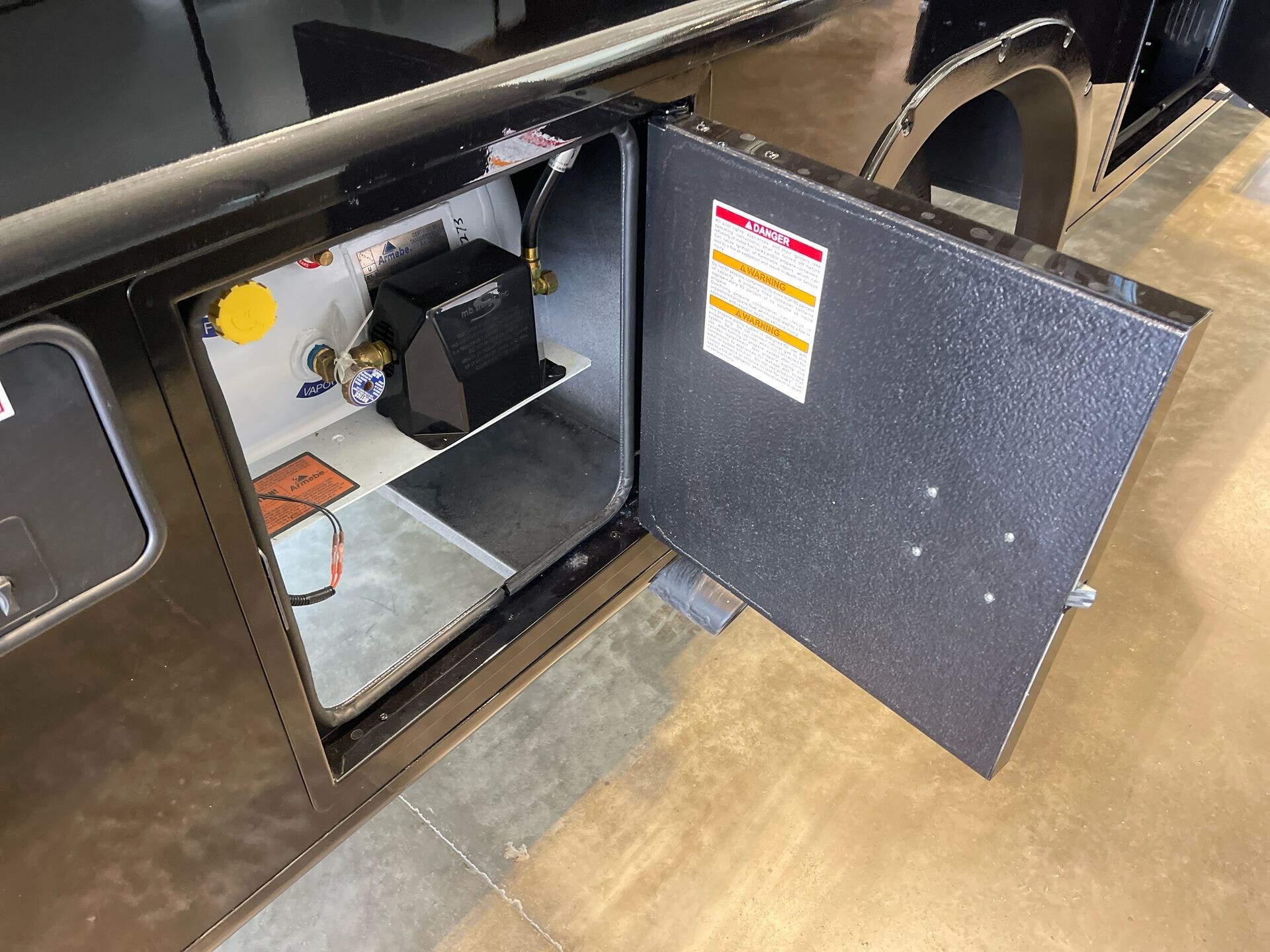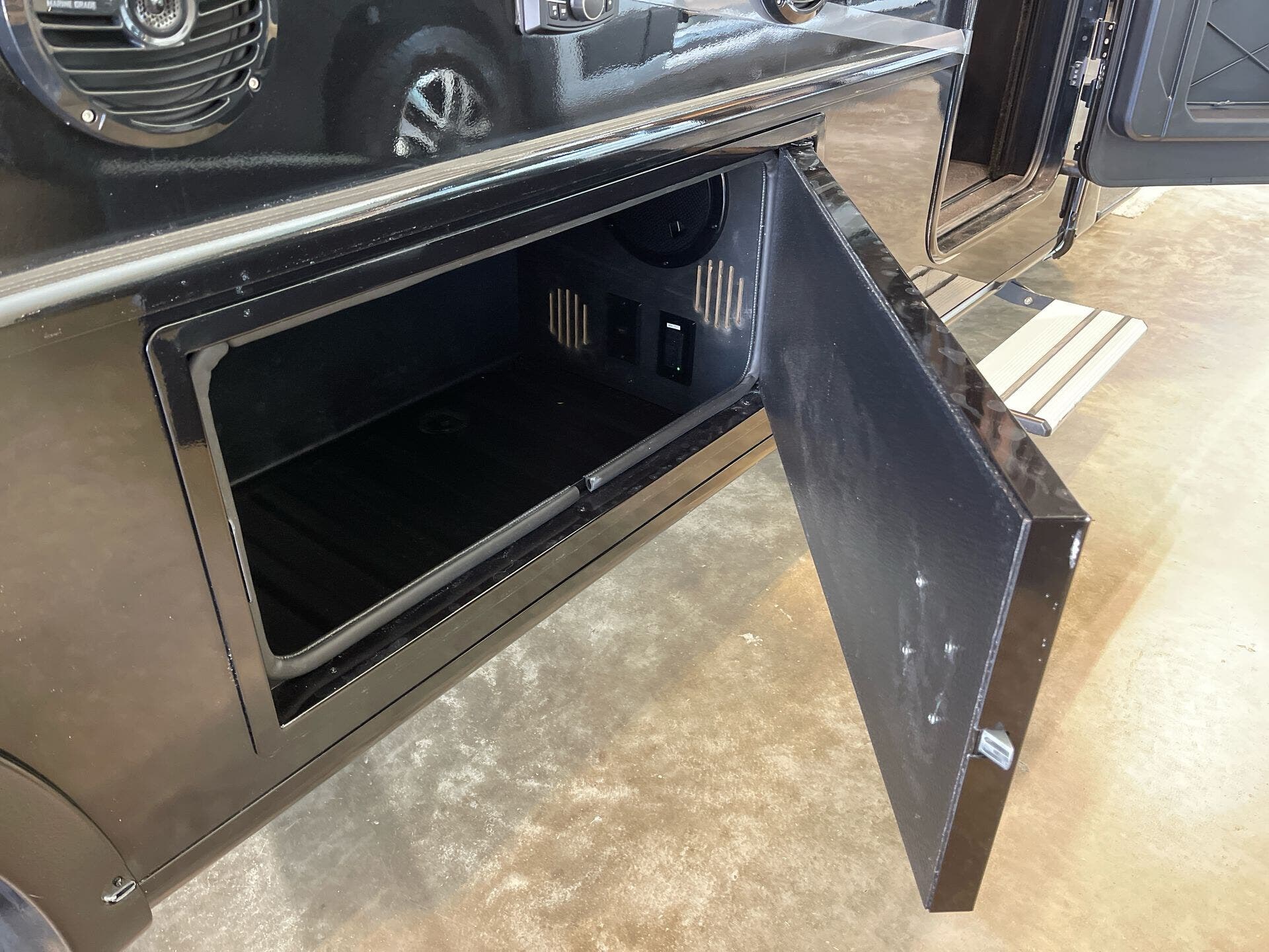 Premium touches abound: a 10 cu ft 12 V refrigerator, tankless water heater, SharkBite plumbing, integrated Starlink internet, Rockford Fosgate audio, Firefly Power system with lithium batteries, and a powerful 4.5 kW generator.