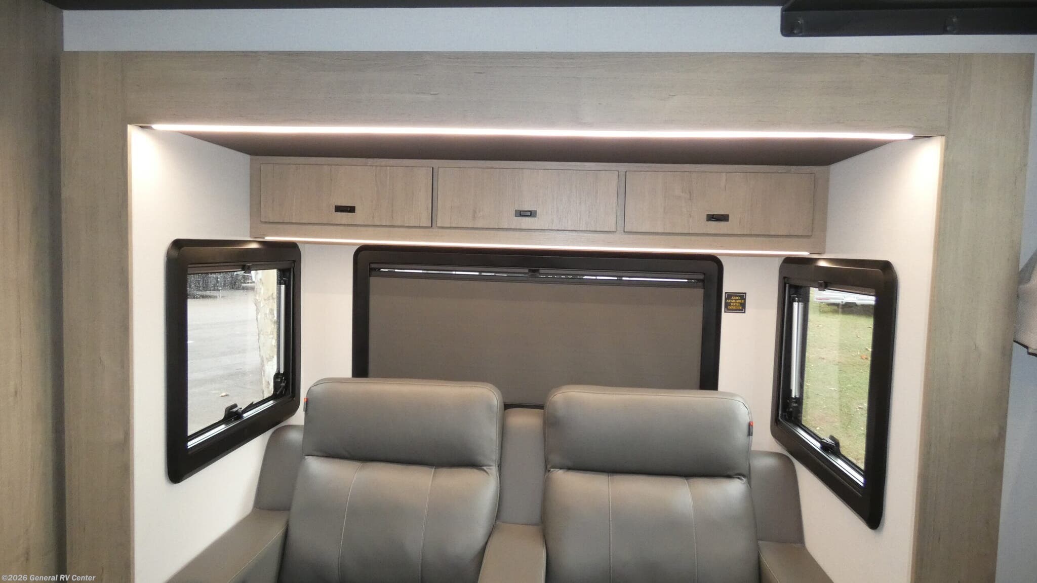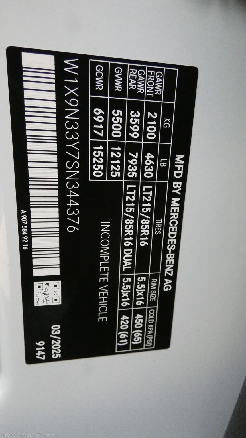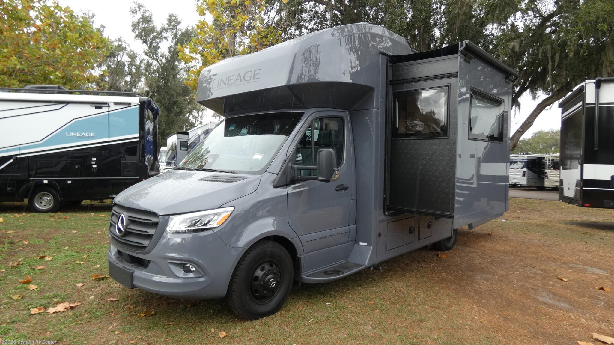 Grand Design Lineage Series M Class C diesel motorhome 25TK highlights: 10 cu. Refrigerator 16' Awning Full Bath Power Theater Seating Pantry Perfect for couples or families who love to travel in style, this motorhome has everything you wish for in a coach. The rear twin beds convert to a king-sized bed, providing a spacious and comfortable sleeping area for two. The full bathroom is equipped with everything you need for a comfortable stay, providing a convenient spot to freshen up after a long day of exploring. The kitchen is equipped with a 10 cu refrigerator for ample storage, a microwave, and a two-burner cooktop for trying out any trending recipe. In addition, the pantry provides more storage for food and cookware.The 32” smart TVs in the bedroom and living room provide endless entertainment options, while the power seating ensures comfortable viewing angles. The bunk over the cab provides additional sleeping space for kids or adults, and the exterior TV offers an ideal spot to enjoy your favorite shows or sports teams while outdoors. Grand Design's first motorized coach, the Lineage Series M is coming to you with luxurious features at a great value. This Class C diesel motorhome sits on a Mercedes-Benz sprinter chassis for quality and performance you can trust. True to Grand Design's foundation, the Lineage includes interior comforts, durable construction, innovative features, and attention to detail. The Series M Package includes natural teak wood grain, a Lineage Suspension Package, and more. There is also a Blackout Package with black aluminum wheels, a Chromeout Package with chrome aluminum wheels, plus additional packages to enhance your travel experience!
