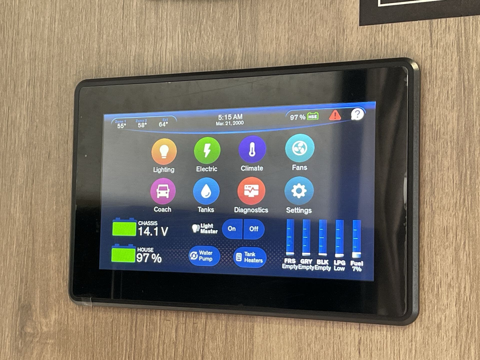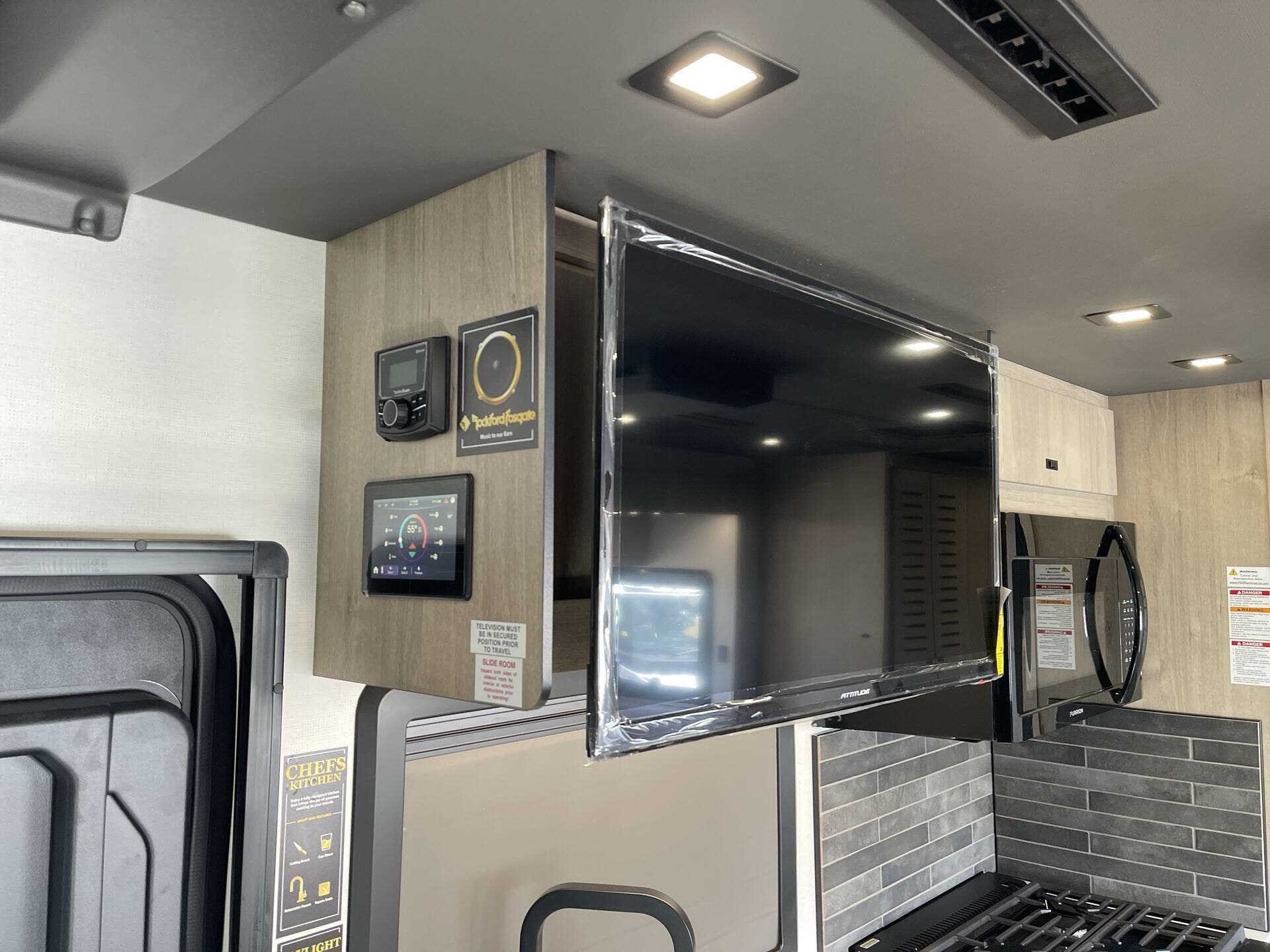 Backup Camera, CO Detector, Fire Extinguisher, LP Detector, Propane, Smoke Detector, TV -