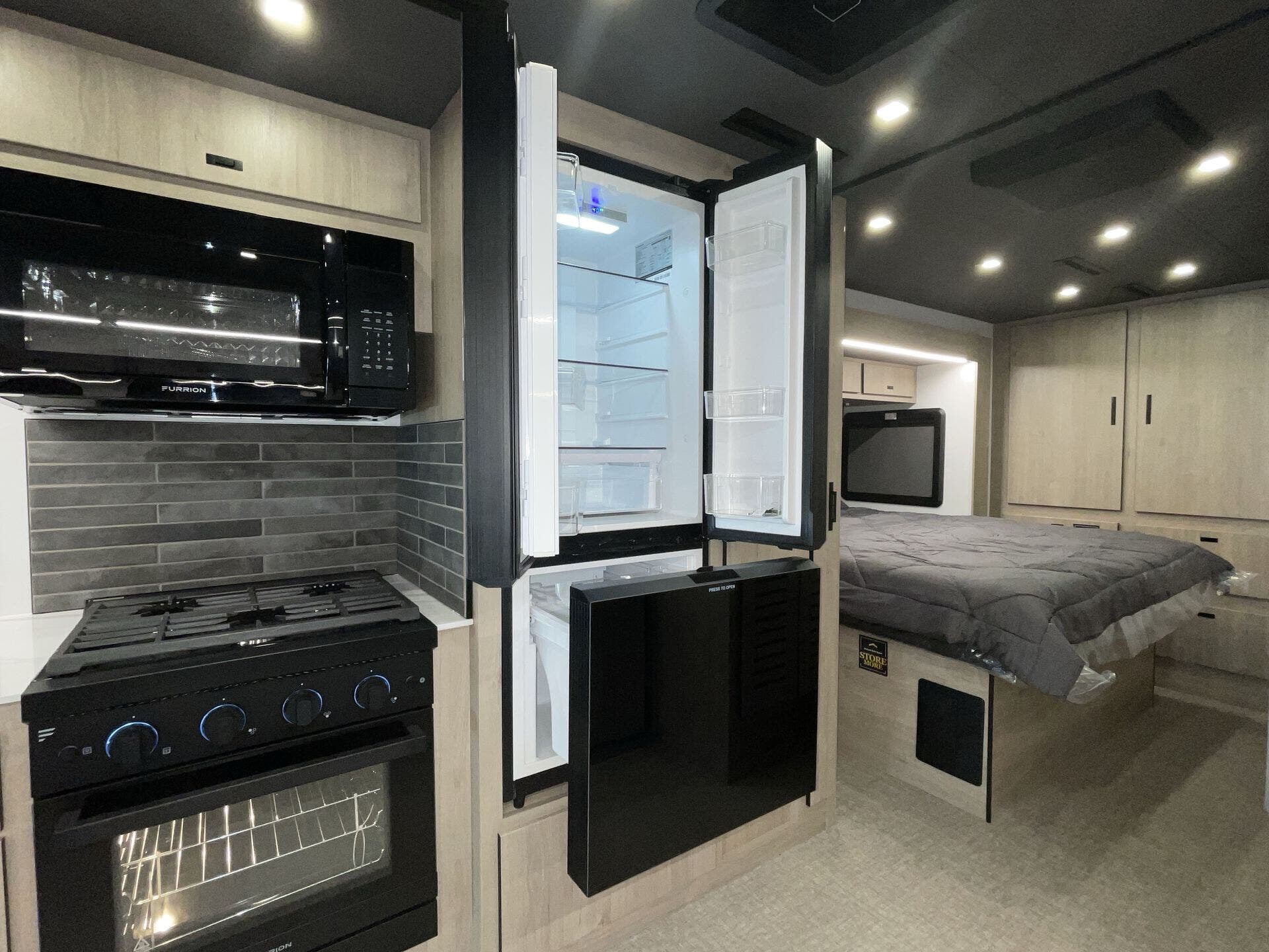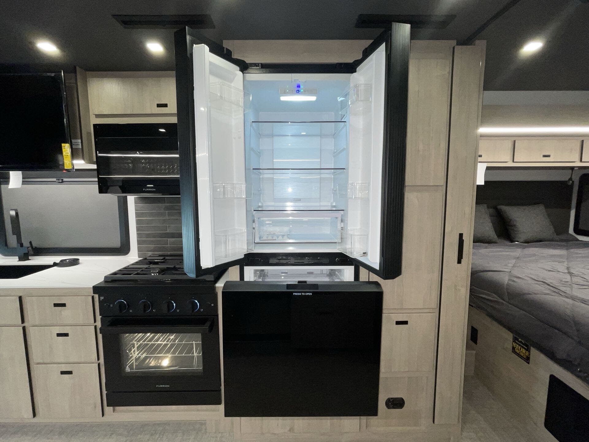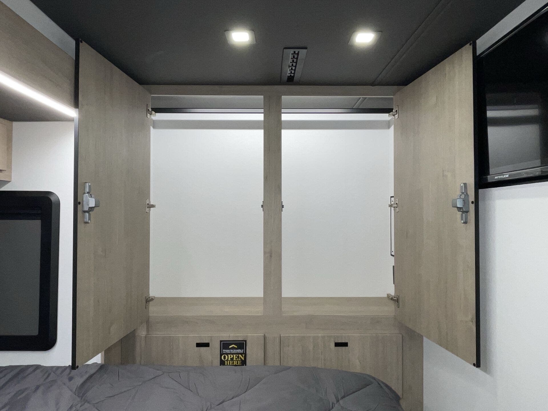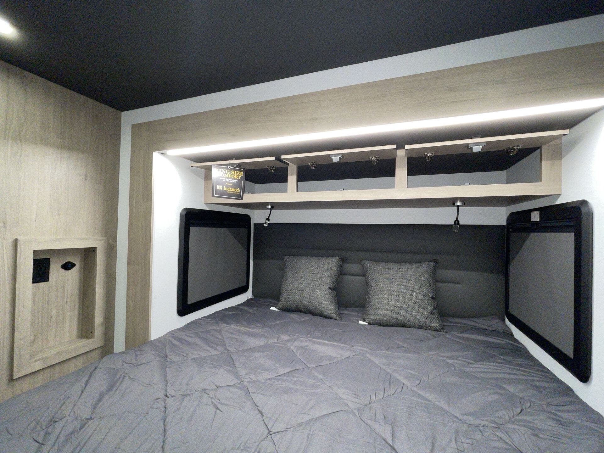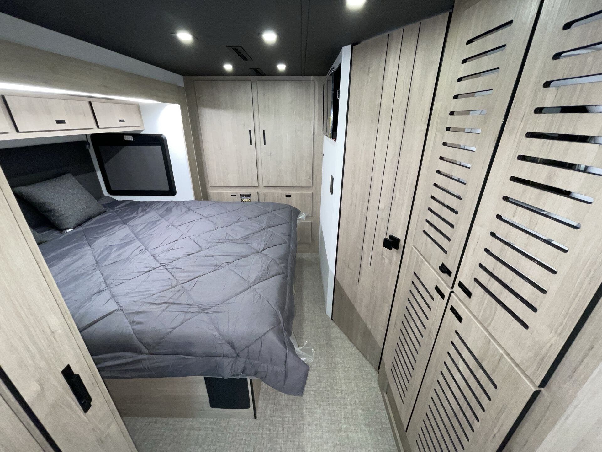 Booth Dinette, Bunk Beds, Day/Night Shades, Dinette Bed, King Size Bed, Kitchen Sink, Medicine Cabinet, Overhead Cabinetry, Pantry, Pet Friendly, Roof Vents, Shower, Toilet, Wardrobe(s) -