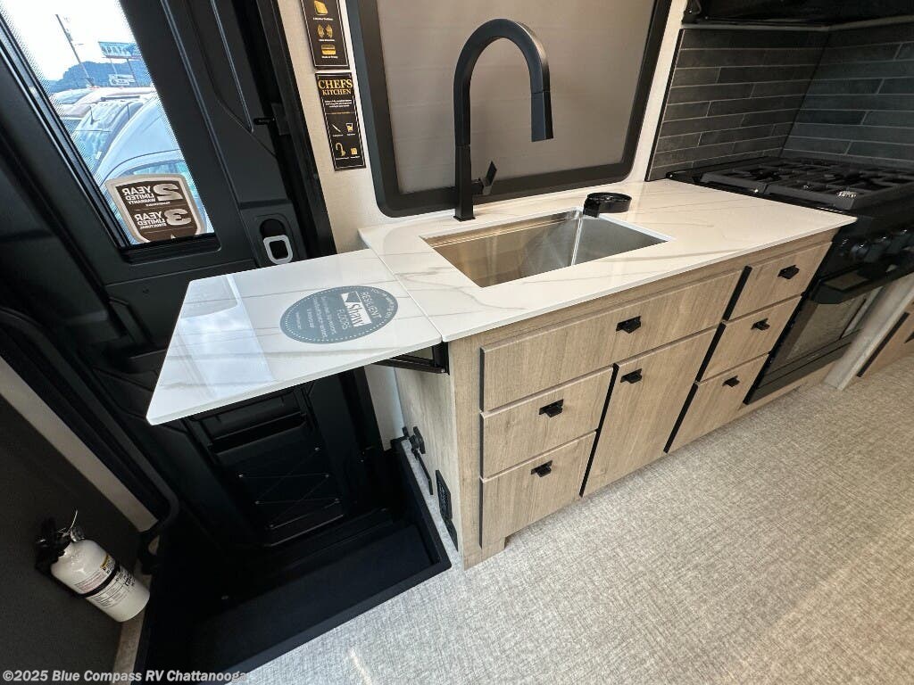 You can be sure to enjoy the journey and the stay in this coach! Once you stop for the day, you can make lunch with the kitchen appliances, then dine at the booth dinette within the large slide out. There is also power theater seating here across from a TV for easy viewing. A 10 cu. ft. 12V refrigerator and pantry will let you keep food stocked, and the closet with washer and dryer prep gives you the option to add these appliances. The 70" x 80" king bed slide is sure to provide a great night's rest, and there is a wardrobe to keep your things tidy. And of course, a full rear corner bath onboard makes staying fresh easier than ever!