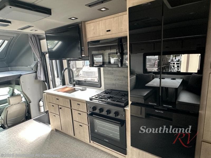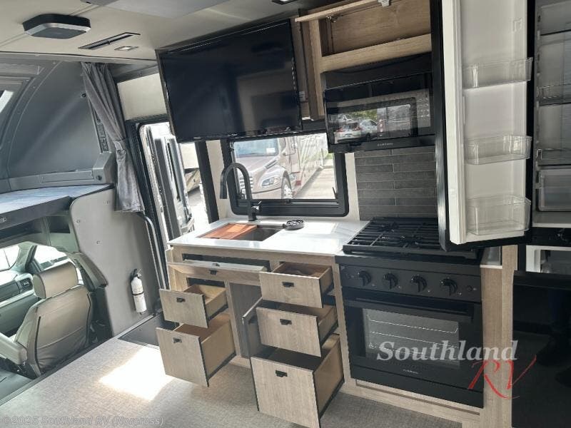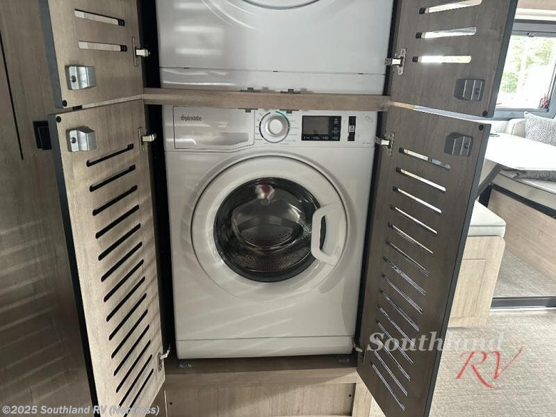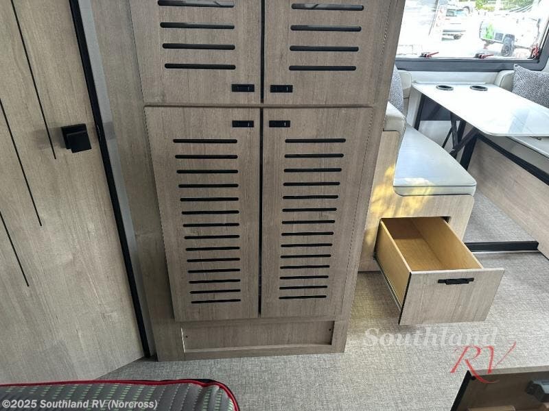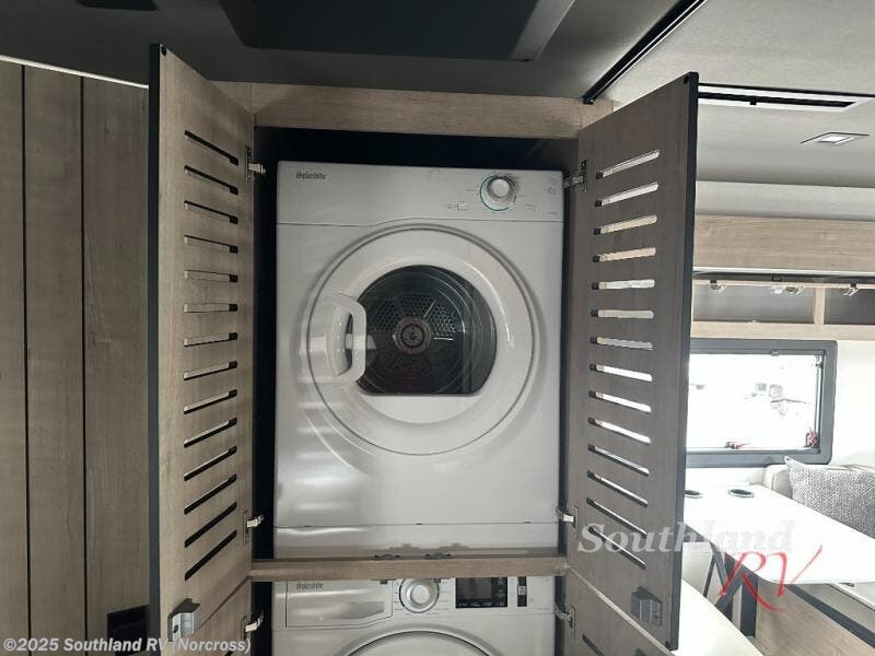 You can be sure to enjoy the journey and the stay in this coach! Once you stop for the day, you can make lunch with the kitchen appliances, then dine at the booth dinette within the large slide out. There is also power theater seating here across from a TV for easy viewing. A 10 cu. ft. 12V refrigerator and pantry will let you keep food stocked, and the closet with washer and dryer prep gives you the option to add these appliances. The 70" x 80" king bed slide is sure to provide a great night's rest, and there is a wardrobe to keep your things tidy. And of course, a full rear corner bath onboard makes staying fresh easier than ever!