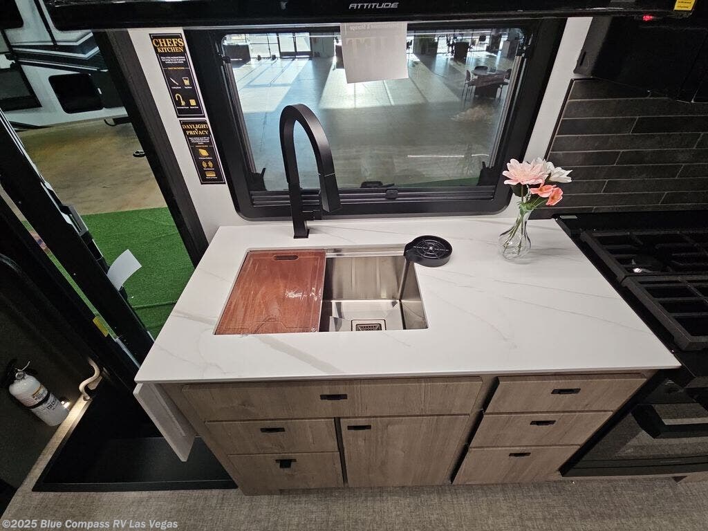 You can be sure to enjoy the journey and the stay in this coach! Once you stop for the day, you can make lunch with the kitchen appliances, then dine at the booth dinette within the large slide out. There is also power theater seating here across from a TV for easy viewing. A 10 cu. ft. 12V refrigerator and pantry will let you keep food stocked, and the closet with washer and dryer prep gives you the option to add these appliances. The 70" x 80" king bed slide is sure to provide a great night's rest, and there is a wardrobe to keep your things tidy. And of course, a full rear corner bath onboard makes staying fresh easier than ever!