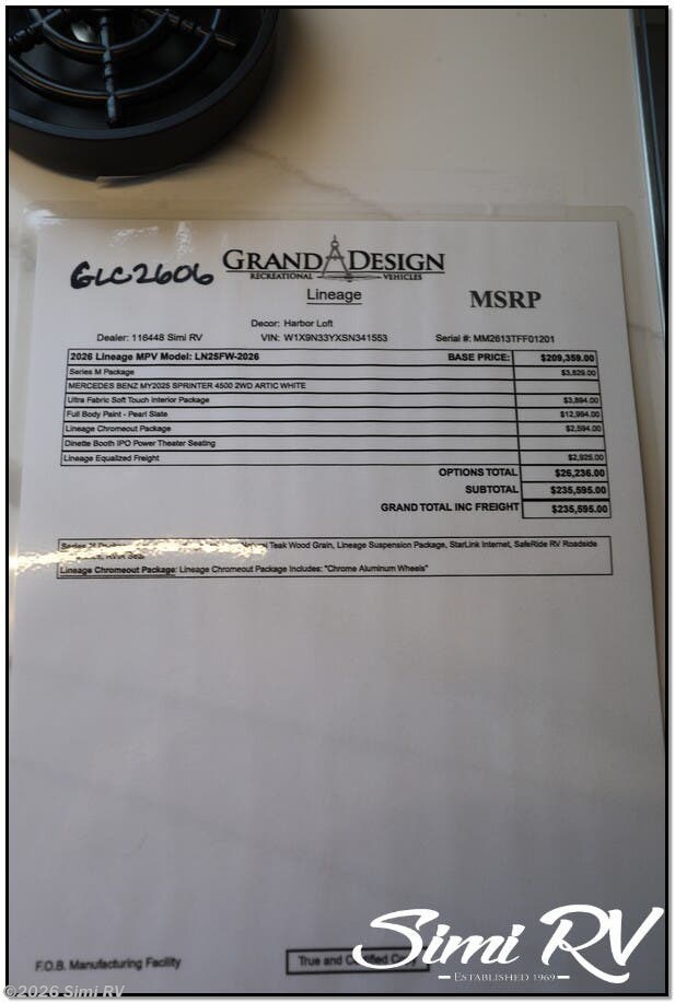 Request More Info on this 2026 Grand Design Lineage Series M 25FW Offered for sale by Simi RV