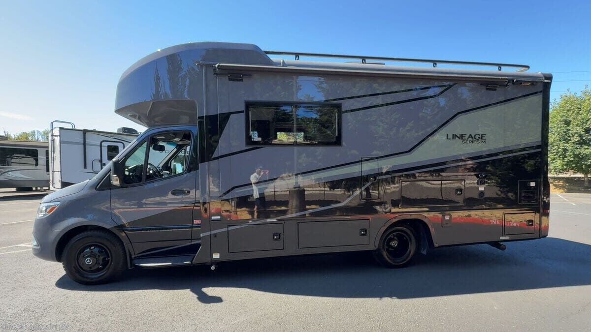 The 2026 Grand Design Lineage Series M FW is a state-of-the-art Class C RV that combines luxury, comfort, and advanced technology, making it an ideal choice for those who love to travel in style. Built on a robust Mercedes-Benz Sprinter 4500 Cab Chassis with a 170-inch wheelbase, this RV is designed for both performance and reliability. Its rear-wheel-drive system, coupled with a 2.0L Inline 4-Cylinder High Output Twin-Turbo Diesel engine, delivers 208 horsepower and 332 lb-ft of torque, ensuring a smooth and powerful ride. The 9G-Tronic automatic transmission and a 24.5-gallon fuel tank further enhance its driving efficiency. The exterior of the Grand Design Lineage Series M FW is both functional and stylish. It features a heavy-gauge aluminum-framed body with laminated block foam insulation and Azdel Onboard composite panels for superior durability and thermal efficiency. The textured fiberglass roof and rain gutters ensure protection against the elements, while the diamond shield paint protection keeps the exterior looking pristine. The RV is equipped with a Lippert SlimRack Slideout system and motion-lit rotocast storage compartments, providing ample space for all your travel essentials. Inside, the RV offers a luxurious living space with Shaw commercial-grade vinyl flooring and a soft-touch padded ceiling. The living area includes power reclining theater seating and dual composite sofa tables, perfect for relaxation. The natural teak wood grain cabinetry and solid maple dovetail drawer boxes add a touch of elegance, while the 4000k interior LED lighting package creates a warm and inviting atmosphere. Key features of the Grand Design Lineage Series M FW include: - **Driver Convenience and Safety:** - Active Brake Assist - Crosswind Assist - High Beam Assist - Electronic Stability Program (ESP) - Tire Pressure Monitoring System - High-performance LED headlamps - **Cab Features:** - Power, swivel, heated, lumbar support seats - MBUX 10.25-inch touchscreen multimedia system with Apple CarPlay and Android Auto - Adjustable, heated, leather steering wheel - Power remote heated side mirrors - **Living and Dining:** - Girard power armless awning with wind sensor - Dinette with a solid surface countertop and flip-up extension - Stainless steel sink with a matte black pullout faucet - 12v 10cf 3-door refrigerator and 2-burner cooktop - **Sleeping Arrangements:** - King bed with Indratech medium memory foam mattress - LED reading lights and USB charging ports - Underbed storage and wardrobe - **Bathroom:** - Lavatory with solid surface countertop and undermount stainless steel sink - Custom shower surround with matte black retractable shower door - Porcelain toilet and 12v power vent - **Electronics and Connectivity:** - Firefly Integrations touchscreen center - Starlink satellite internet - 32-inch 12v LED smart TV and Rockford Fosgate sound system - Exterior 40-inch 12v smart LED TV - **Mechanical and Utility:** - Three 180w Merlin solar panels (600w total) - Two 130Ah Lithionics batteries - 4.5k NPS LP generator with auto start capability - 1800w Xantrex pure sine wave inverter The 2026 Grand Design Lineage Series M FW is a perfect blend of luxury and practicality, offering everything you need for an unforgettable travel experience. Whether you're exploring the open road or setting up camp, this RV ensures you do so with comfort and style.