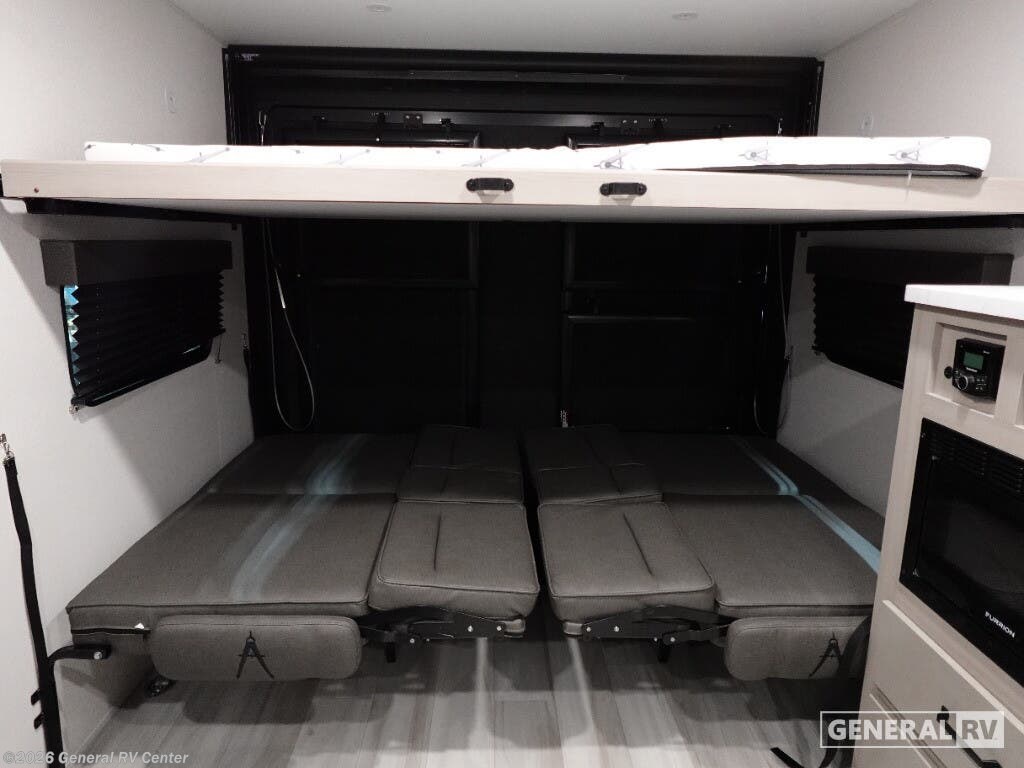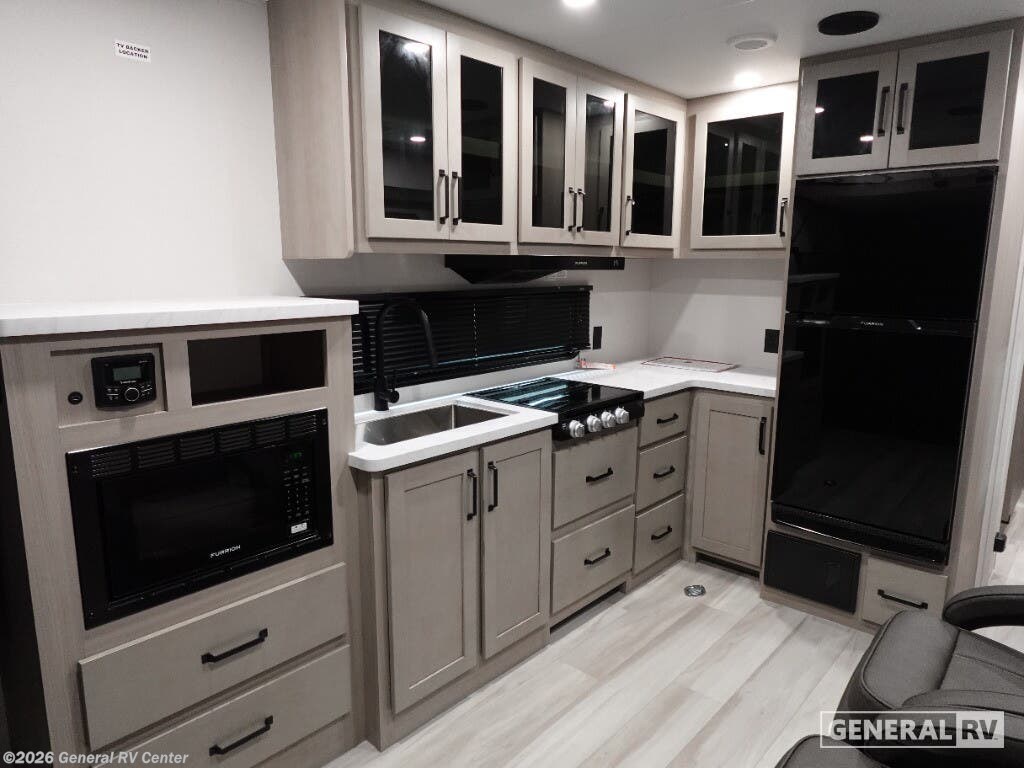 Step into the future of adventure with the 2026 Grand Design Momentum MAV 27MAV. This RV is designed to elevate your travel experiences with its thoughtful layout and impressive features. At 32 feet in length, it offers a spacious haven for up to six people, making it perfect for family getaways or trips with friends. The dual queen beds and convertible sleeping area ensure everyone rests comfortably after a day of exploration. With a 13' 6" garage, you have ample space to bring along your favorite toys, whether it's bikes or outdoor gear, making every journey an exciting adventure. The interior of the Momentum MAV 27MAV is a blend of style and functionality. The center kitchen is equipped with a mid-size refrigerator and a three-burner cooktop, ready to handle all your culinary needs. The rear living area, complete with a rollover sofa and table, provides a cozy spot to relax or entertain. The front bedroom offers a private retreat with a queen bed, while the center bath ensures convenience with its curtain shower. The 19-foot powered retractable awning extends your living space outdoors, perfect for enjoying the fresh air while being sheltered from the elements. With a robust fresh water capacity of 90 gallons and ample storage, this RV is designed to support extended adventures. Visit your nearest General RV dealership to explore the possibilities with the Momentum MAV 27MAV.