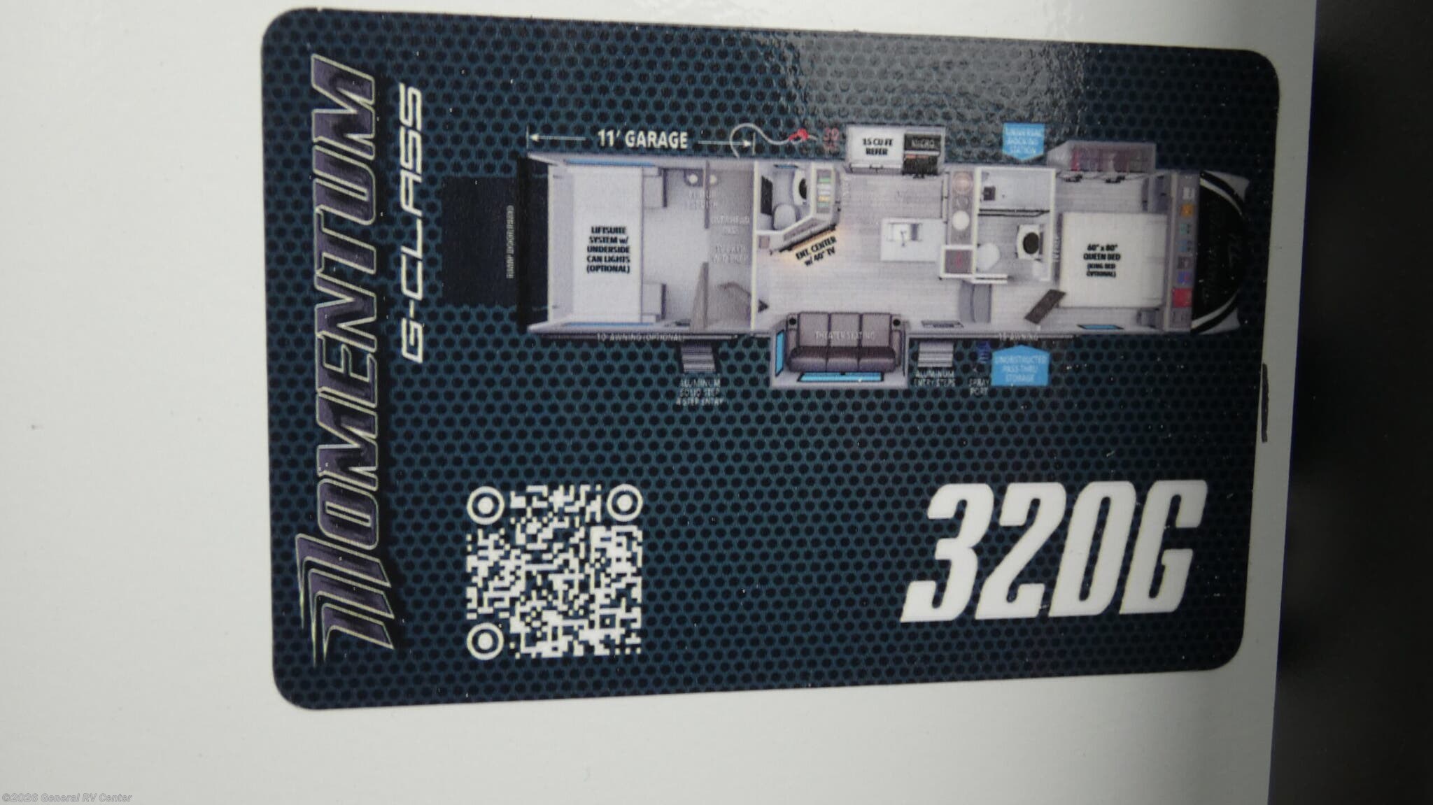 Experience the ultimate in luxury and versatility with the 2026 Grand Design Momentum G-Class 320G. This stunning toy hauler is designed for adventurers who crave comfort without sacrificing functionality. At 36.25 feet in length, it offers a spacious and inviting environment, perfect for families or groups of up to seven. The interior boasts a center kitchen with a full-size electric refrigerator and a four-burner cooktop, making meal prep a breeze. Enjoy the convenience of convection cooking and a generous 110-gallon fresh water capacity, ensuring you’re well-equipped for extended journeys. The 320G floorplan is thoughtfully designed to maximize space and comfort. Relax in the center living area with plush theater seating, or retire to the front bedroom where a cozy queen or optional king bed awaits. The 11-foot garage is not only a versatile storage solution but also doubles as additional sleeping space with Happi-Jac rollover sofas and an optional top bed. An 18-foot powered retractable awning provides ample outdoor living space, perfect for enjoying scenic views. With its automatic heater and washer/dryer prep, this RV ensures you stay comfortable and connected no matter where the road takes you. For more details and to explore this model in person, visit your nearest General RV Dealership Location.