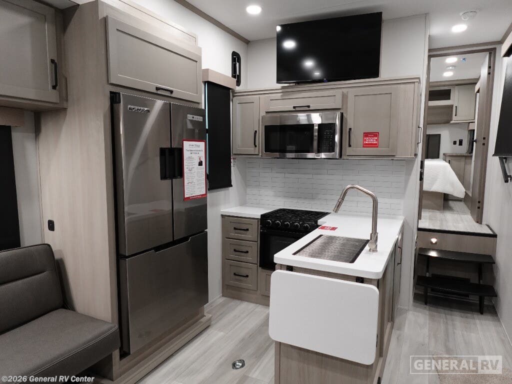 Step into the 2026 Grand Design Momentum G-Class 325G, where adventure meets luxury in a seamless blend of comfort and functionality. This RV is designed to be your ultimate travel companion, offering ample space for up to eight guests. With a queen bed, king bed, and a convertible option, everyone can rest easy after a day of exploration. The center kitchen and living area provide a cozy yet spacious environment, featuring a full-size electric refrigerator and a four-burner cooktop, perfect for whipping up your favorite meals on the road. The inclusion of convection cooking and washer/dryer facilities ensures that convenience is always at your fingertips. The thoughtful layout showcases a 15-foot garage, ideal for storing your outdoor gear, while the dual powered awnings create a perfect outdoor space for relaxation. The automatic heater and 75-amp electrical service ensure you stay comfortable no matter the weather. With a fresh water capacity of 160 gallons, and ample gray and black water storage, your off-grid adventures can last longer. The Momentum G-Class 325G is more than just an RV; it's a mobile sanctuary designed to enhance every journey. For more details, visit your nearest General RV dealership and start your adventure today!