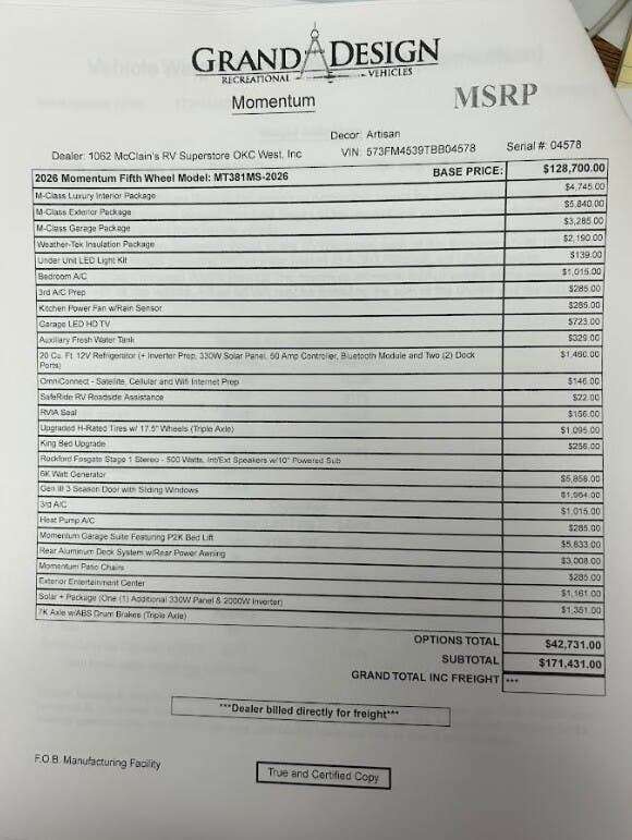 Request More Info on this 2026 Grand Design Momentum 381MS Offered for sale by McClain's RV Oklahoma City