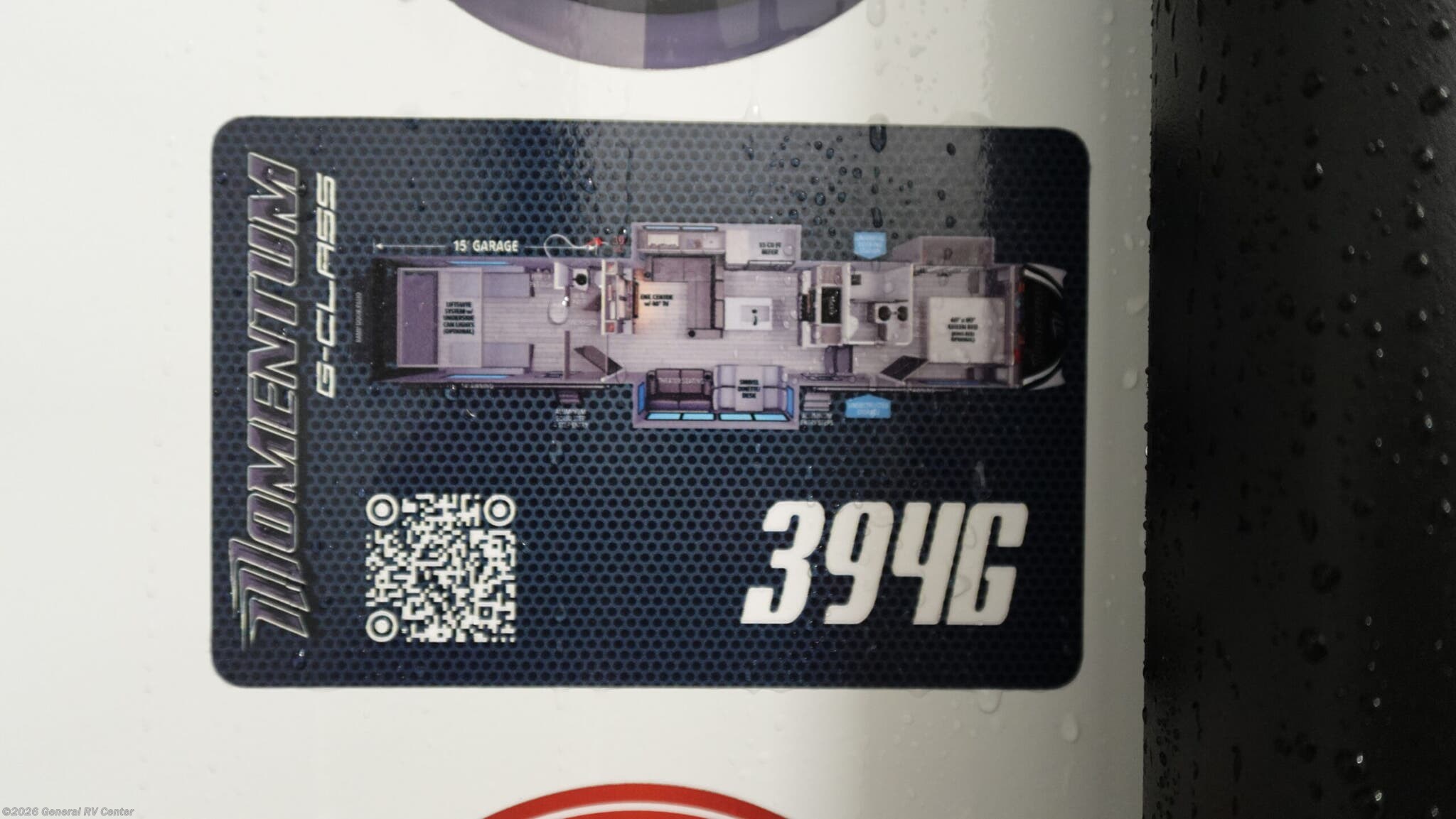 **Grand Design Momentum G-Class toy hauler 394G highlights:** * 15' Separate Garage * Fireplace * Private Bedroom * Dual Entry Doors A 15' separate garage in this toy hauler offers plenty of space for your off-road toys! You will appreciate the convenience of having a full bathroom with a walk-in shower and there is washer and dryer prep so you can accommodate these appliances. You will also appreciate the two entry doors, and flip-up pet dish. The rear ramp door can even be converted into a patio, plus there are exterior speakers to keep the party going. Everyone will love hanging out in the separate living area with a fireplace at the entertainment center, theater seating, and a sectional sofa. The fully equipped kitchen has everything you need to prepare delicious home cooked meals. The front private bedroom offers an escape to rest and relax on a queen bed for the next ride! Are you looking for adventure and fun? The Momentum G-Class toy hauler by Grand Design will help you find it! You can explore during any season you choose with the Insulation Package that includes a heated and enclosed underbelly with suspended tanks, a high-capacity furnace, a moisture barrier floor enclosure, and cabinet-mounted heat ducts. Each model includes a high capacity water pump, a dovetail rear end, and 2,500-LB tie-downs anchored into the chassis. Throughout the Momentum G-Class interior, you'll enjoy many comfortable features like large panoramic windows, a shower skylight, USB chargers in the bedroom, and residential cabinetry.