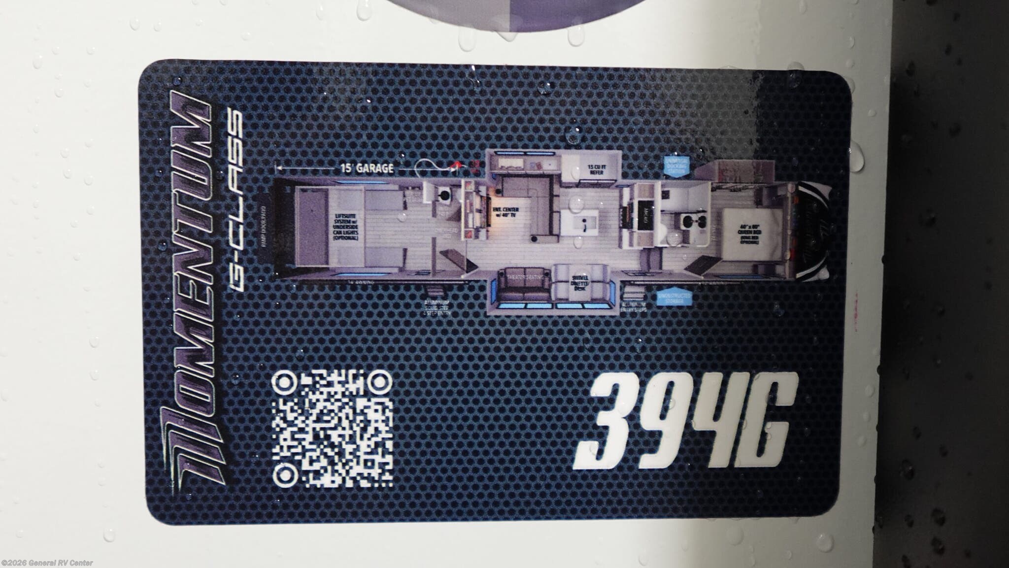 **Grand Design Momentum G-Class toy hauler 394G highlights:** * 15' Separate Garage * Fireplace * Private Bedroom * Dual Entry Doors A 15' separate garage in this toy hauler offers plenty of space for your off-road toys! You will appreciate the convenience of having a full bathroom with a walk-in shower and there is washer and dryer prep so you can accommodate these appliances. You will also appreciate the two entry doors, and flip-up pet dish. The rear ramp door can even be converted into a patio, plus there are exterior speakers to keep the party going. Everyone will love hanging out in the separate living area with a fireplace at the entertainment center, theater seating, and a sectional sofa. The fully equipped kitchen has everything you need to prepare delicious home cooked meals. The front private bedroom offers an escape to rest and relax on a queen bed for the next ride! Are you looking for adventure and fun? The Momentum G-Class toy hauler by Grand Design will help you find it! You can explore during any season you choose with the Insulation Package that includes a heated and enclosed underbelly with suspended tanks, a high-capacity furnace, a moisture barrier floor enclosure, and cabinet-mounted heat ducts. Each model includes a high capacity water pump, a dovetail rear end, and 2,500-LB tie-downs anchored into the chassis. Throughout the Momentum G-Class interior, you'll enjoy many comfortable features like large panoramic windows, a shower skylight, USB chargers in the bedroom, and residential cabinetry.
