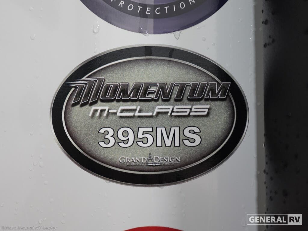 Grand Design Momentum M-Class toy hauler 395MS highlights: 14' Separate Garage L-Shaped Pull-Out Sofa Theatre Seating Free Standing Dinette Dual Entry Doors Universal Docking Station You want a toy hauler to carry your toys to the trails, and include many at-home comforts, and that's just what this unit delivers. A 14' separate garage includes an adjustable tie-down system, an optional Lifesuite System for more sleeping space, an optional half bath, plus washer and dryer prep. There is an overhead loft bed and an L-shaped sofa with recline in the main living area that offers sleeping space as well. Everyone can watch a movie on the LED TV with a fireplace below while sitting on the sofa, in the theatre seats, or while at the free standing dinette with four chairs. The chef will have upgraded appliances to make meals for everyone, an L-shaped countertop with a kitchen sink, and a USB charging outlet. You will love the shower with seat in the full bathroom with two space savings sliding doors that lead into the hallway, and into the front bedroom where you will have a walk-around queen bed, a slide out wardrobe and more USB charging outlets. With any Momentum M-Class toy hauler by Grand Design, you will enjoy luxury at every turn! They have been constructed to a superior standard with a thermal roof design, triple insulated main floor and garage floor, and a Rail-Tite underbelly seal that will allow you to camp in all elements. Each model also features an 8' 5" wide body chassis with a wide rail design, no wheel wheels, and a dovetail entry for easier loading. The Stealth A/C system provides maximum cooling power, and the CRE3000 suspension system means you can enjoy a smooth tow each time. You will love the luxurious interior with a professional grade stainless steel cooktop, interior color changing LED accent lighting, a fiberglass shower with a glass door, and solid surface countertops.