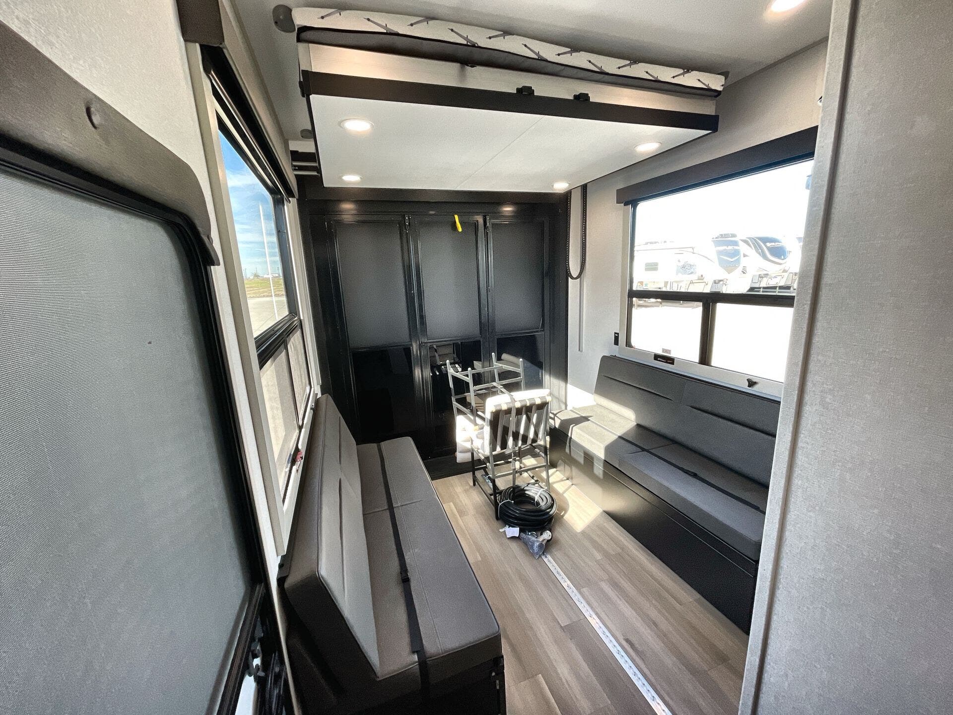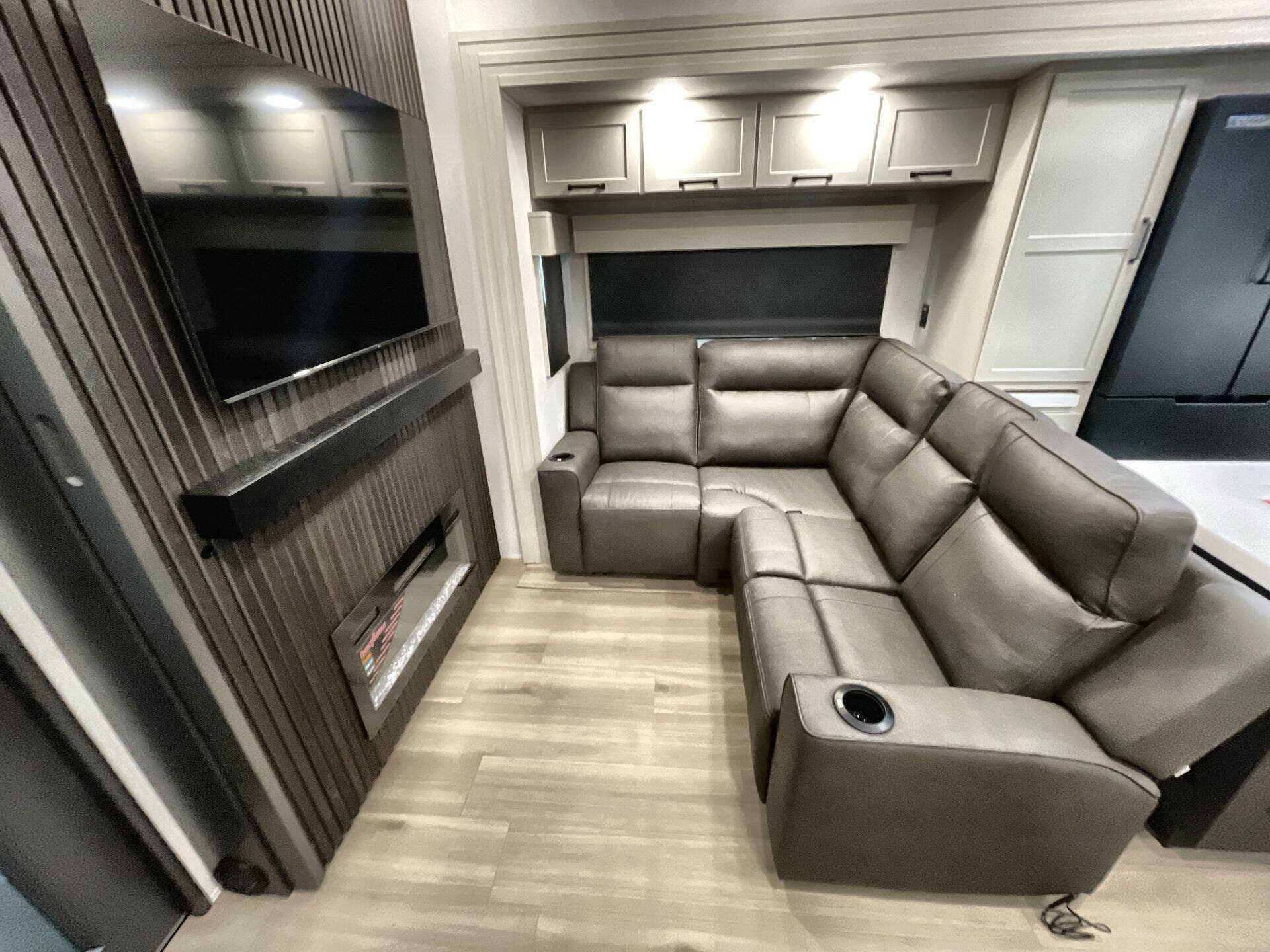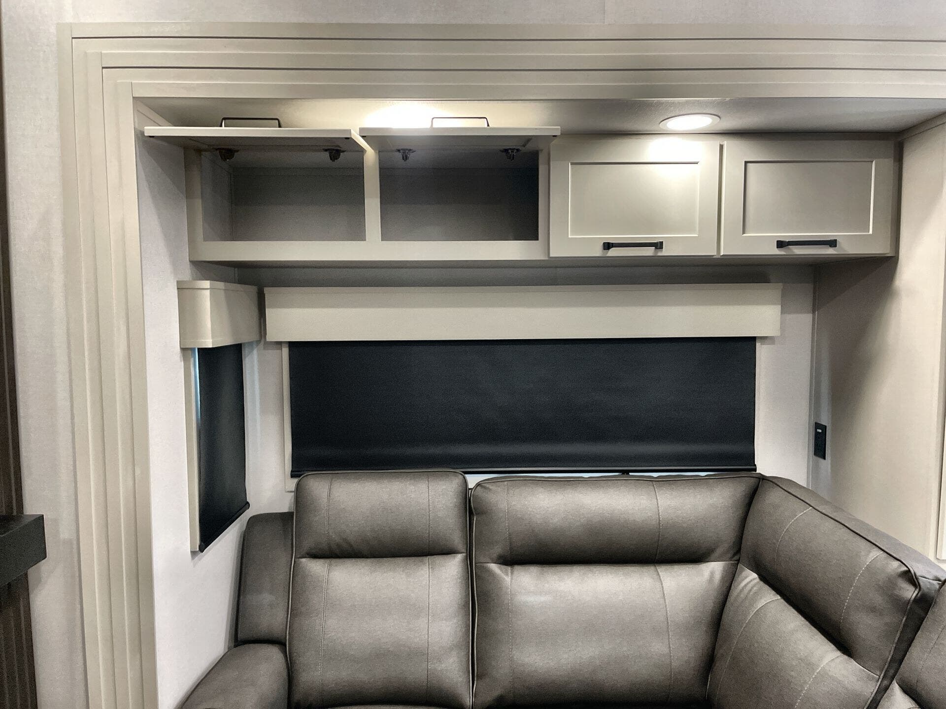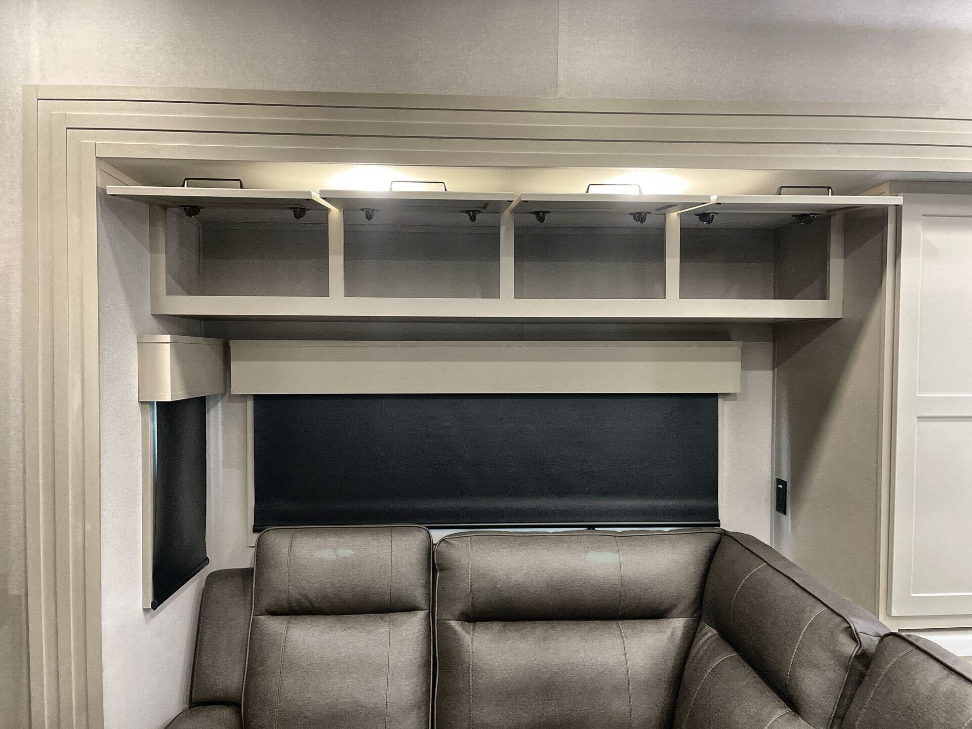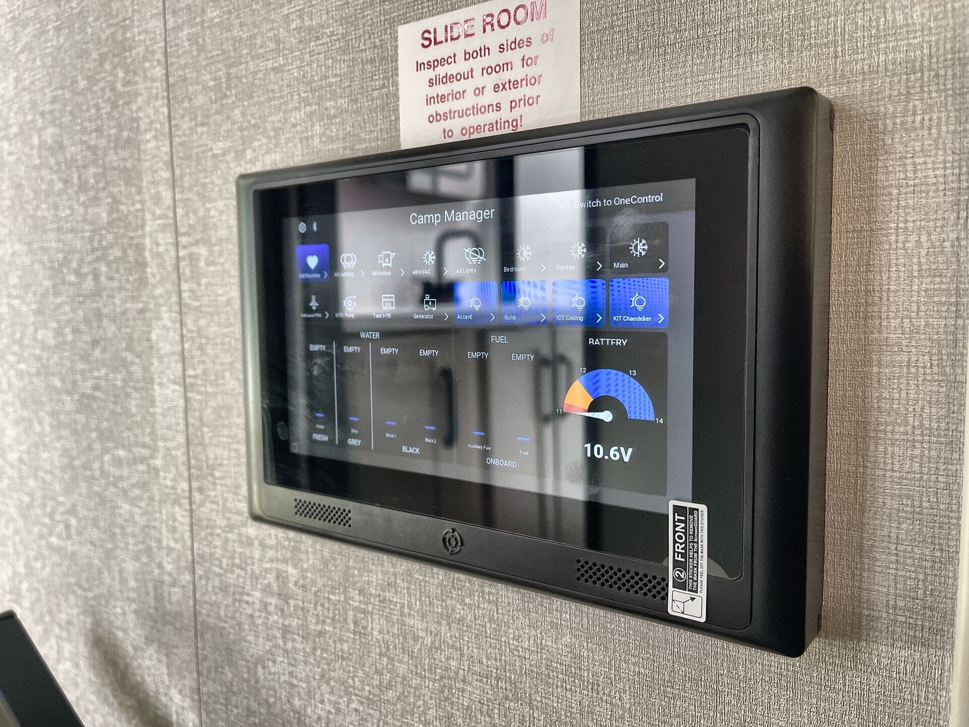 The Momentum 395MT prioritizes comfort with a well-equipped kitchen that includes a microwave, oven, refrigerator, stove, and a dependable water heater, ensuring you can prepare meals on the go. Climate control is supported by an air conditioning system, while safety is enhanced by a full suite of detectors and alarms, including CO, LP, and smoke detectors, along with a fire extinguisher. Entertainment and convenience are covered with a stereo system and a TV, creating a home-away-from-home atmosphere for family nights on the road.