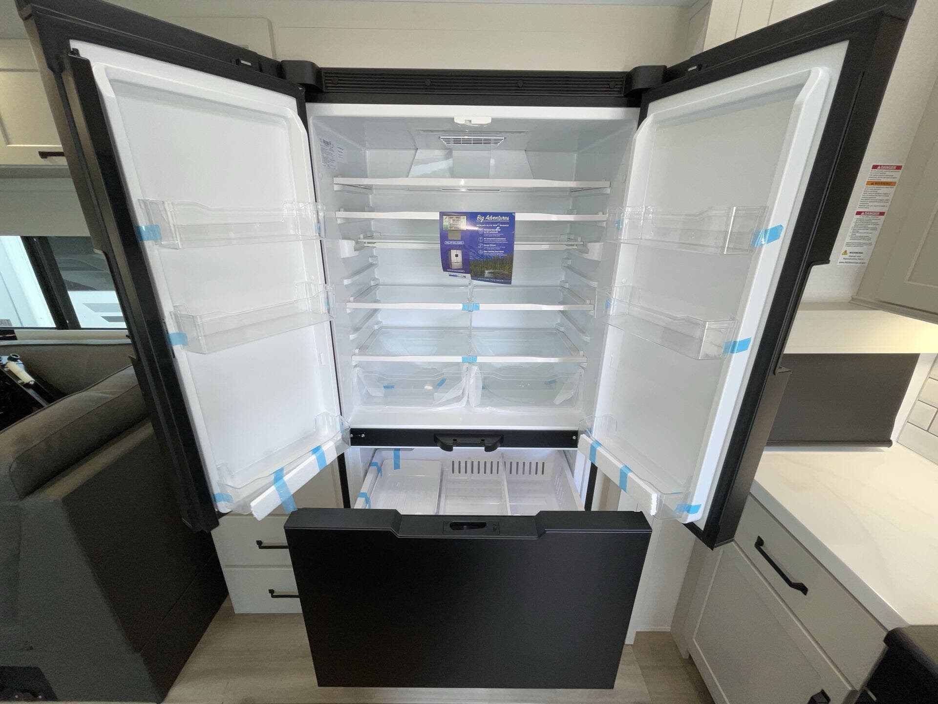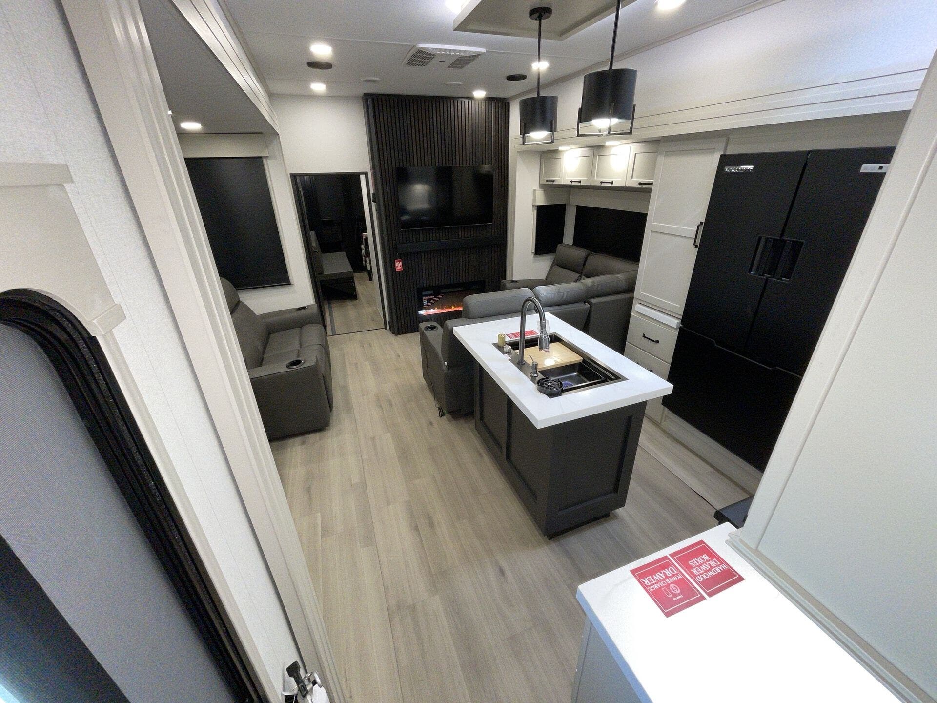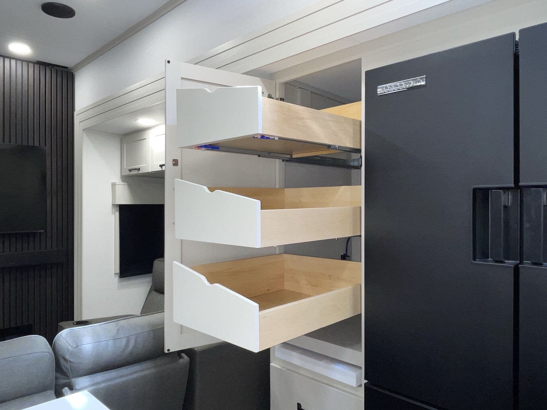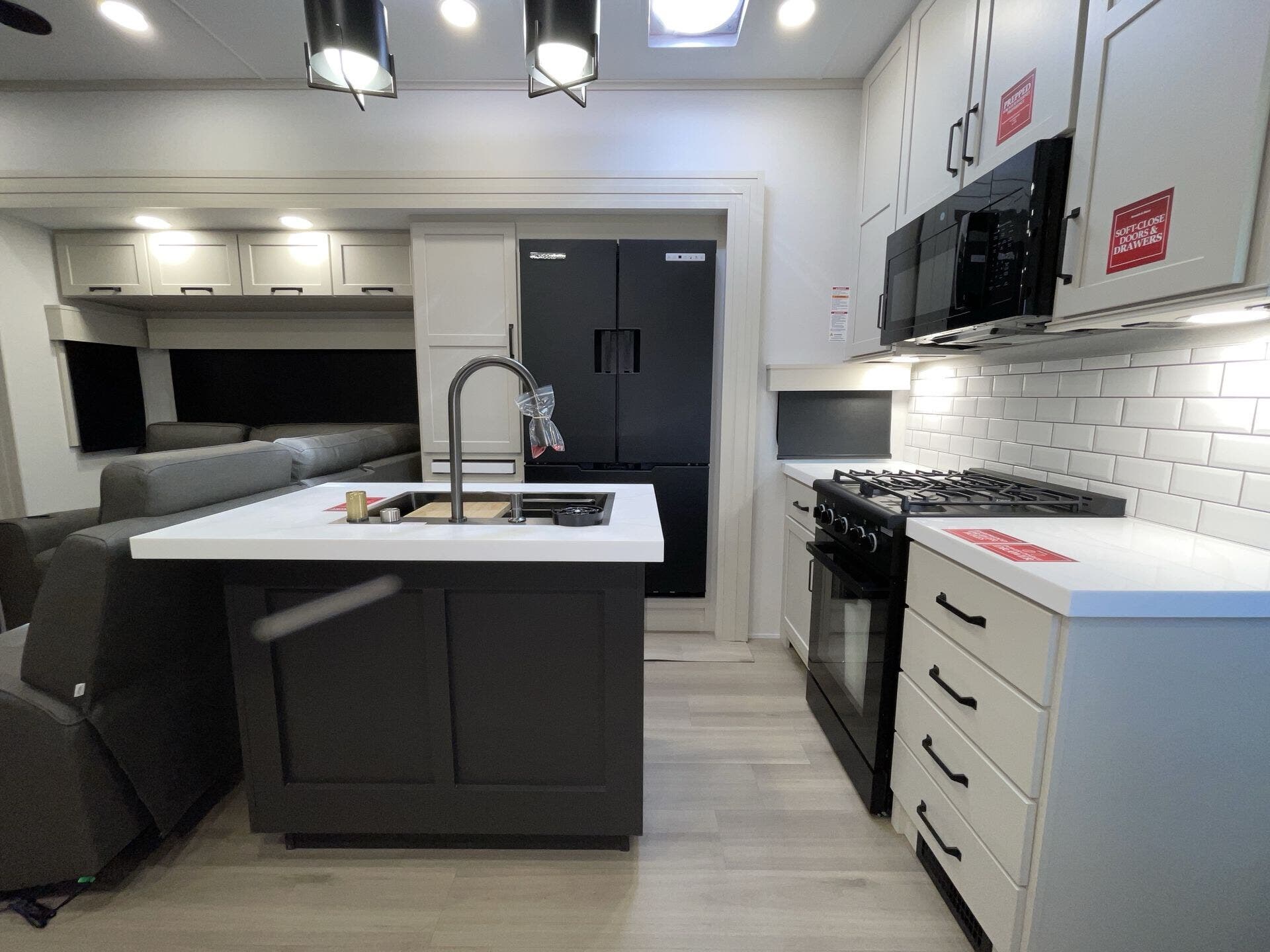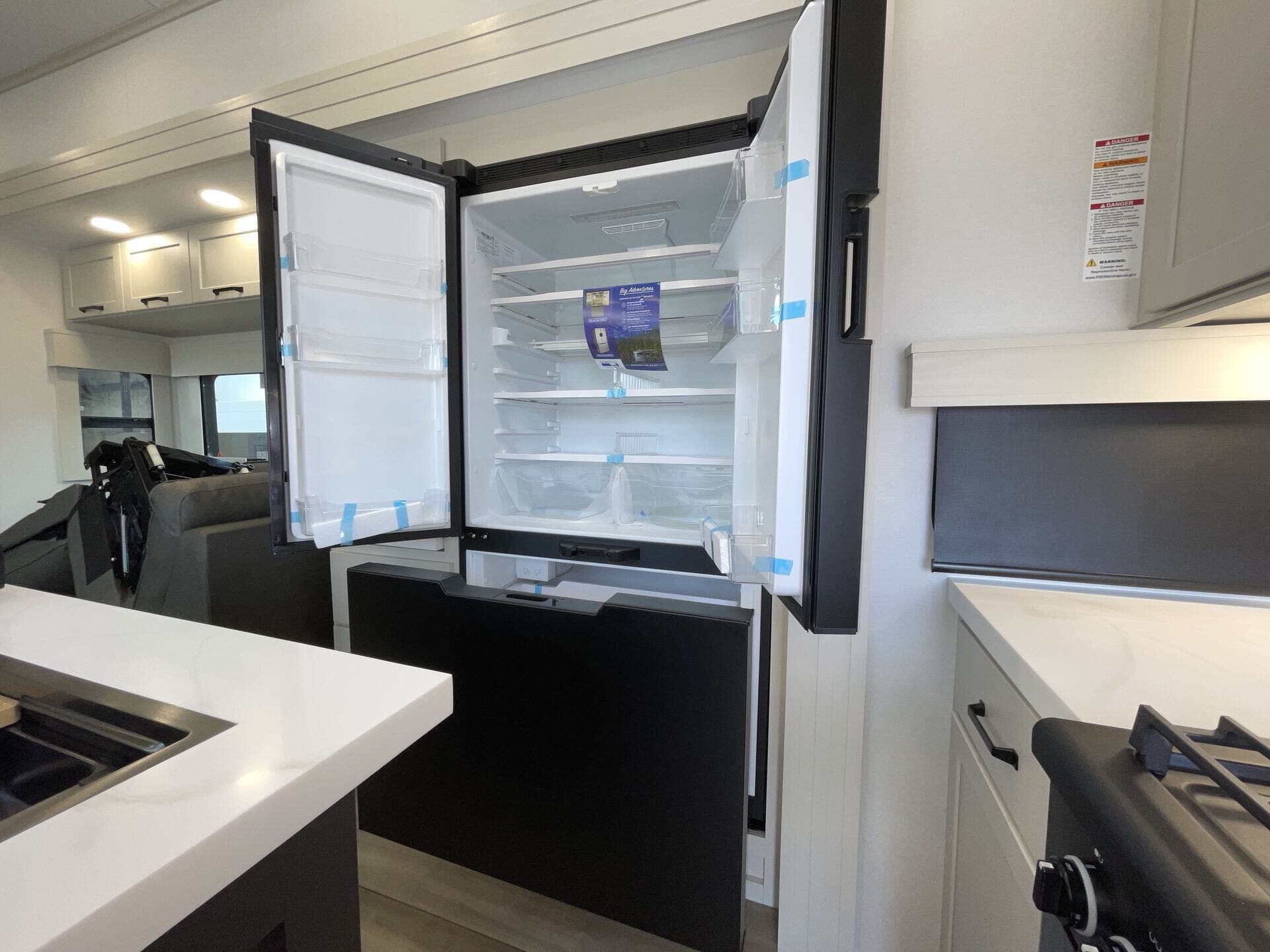 Slide-outs truly open up the kitchen and living area so you’re not bumping elbows while cooking or hanging out. The kitchen itself is spacious with an island that gives you real prep space and storage — not just a corner to heat and eat. The big fridge and practical layout make it easy to cook real meals on the road, not just reheat.