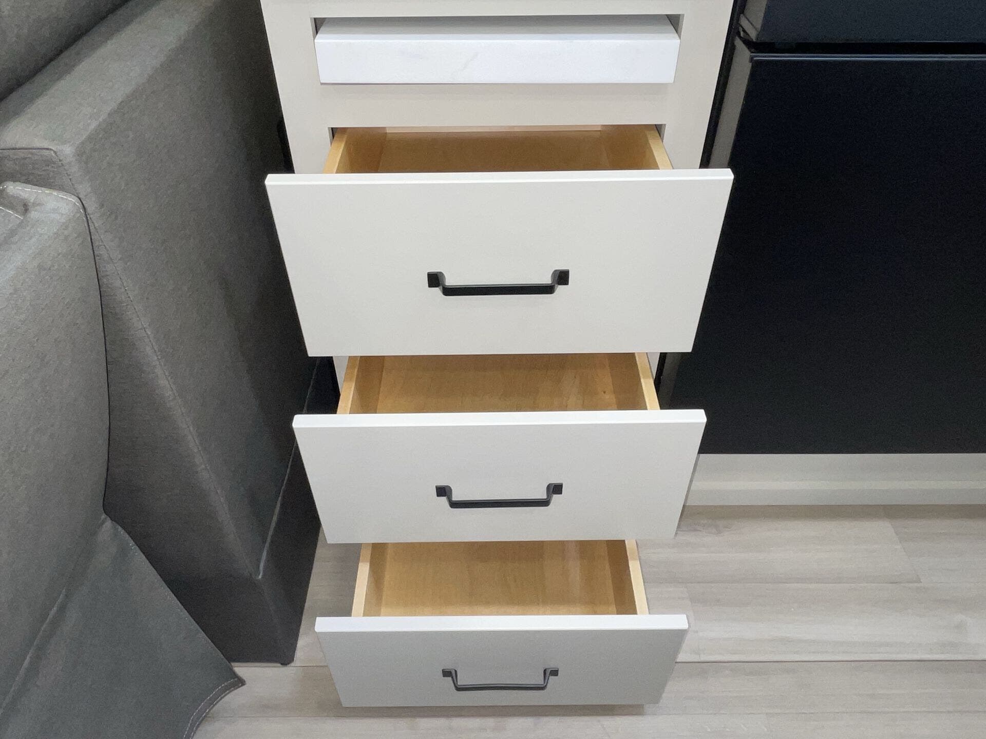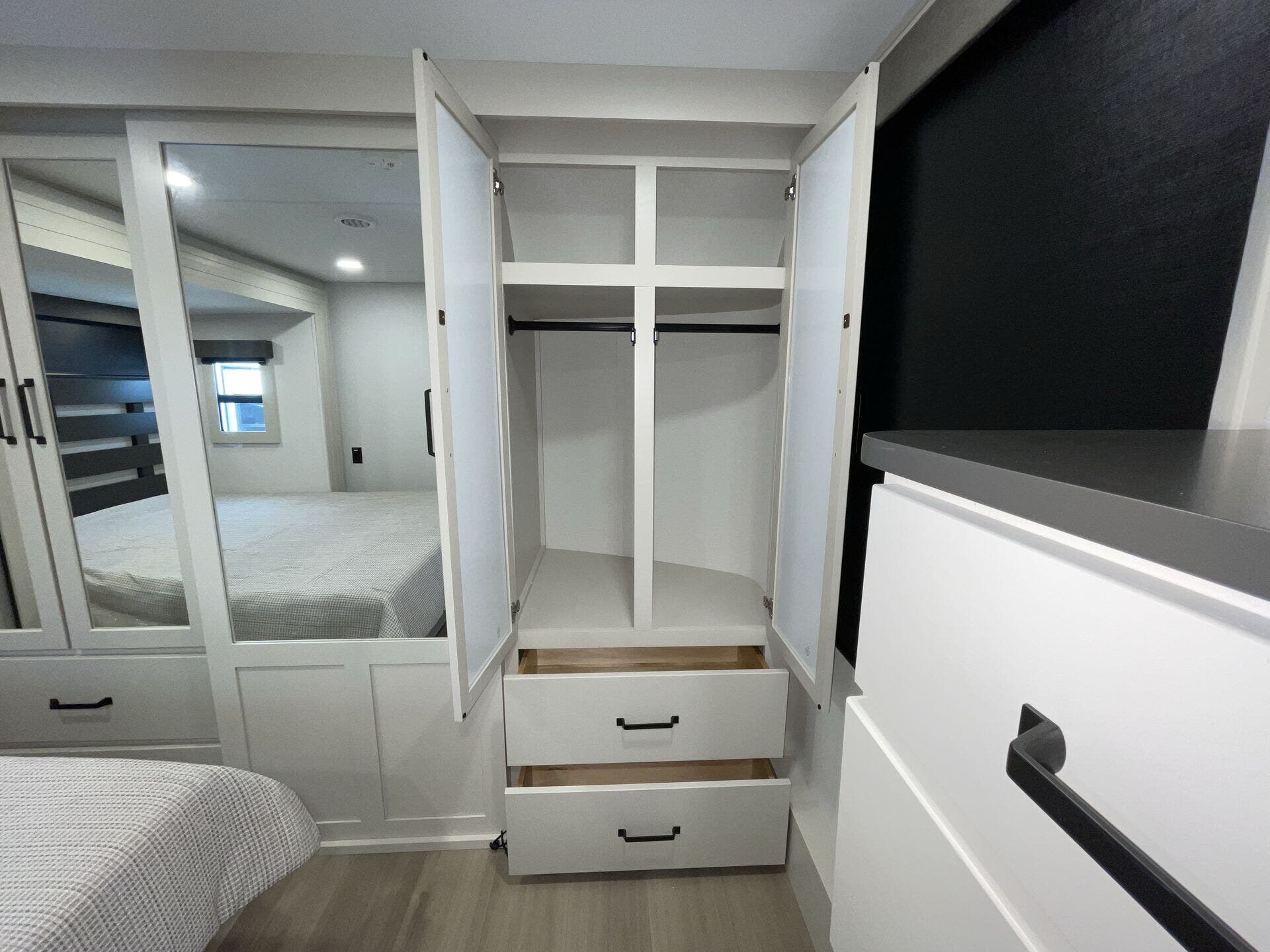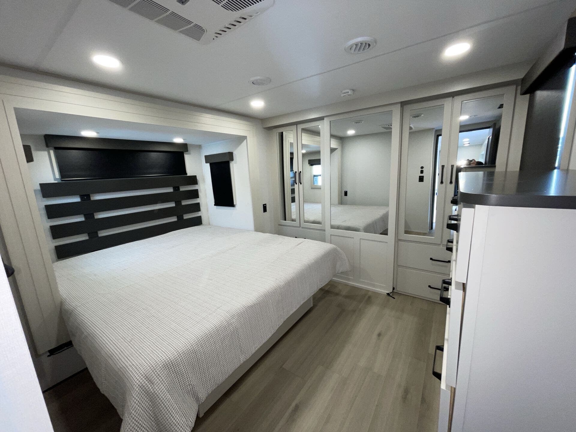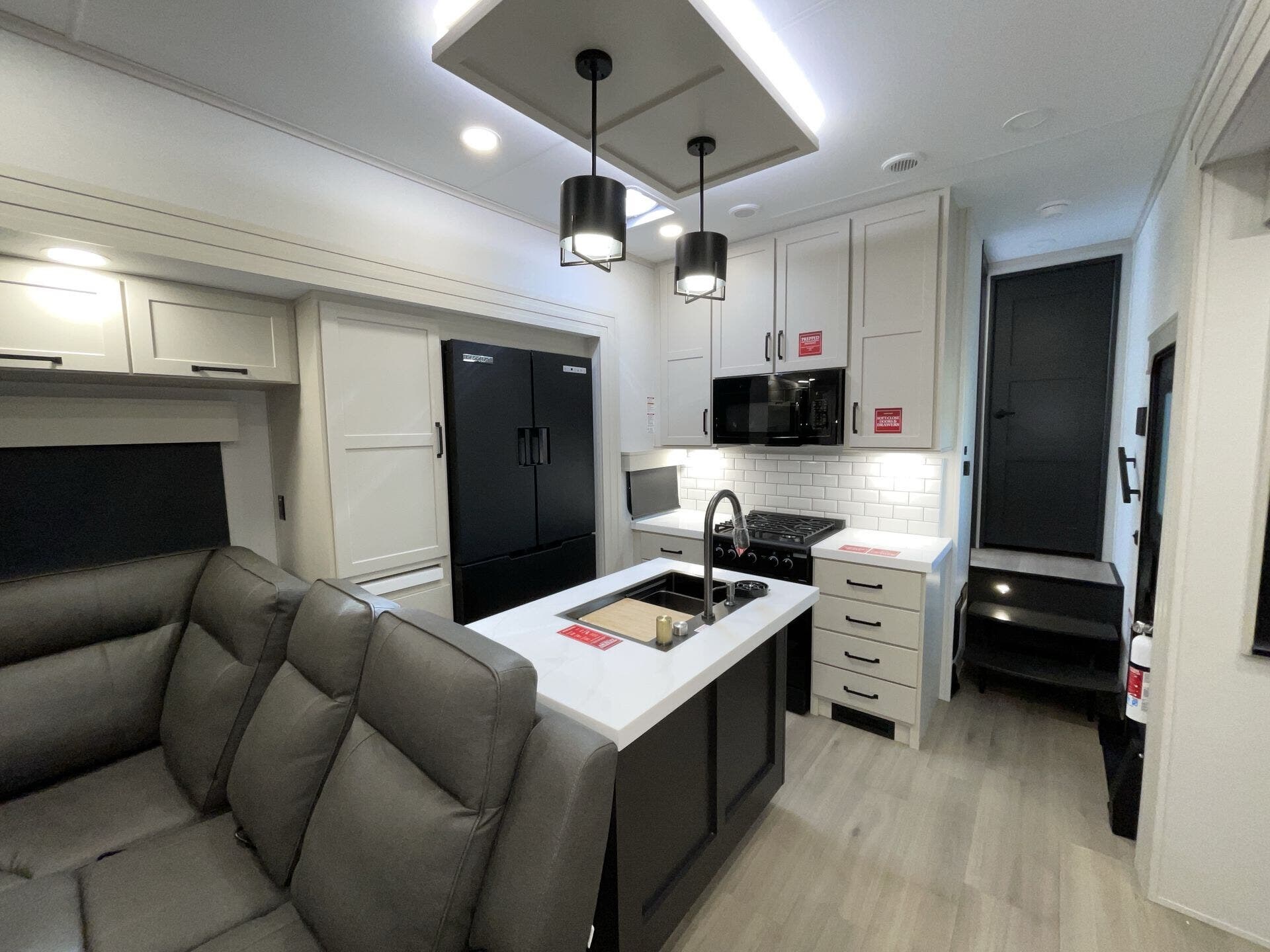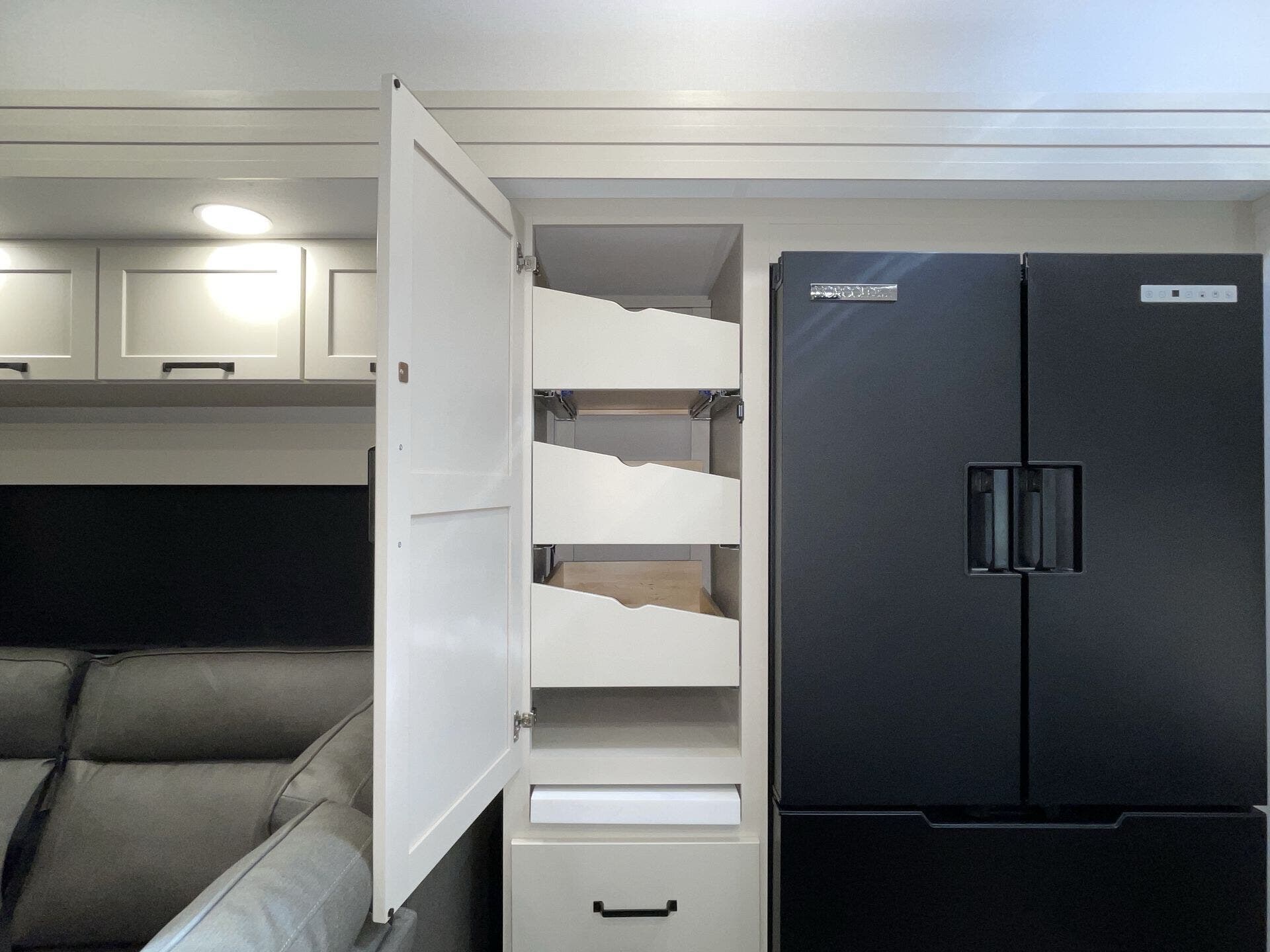 Slide-outs truly open up the kitchen and living area so you’re not bumping elbows while cooking or hanging out. The kitchen itself is spacious with an island that gives you real prep space and storage — not just a corner to heat and eat. The big fridge and practical layout make it easy to cook real meals on the road, not just reheat.