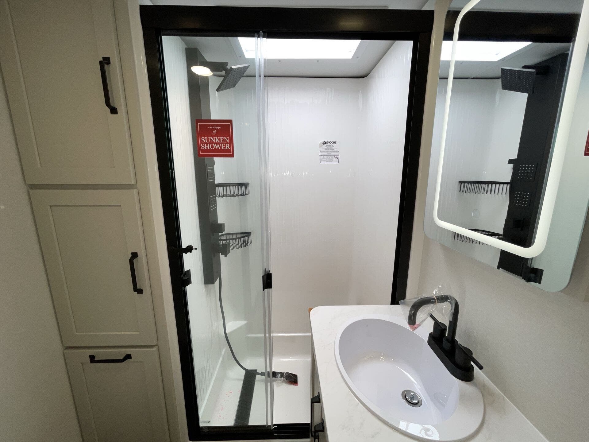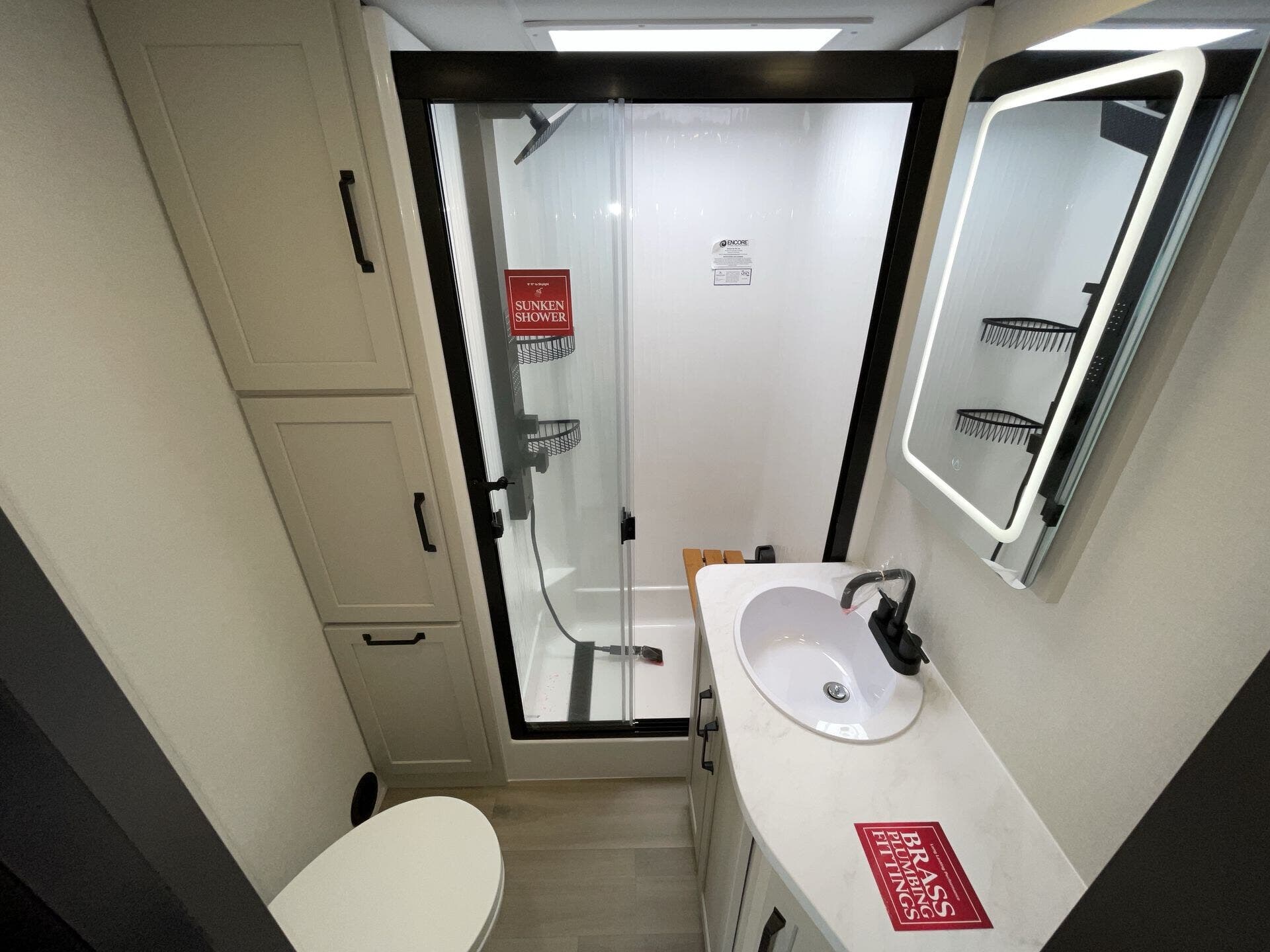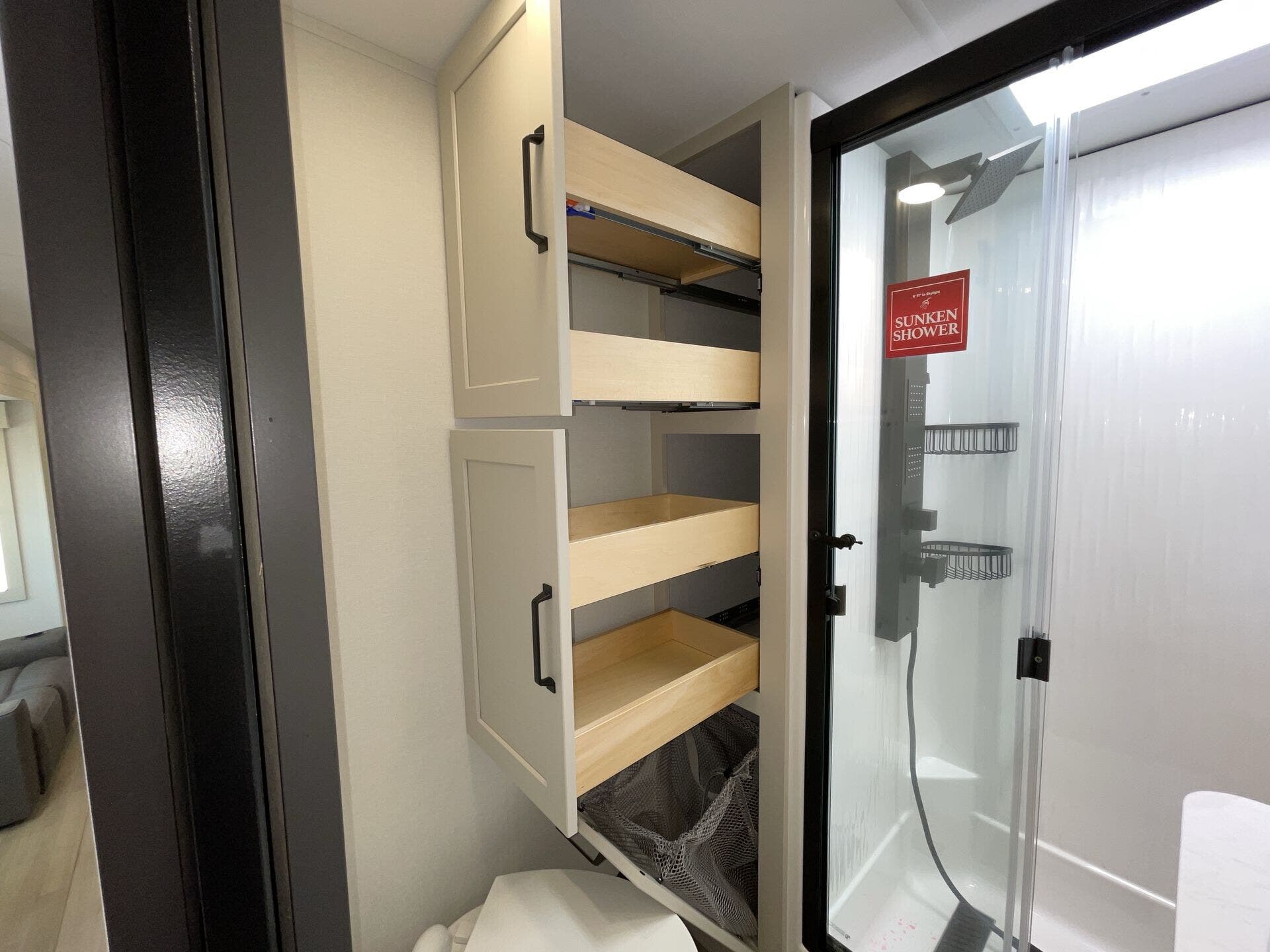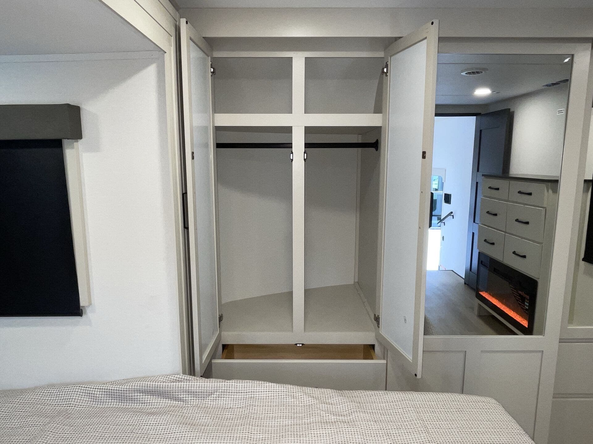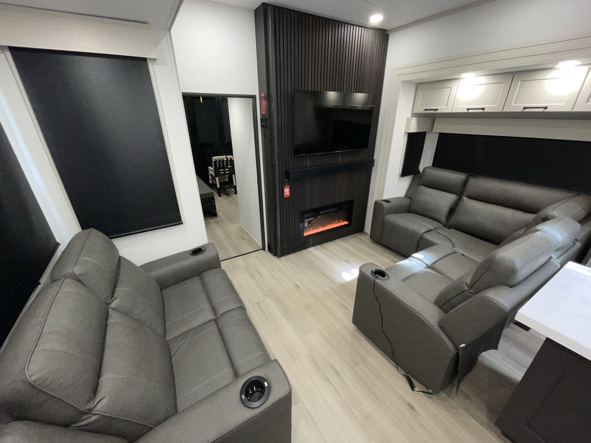 Day/Night Shades, Dinette, Fireplace, Glass Shower Door, King Size Bed, Kitchen Sink, Medicine Cabinet, Overhead Cabinetry, Pantry, Roof Vents, Shower, Solid Surface Countertops, Theater Seating, Toilet, Two Full Baths, Wardrobe(s)