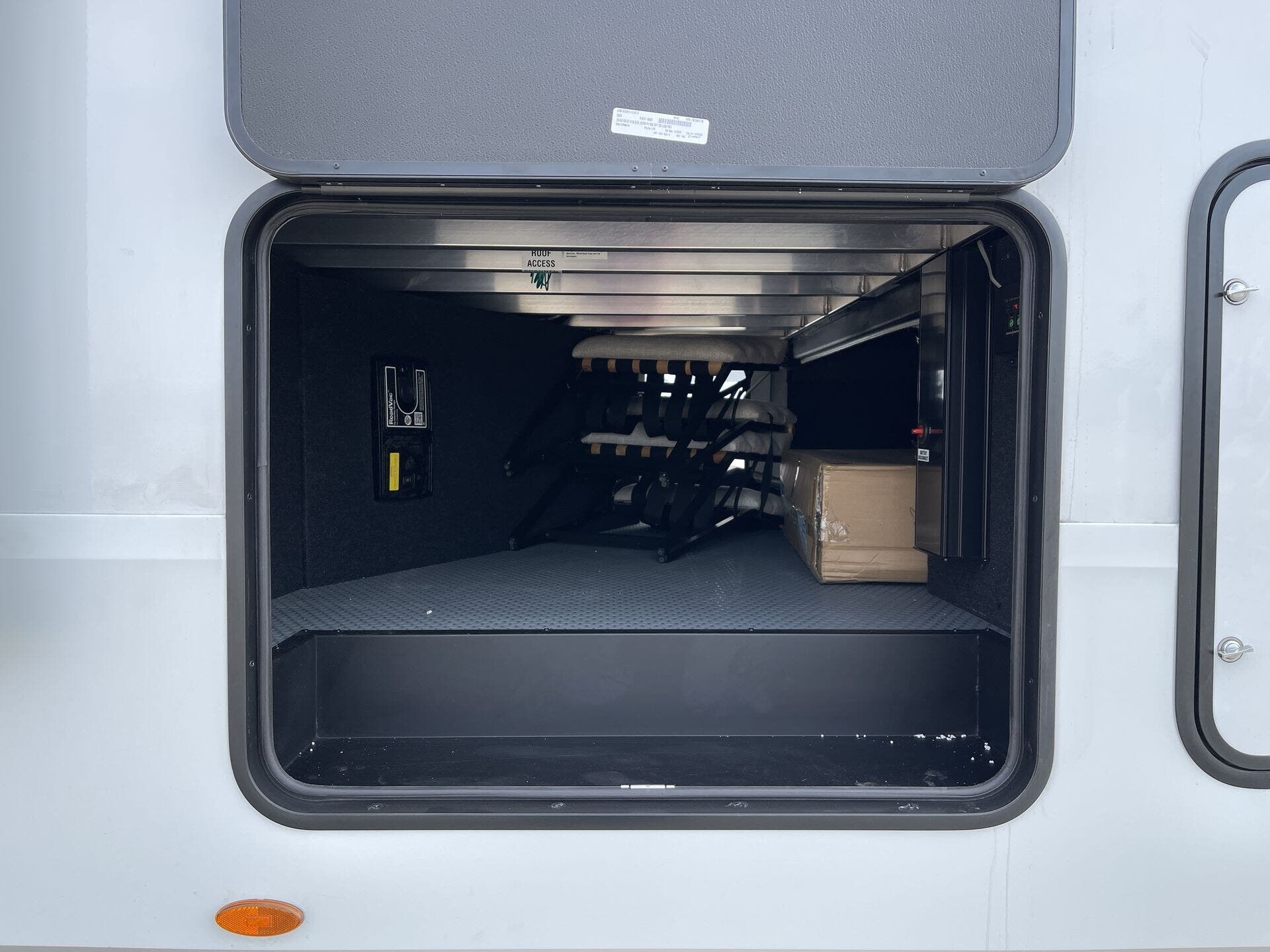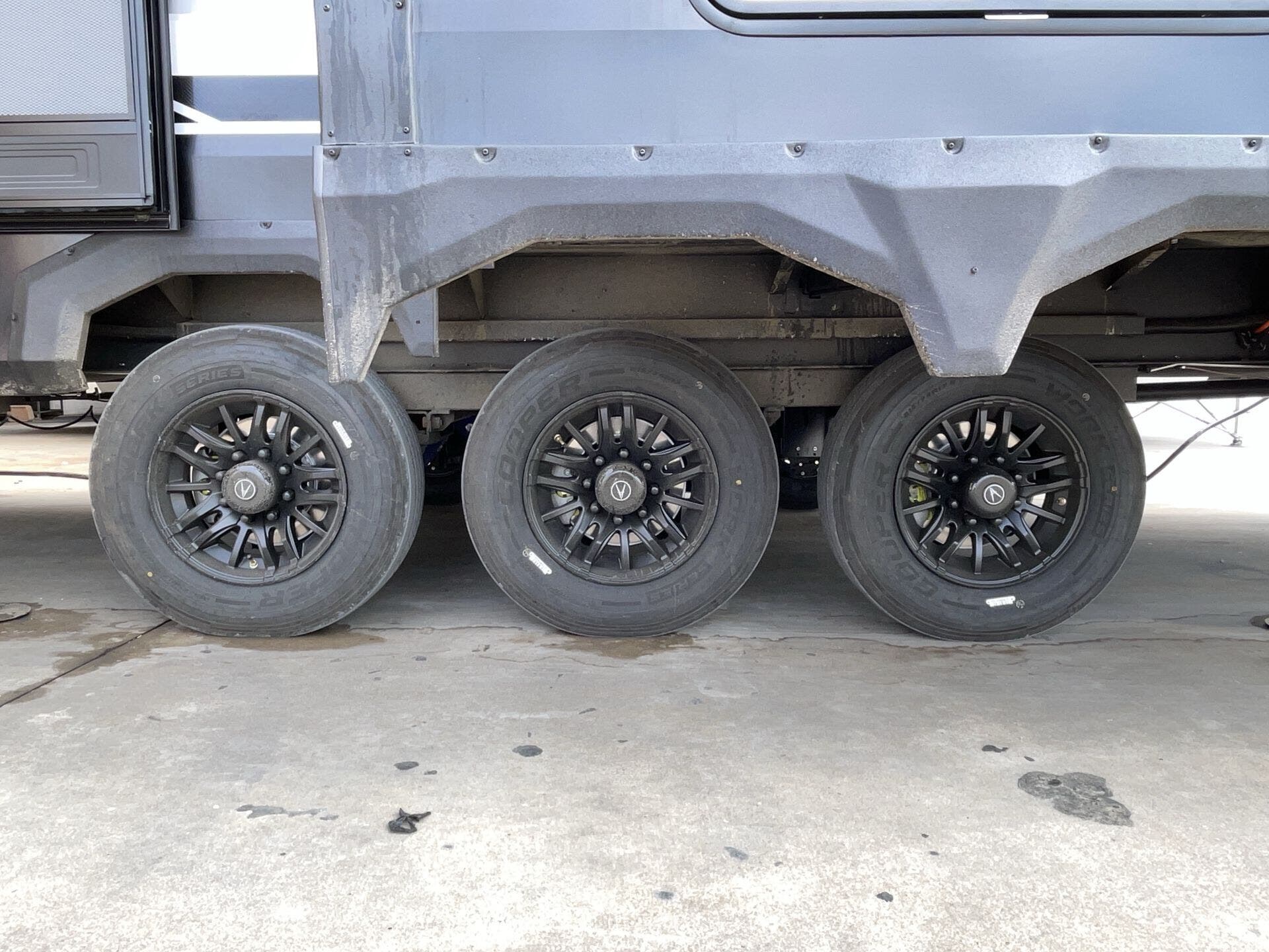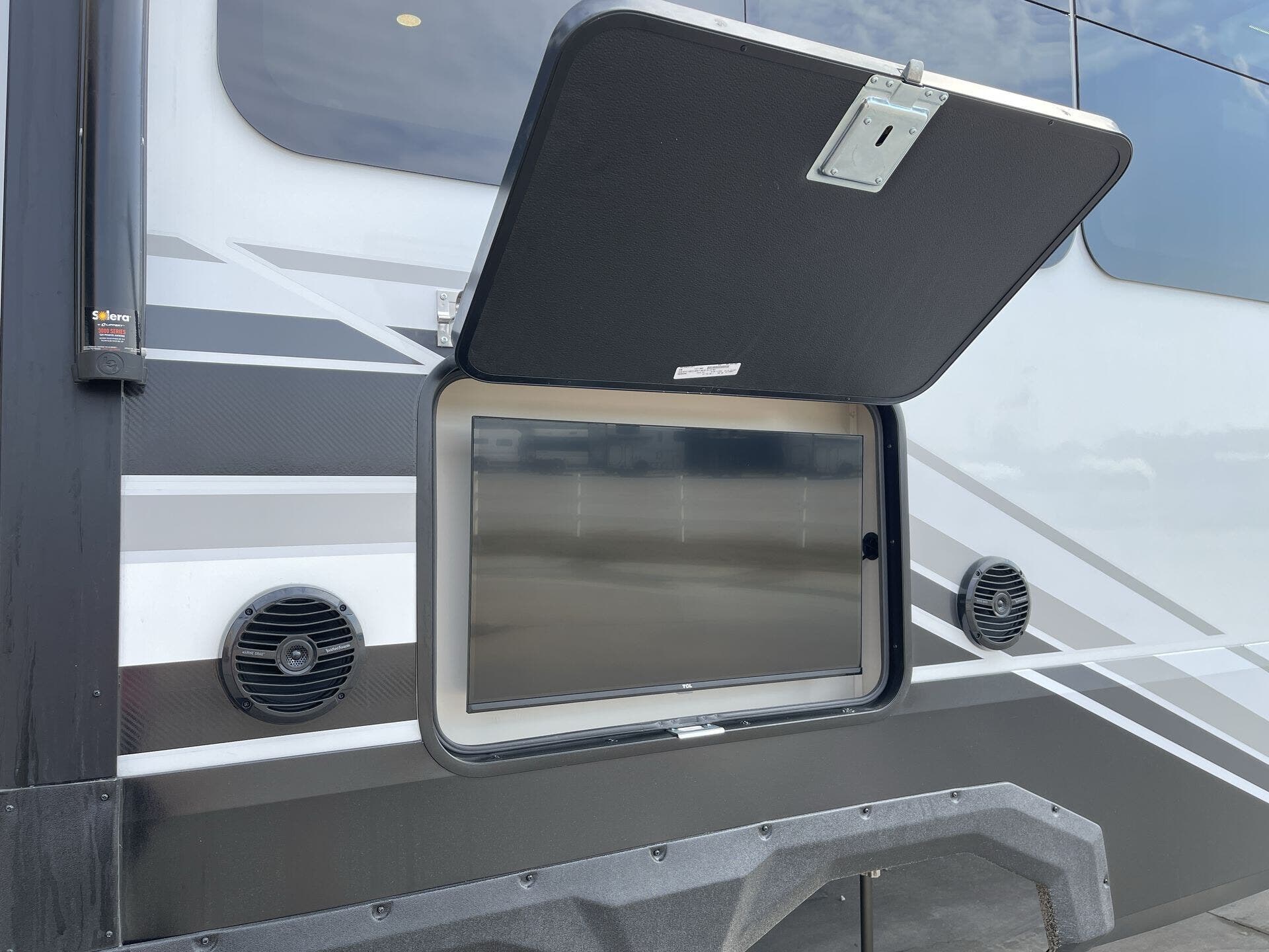 Awning, Black Tank Flush, Detachable Power Cord, Enclosed Underbelly, External Shower, Heated Underbelly, Hitch, Ladder, Leveling Jacks, Mor-Ryde Suspension, Outside Entertainment Center, Pass Thru Storage, Power Awning, Rear Ramp Door, Roof Vent, Screen Door, Second Roof A/C, Slam Latch Baggage Doors, Slideout, Spare Tire Kit, Tinted Windows -