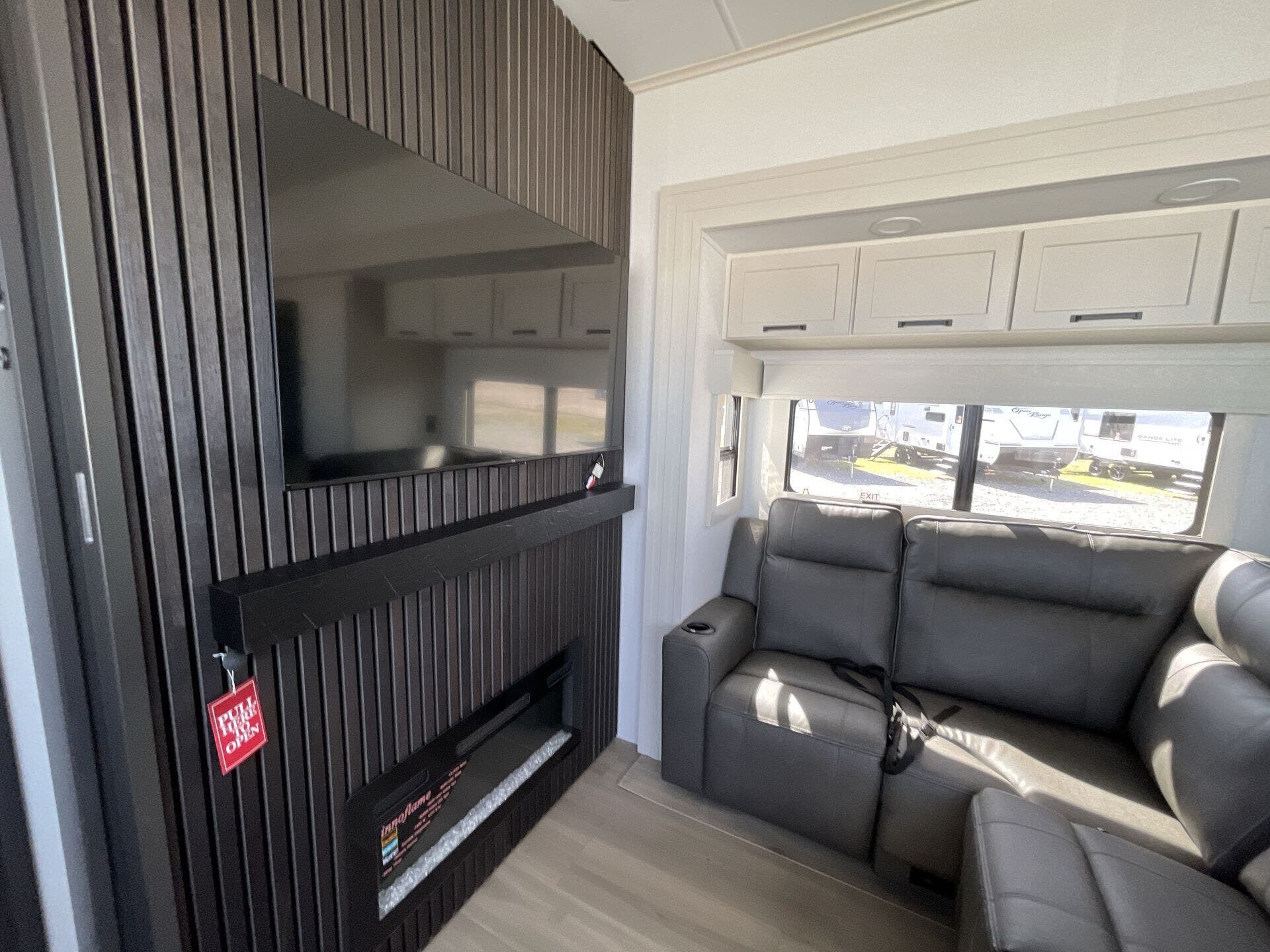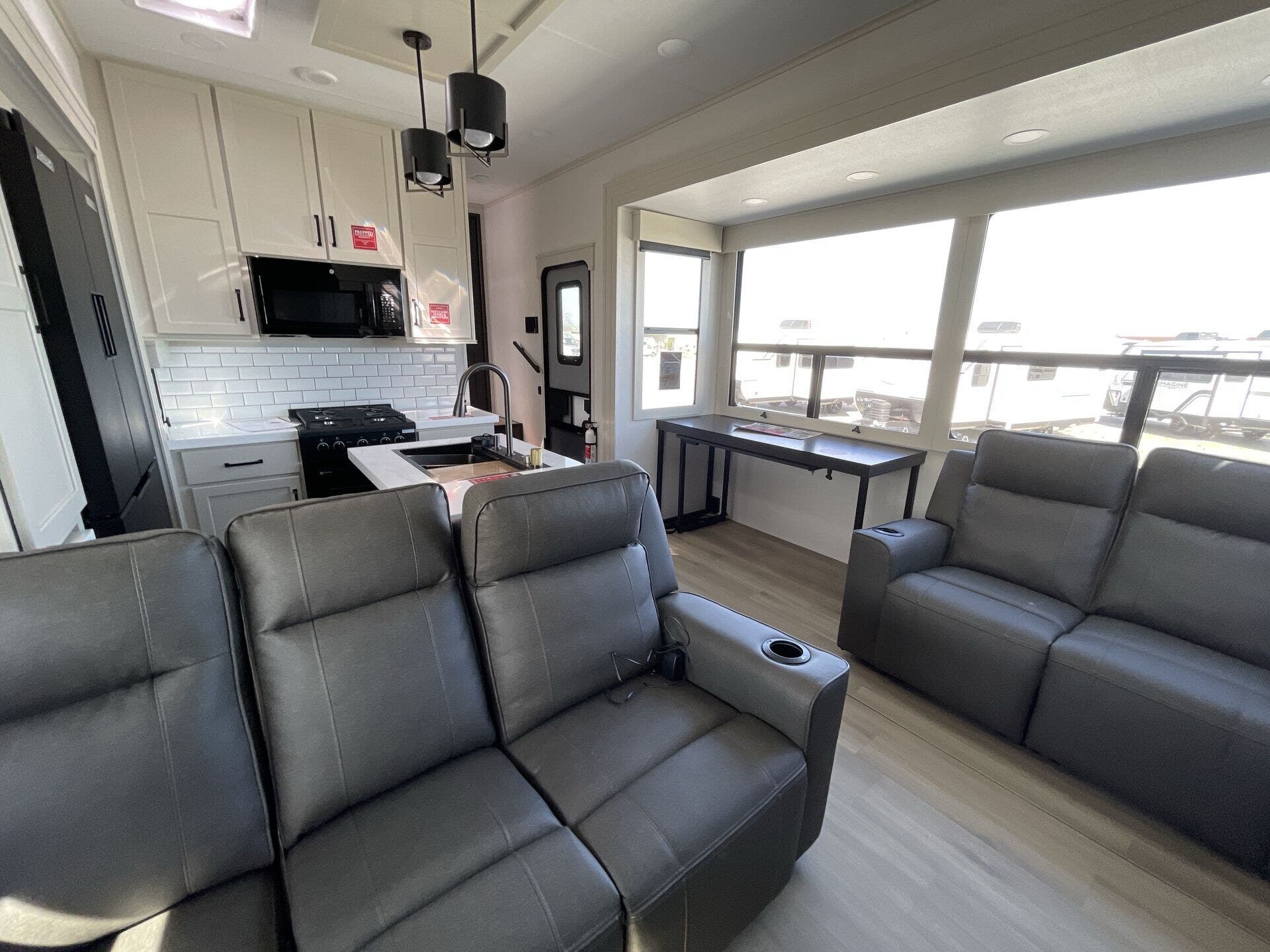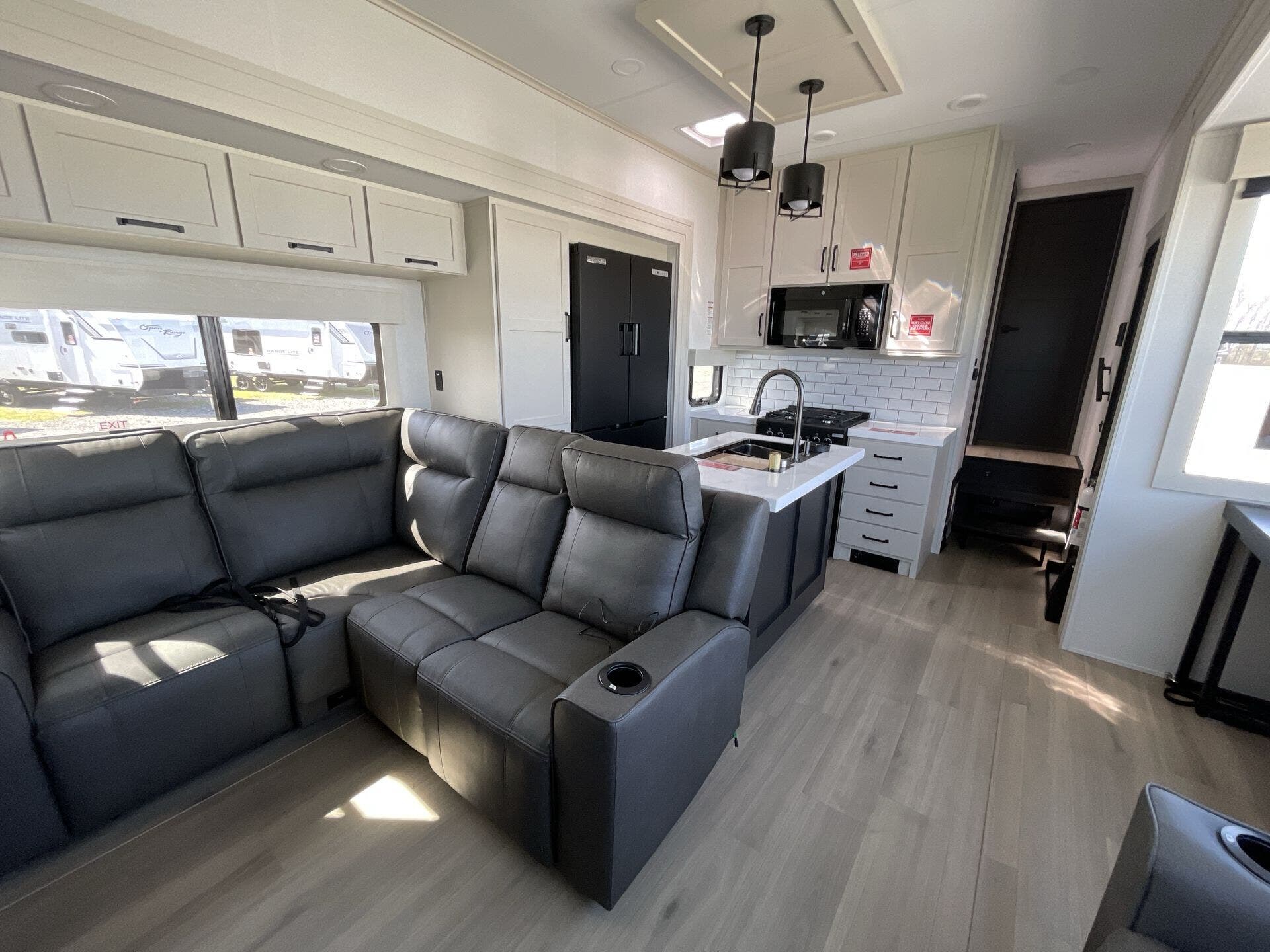Inside, the 396DB offers a smart and open layout that blends functionality with luxury. The rear garage area converts into additional living or sleeping space, while the main living area features plush theater seating, a sleeper sofa, and an entertainment center for relaxing evenings. The gourmet kitchen is fully equipped with solid-surface countertops, a center island, stainless steel appliances, and ample cabinetry, providing everything you need to cook, entertain, and enjoy life on the road. Large windows flood the interior with natural light, creating an inviting and spacious atmosphere.