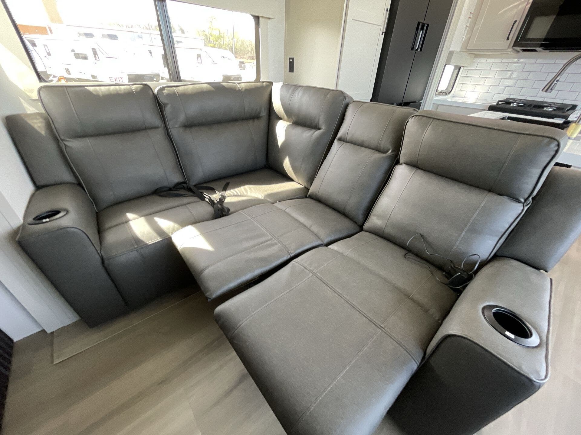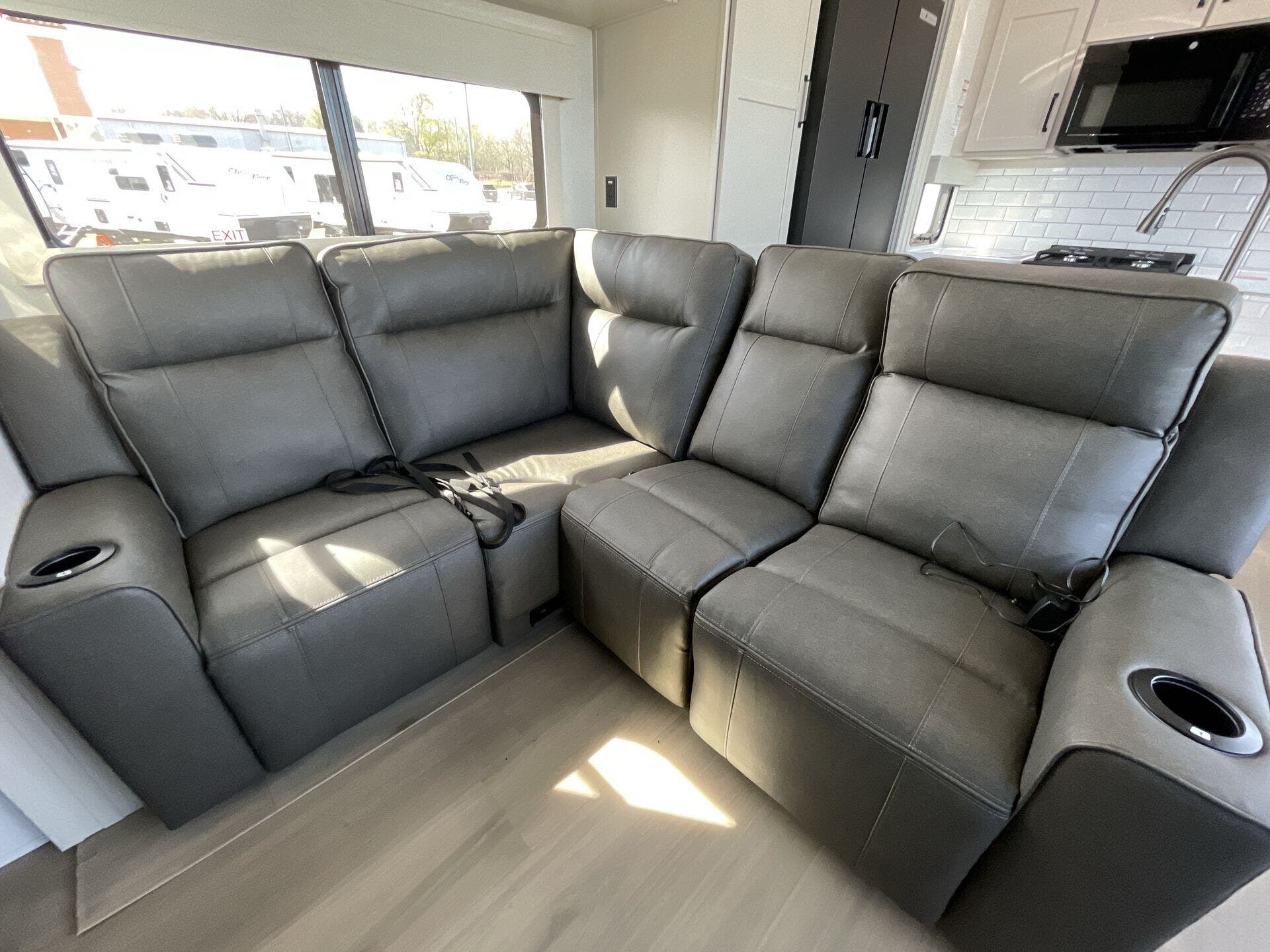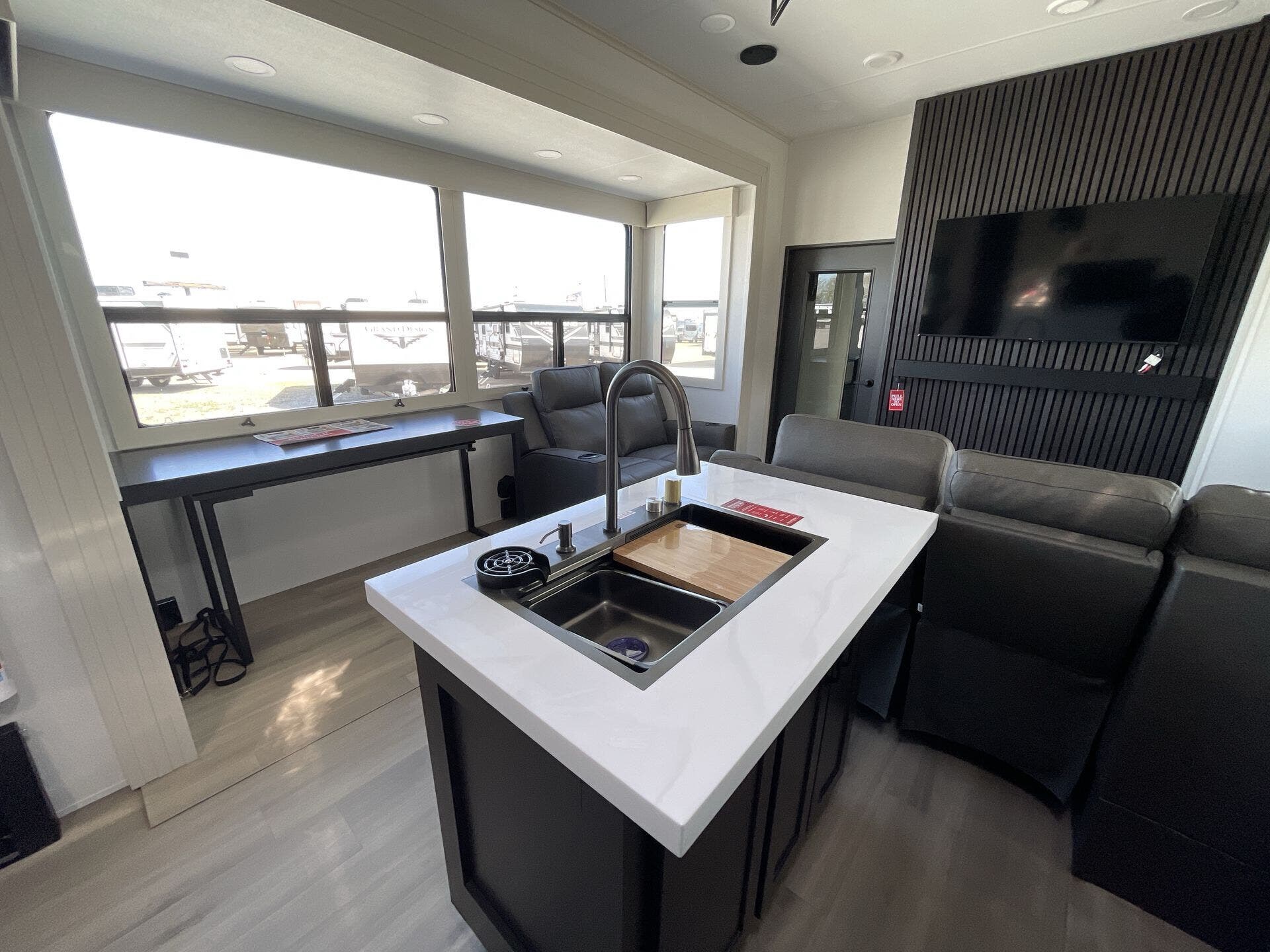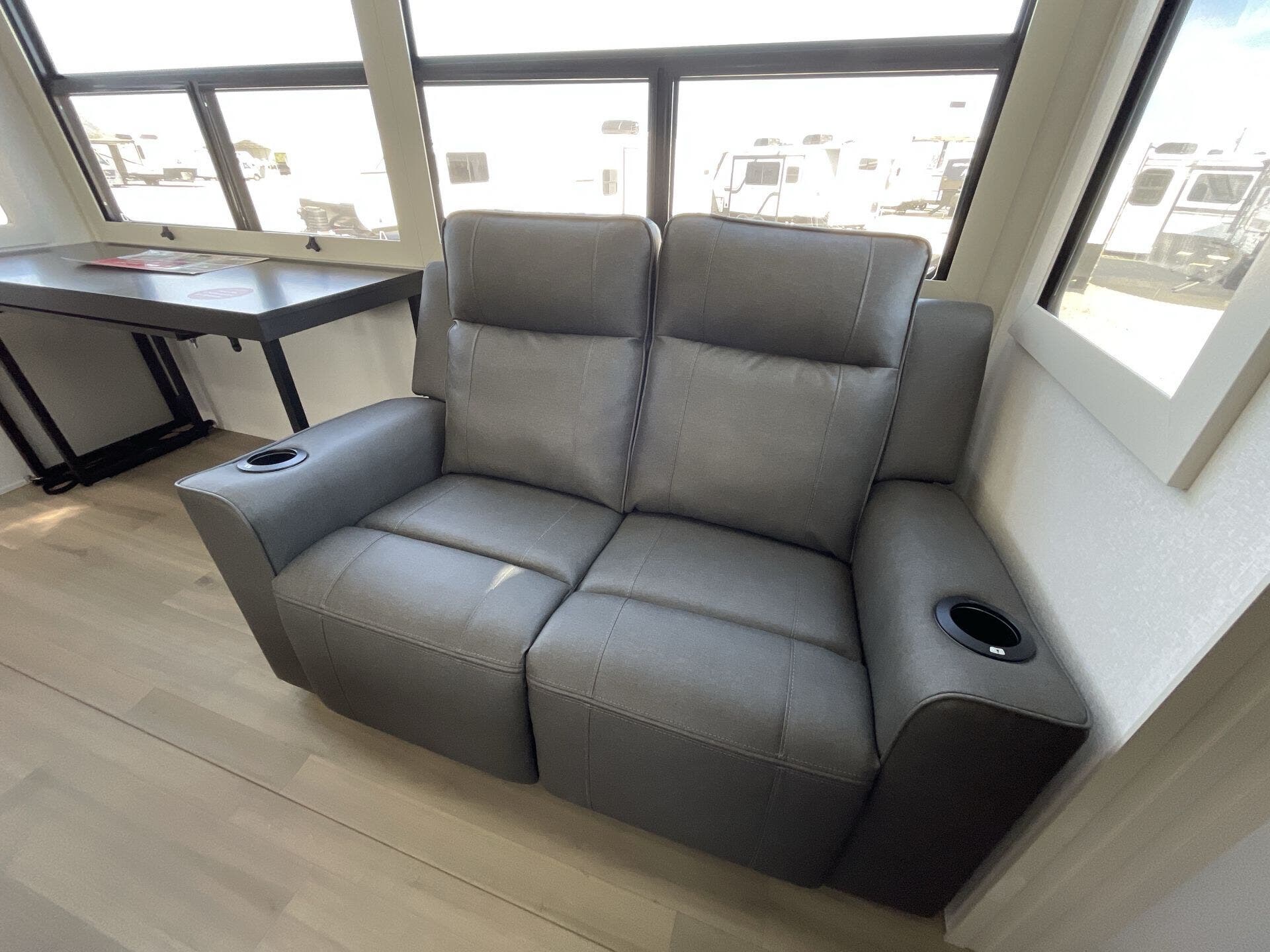 Inside, the 396DB offers a smart and open layout that blends functionality with luxury. The rear garage area converts into additional living or sleeping space, while the main living area features plush theater seating, a sleeper sofa, and an entertainment center for relaxing evenings. The gourmet kitchen is fully equipped with solid-surface countertops, a center island, stainless steel appliances, and ample cabinetry, providing everything you need to cook, entertain, and enjoy life on the road. Large windows flood the interior with natural light, creating an inviting and spacious atmosphere.