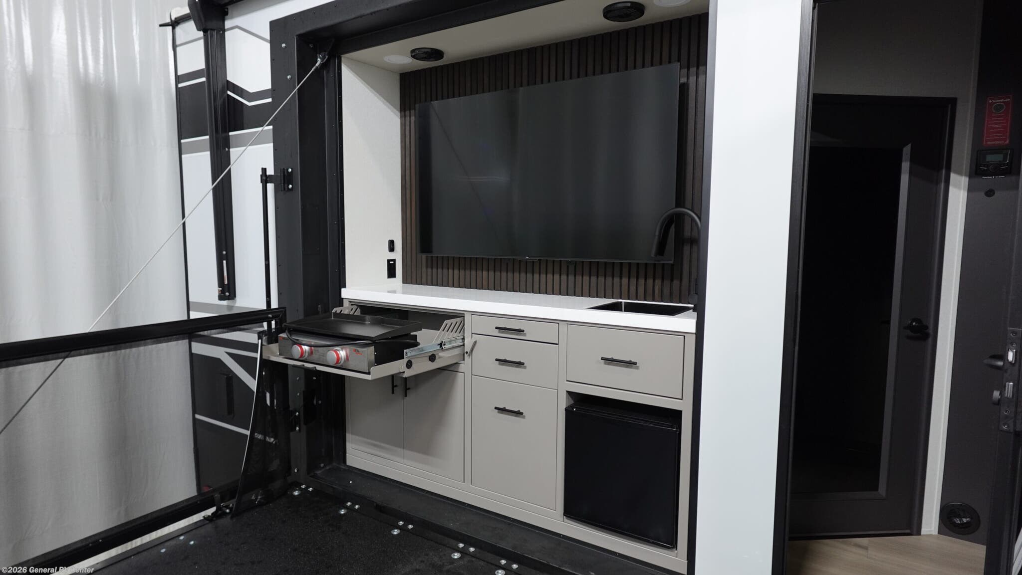 **Grand Design Momentum fifth wheel toy hauler 399M highlights:** * Front Private Bedroom * Kitchen Island * Hybrid Desk/Dinette * Unobstructed Pass-Thru Storage * Side Patio This toy hauler has all the comfort and convenience you could ask for! Once you have unloaded your toys from the 12' 6" separate garage, you can start lunch on the exterior griddle located by the side patio. There is also a 65" TV here and a 1.7 cu. ft. refrigerator to entertain guests! If the weather isn't cooperating, you can make meals in the fully equipped interior kitchen, complete with an island, pantry, pull-out countertop extension and more. An L-shaped sofa with recliners is in perfect view of the 50" TV and fireplace, and there is even a hybrid desk/dinette with windows where you can get some work done if needed. Head towards the front to freshen up in the full bath before heading to bed in the private bedroom. Here, you'll find a queen bed slide out with an optional king bed, a large closet with washer and dryer prep, plus a dresser with TV prep if you want the option to watch movies in bed! The Momentum fifth wheel toy haulers by Grand Design are built for four seasons of travel with your off-road toys and include luxurious accommodations throughout for extreme living! Each is constructed to a superior standard with the fully enclosed and heated underbelly and storage area, the 5-sided aluminum cage, and the triple insulated garage floor. The MORryde CRE3000 suspension system and rubber pin box, plus the upgraded axle hangers provide the performance and smooth towing you desire, while the interior offers luxury such as color changing LED accent lighting, hardwood cabinet doors with hidden hinges, and a central vacuum system. Each toy hauler also includes four packages, including the Garage Package with Tuff-Ply gas and oil-resistant flooring, the Weather-Tek Package with a Stealth AC System, and the Interior Luxury Package with solid surface countertops!