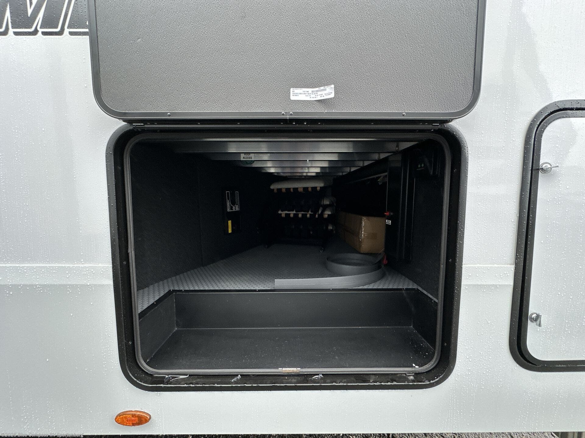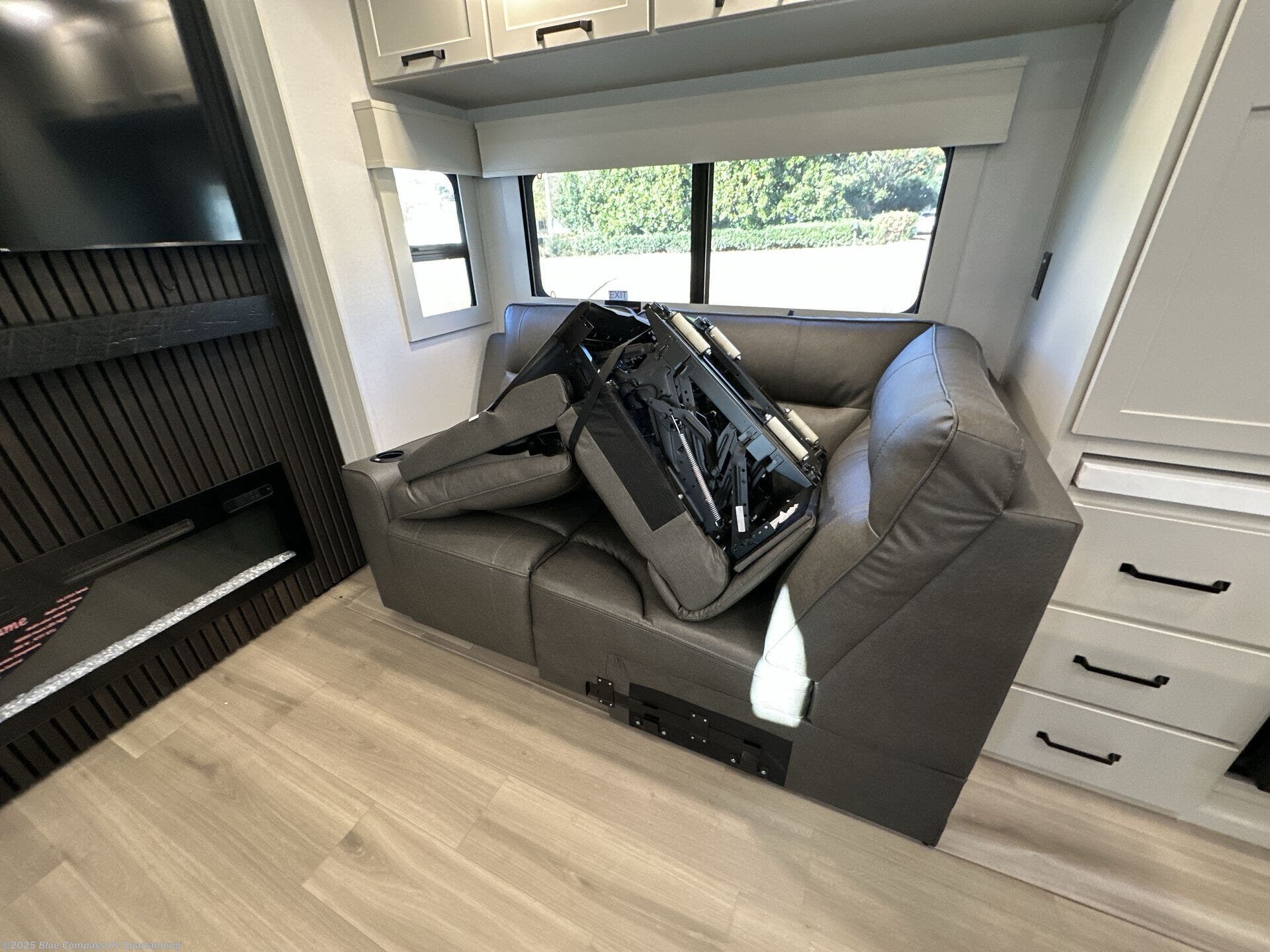 This toy hauler has all the comfort and convenience you could ask for! Once you have unloaded your toys from the 12' 6" separate garage, you can start lunch on the exterior griddle located by the side patio. There is also a 65" TV here and a 1.7 cu. ft. refrigerator to entertain guests! And if you have guests staying over, you can choose to add the optional Liftsuite system with underside can lights in the garage. If the weather isn't cooperating, you can make meals in the fully equipped interior kitchen, complete with an island, pantry, pull-out countertop extension and more. An L-shaped sofa with recliners is in perfect view of the 50" TV and fireplace, and there is even a hybrid desk/dinette with windows where you can get some work done if needed. Head towards the front to freshen up in the full bath before heading to bed in the private bedroom. Here, you'll find a queen bed slide out with an optional king bed, a large closet with washer and dryer prep, plus a dresser with TV prep if you want the option to watch movies in bed!