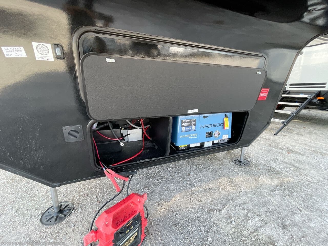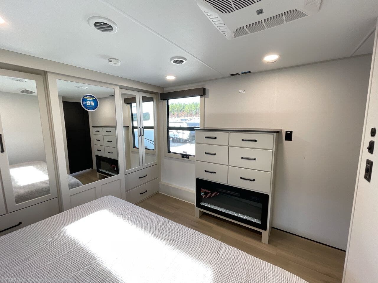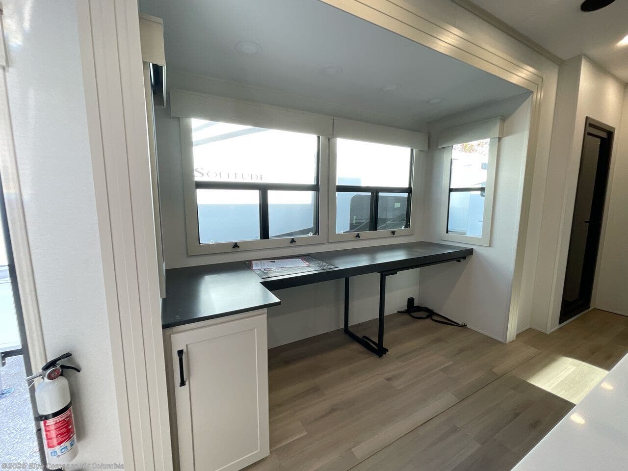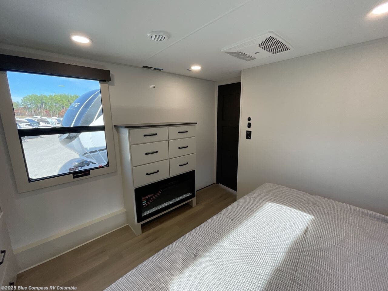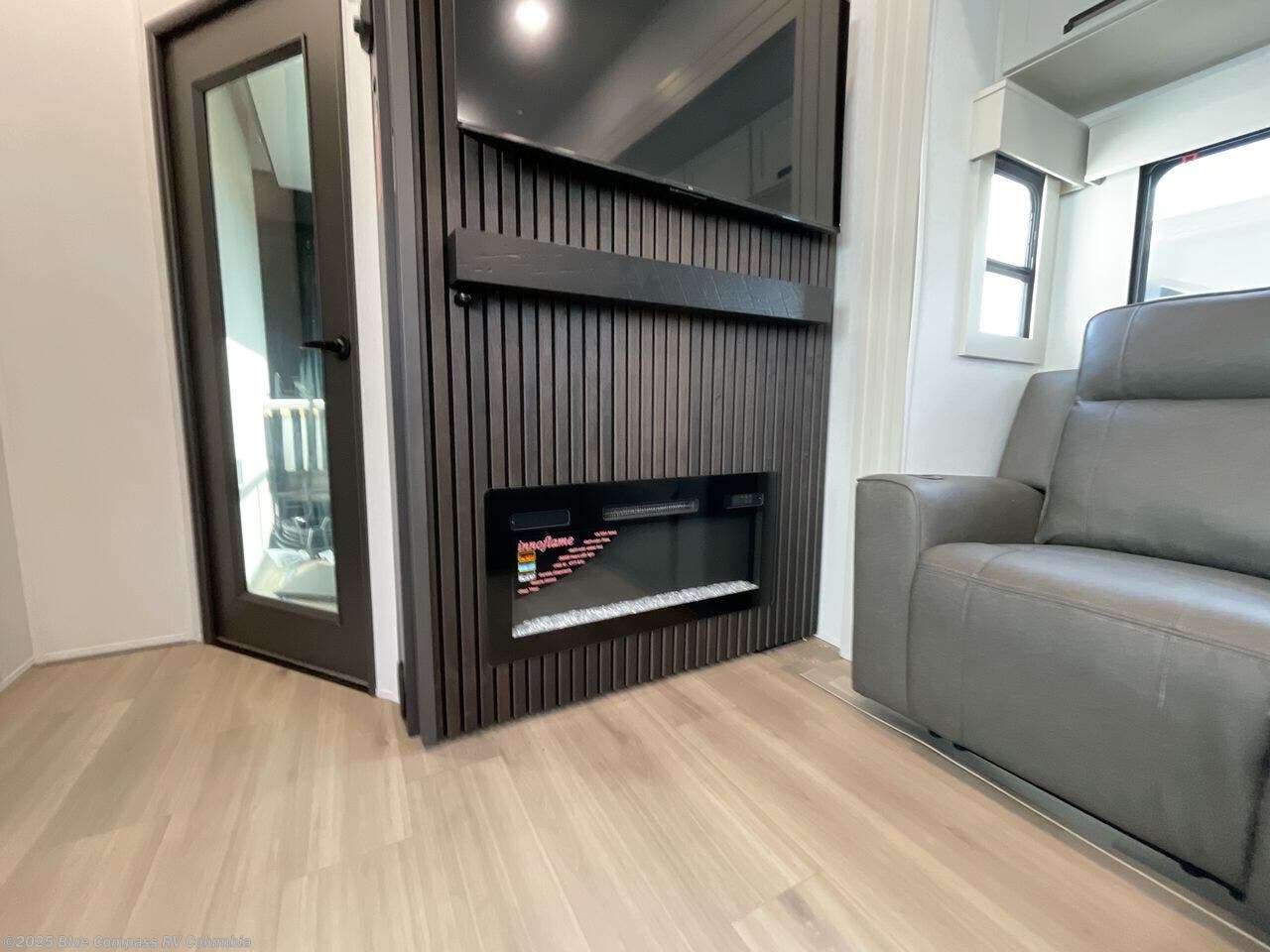 This toy hauler has all the comfort and convenience you could ask for! Once you have unloaded your toys from the 12' 6" separate garage, you can start lunch on the exterior griddle located by the side patio. There is also a 65" TV here and a 1.7 cu. ft. refrigerator to entertain guests! And if you have guests staying over, you can choose to add the optional Liftsuite system with underside can lights in the garage. If the weather isn't cooperating, you can make meals in the fully equipped interior kitchen, complete with an island, pantry, pull-out countertop extension and more. An L-shaped sofa with recliners is in perfect view of the 50" TV and fireplace, and there is even a hybrid desk/dinette with windows where you can get some work done if needed. Head towards the front to freshen up in the full bath before heading to bed in the private bedroom. Here, you'll find a queen bed slide out with an optional king bed, a large closet with washer and dryer prep, plus a dresser with TV prep if you want the option to watch movies in bed!