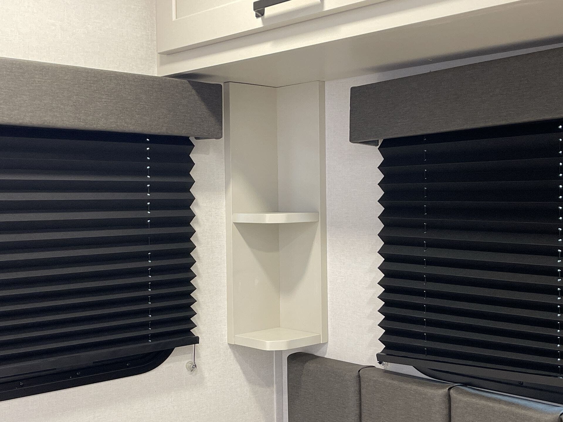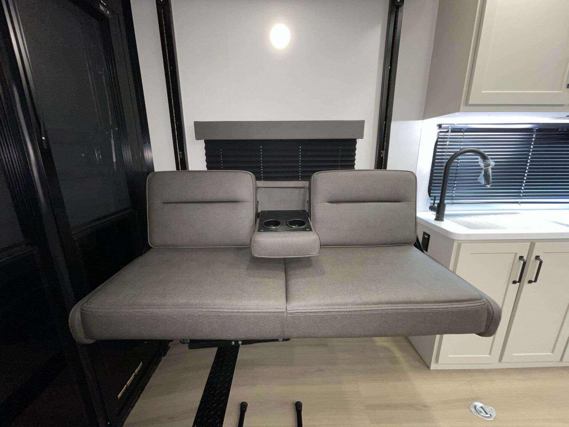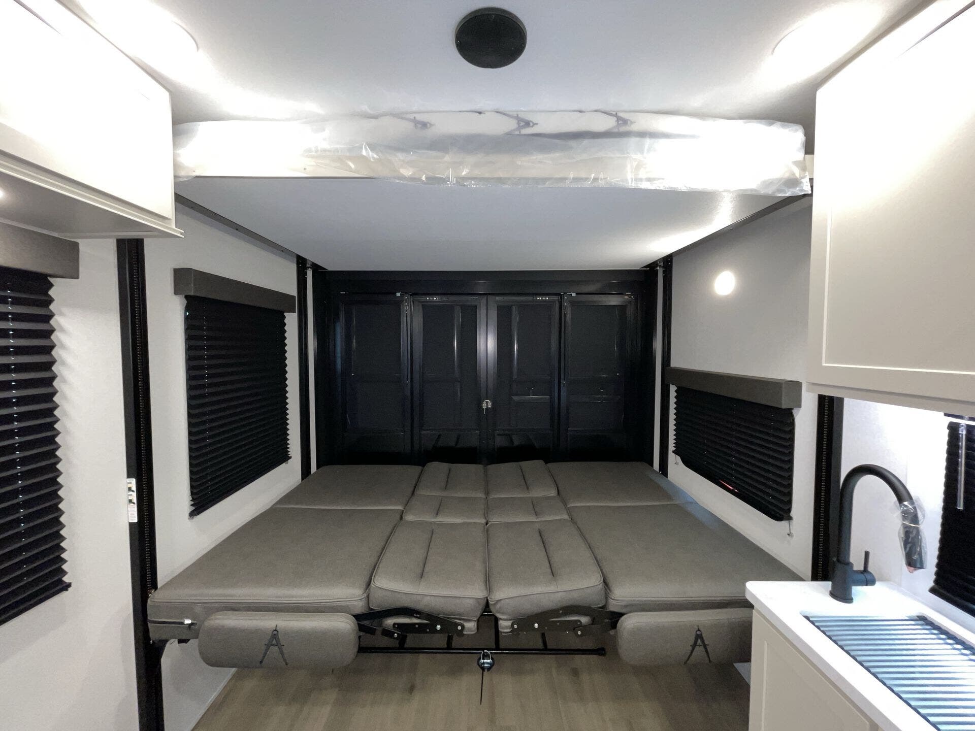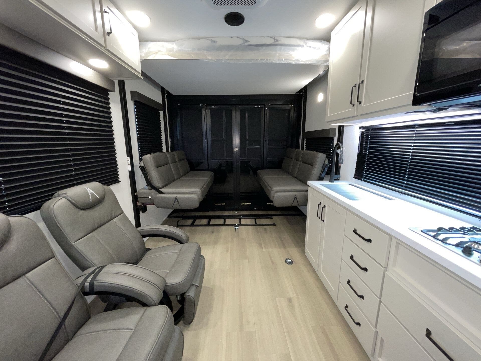 Inside, the smart floorplan combines comfort and flexibility. The garage area easily converts into a living and sleeping space with HappiJac sofas, while the main living area features comfortable seating and large windows that bring in natural light. The kitchen is fully equipped with modern appliances and ample storage, making it easy to cook wherever your travels take you.