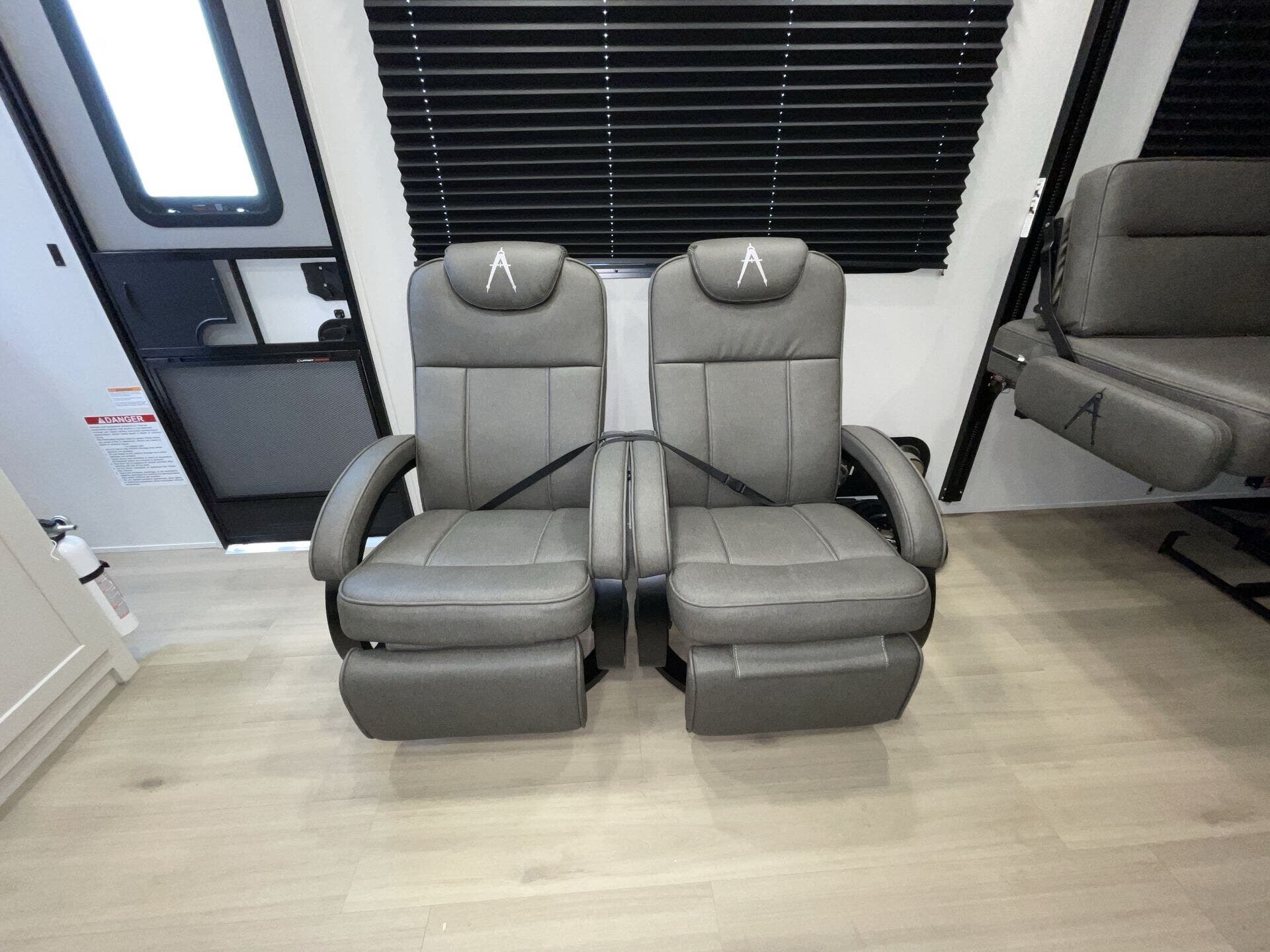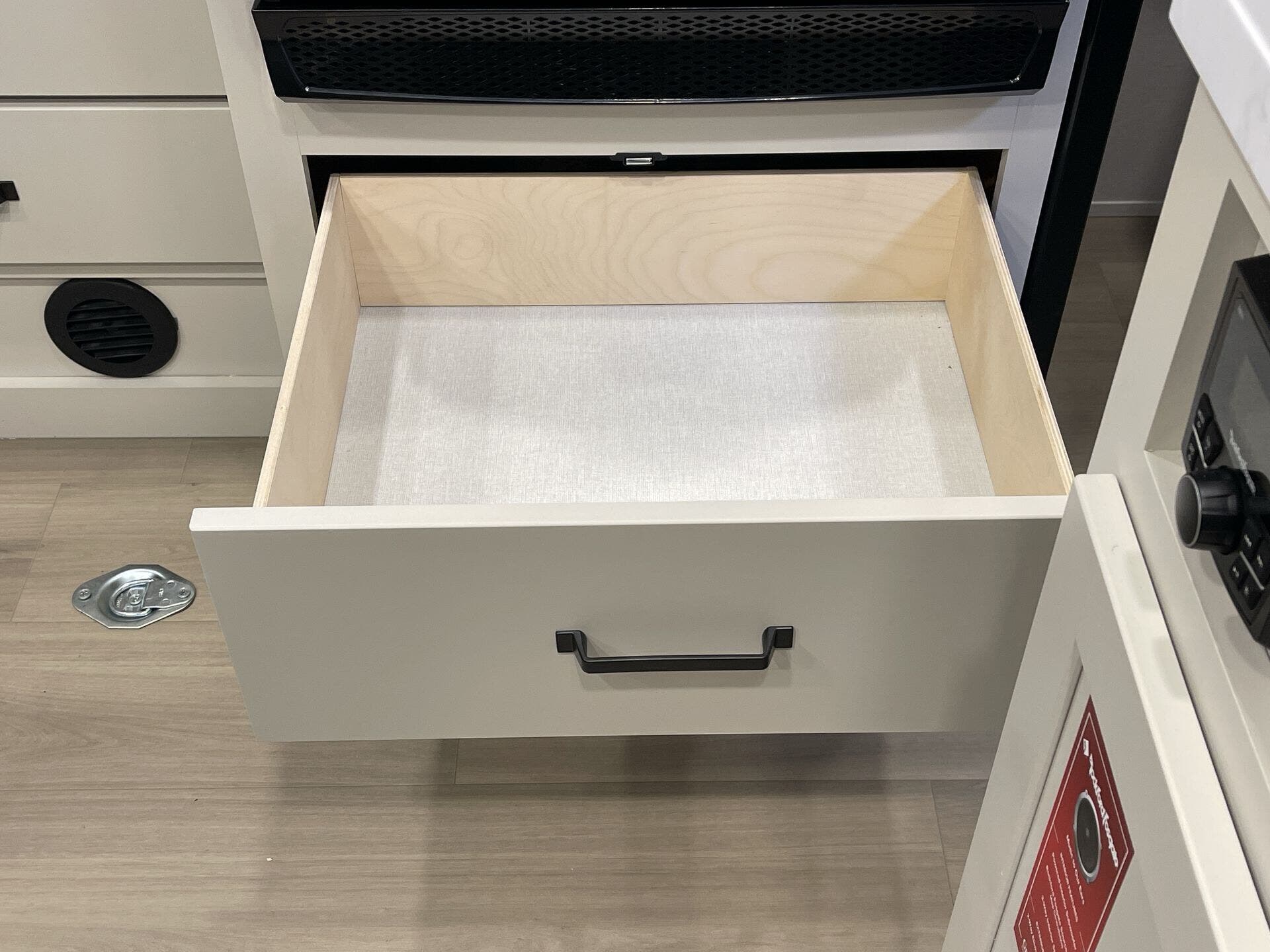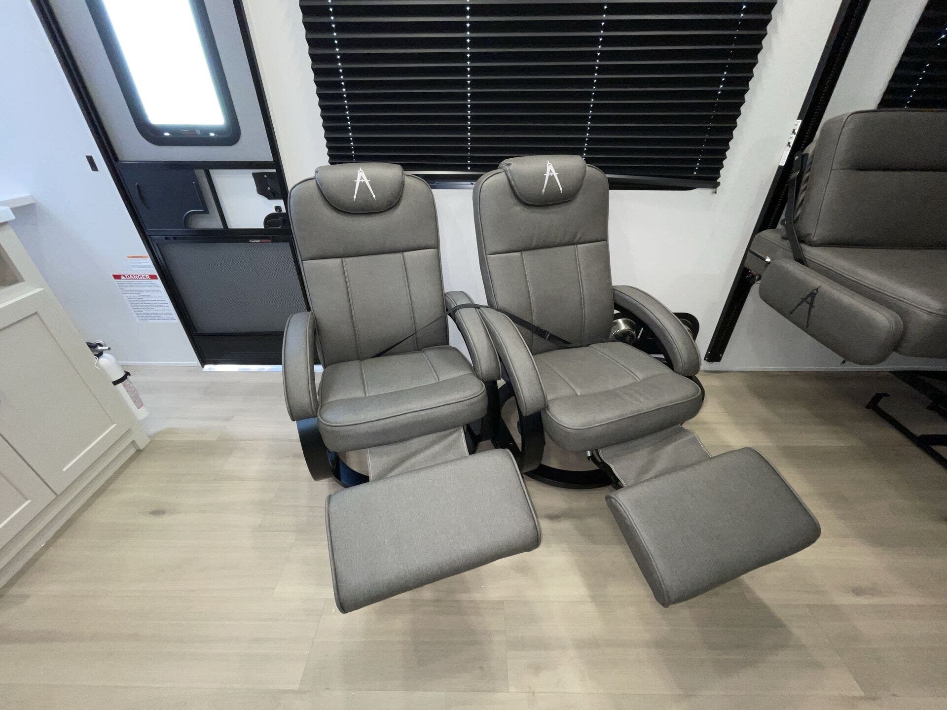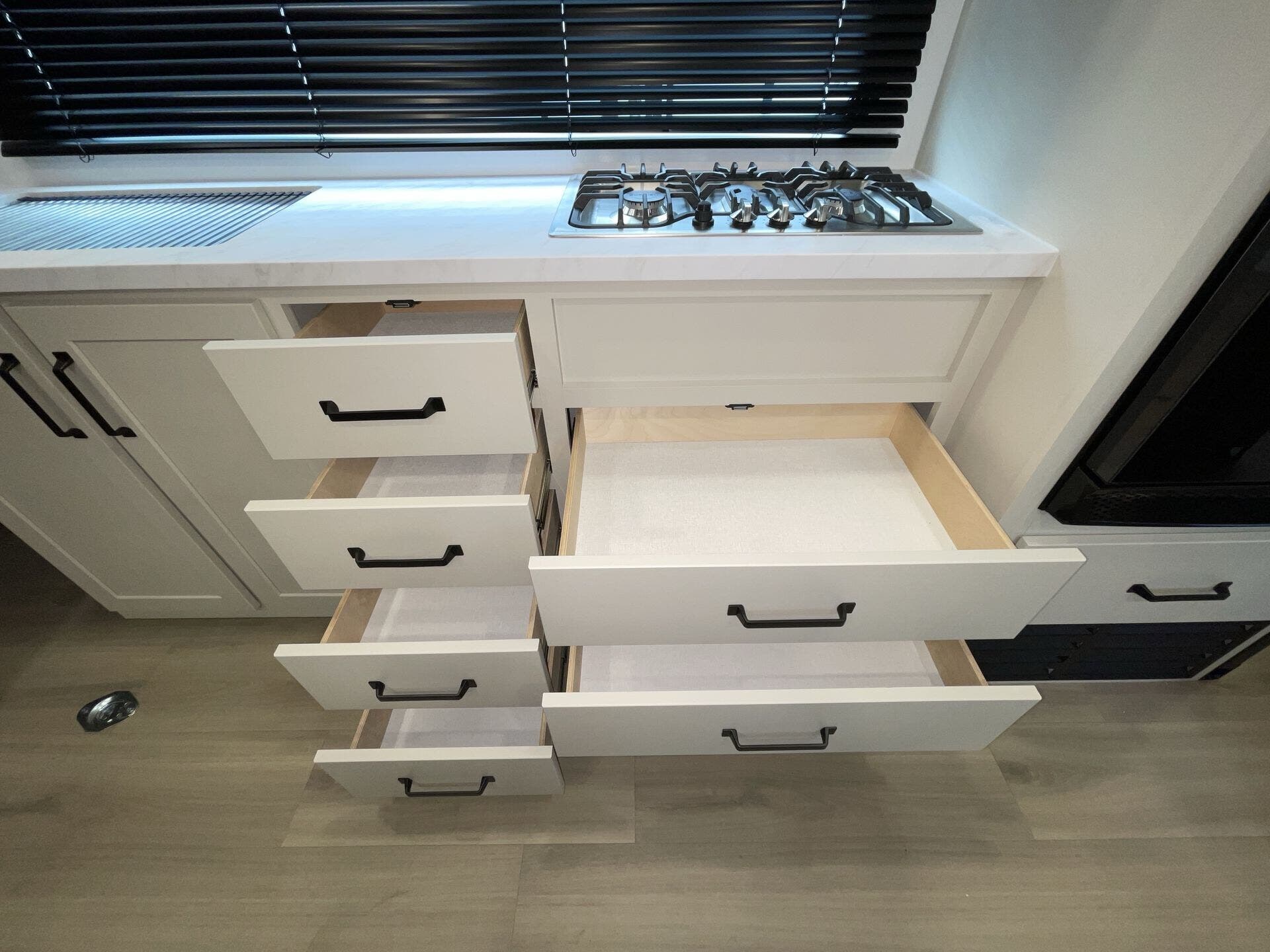 Inside, the smart floorplan combines comfort and flexibility. The garage area easily converts into a living and sleeping space with HappiJac sofas, while the main living area features comfortable seating and large windows that bring in natural light. The kitchen is fully equipped with modern appliances and ample storage, making it easy to cook wherever your travels take you.